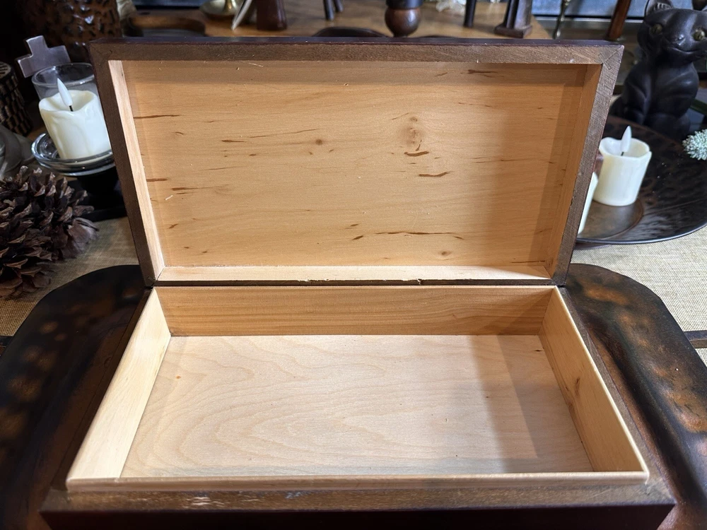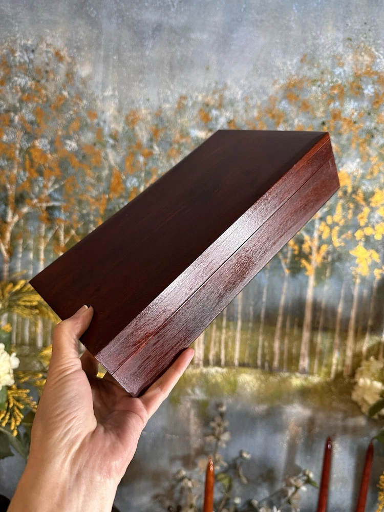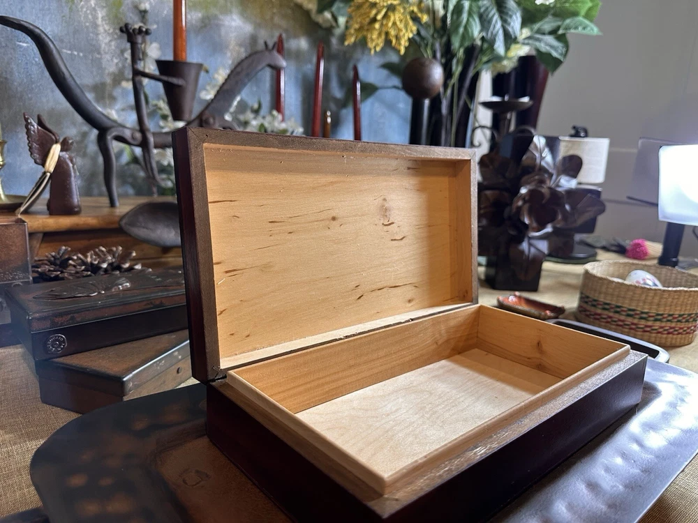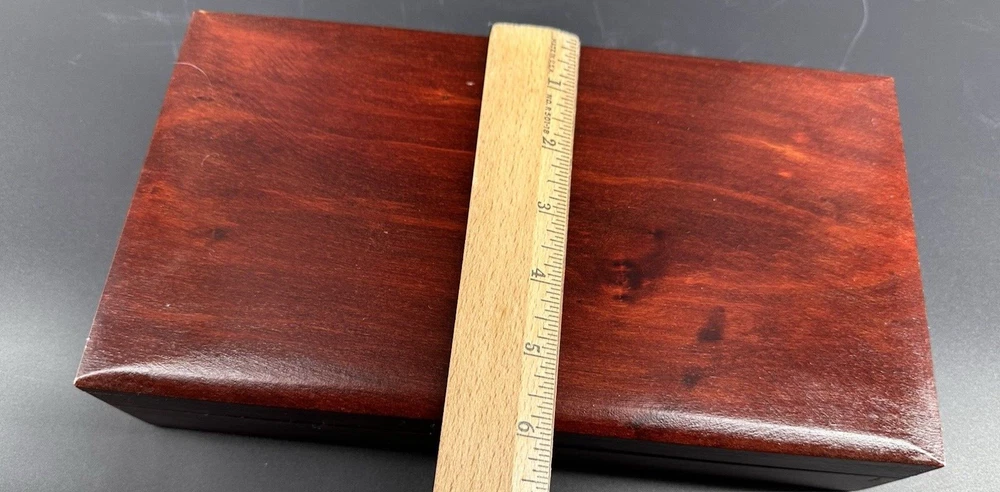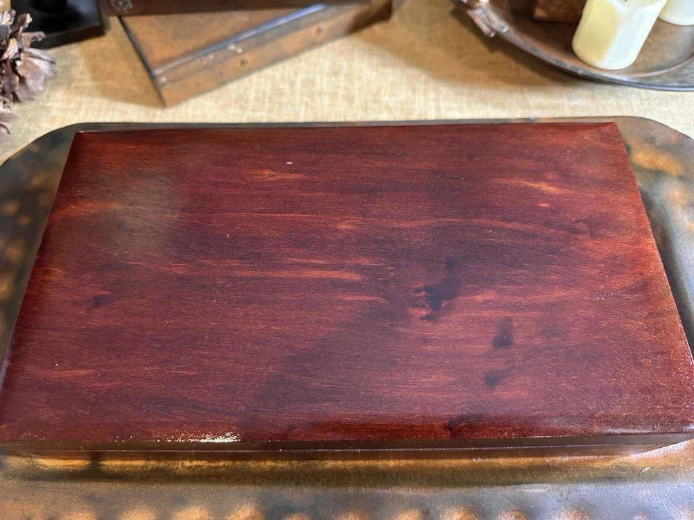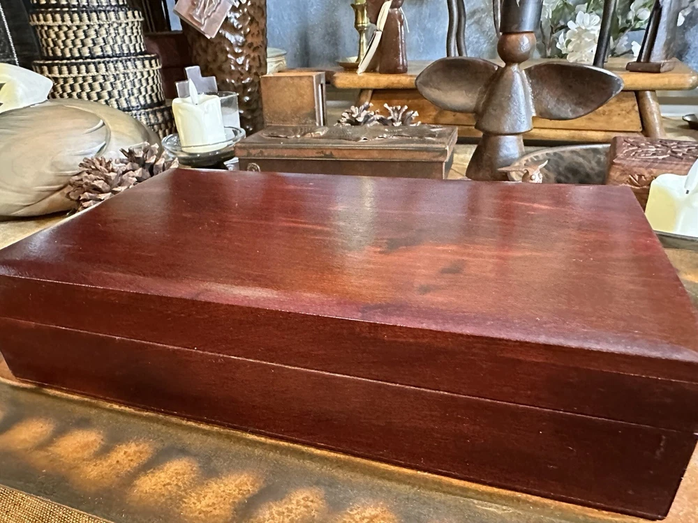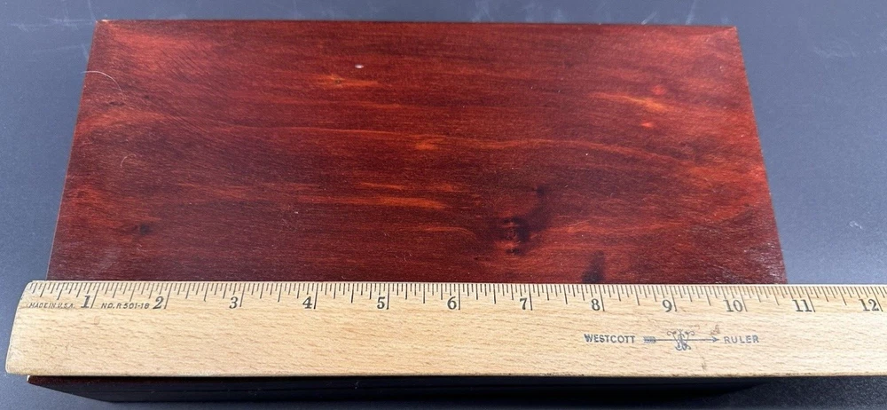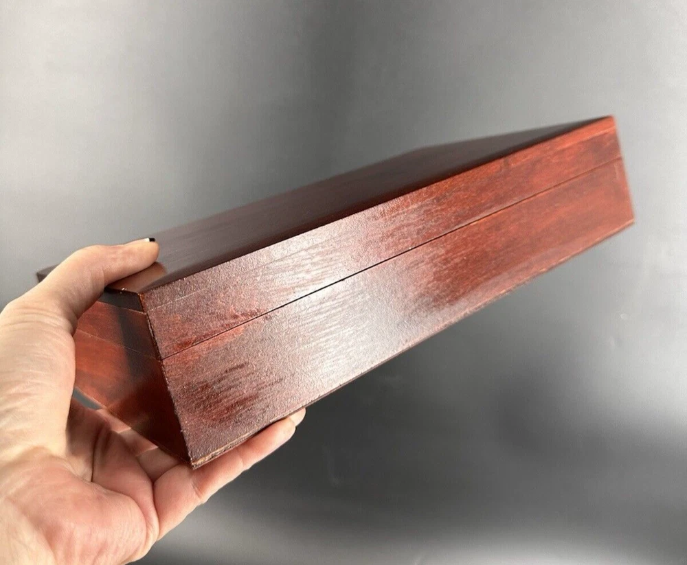 SEE VIDEO to appreciate how beautiful the color of this (made in) Poland wood box is! Original "Made in Poland" sticker on bottom. This piece is a vintage piece made approximately in the 60''s and is in very good vintage condition. This handcrafted wood box from Poland measures 11 inches in length, 6 inches in width, and 3 inches in height, with a square shape and a cherry wood color finish. It features a mid-century modern style, making it suitable for any room as a decorative piece or for storing keepsakes. The box has a (2) hinged closure. This unique piece is perfect for adults who appreciate vintage craftsmanship and MCMl-themed decor from the 1960s. I have taken pictures of all sides to show you just how good of condition that it is in. You may see other items in the background, as well. If you are new here, those other items that you may see will be placed in my Ebay shop either this week or next week. So, you will get a sneak peak of what is coming up next! Here is my Ebay shop: YouBeYou LLC If you have any questions even after you have purchased the item --- I am here for you to answer any questions that you may have! I strive to work diligently with every buyer to ensure they are a satisfied buyer, so please contact me anytime. This is a pre-owned item and I take great care to accurately describe the item but please see the pictures for full details. While we do our best to list every item in detail, these are vintage and pre-owned items, and some flaws are to be expected. Please see all photos/ video as they are a large part of the description of our items. Items come from a smoke-free environment. Each item is described in accurate detail with multiple measurements and various photos at different angles front and back, side to side, top and bottom. I have additional similar items that I have yet to list that you may be interested in. Feel free to follow my store ( YouBeYou LLC ) to see those when posted. Please see all photos/ video as they are a large part of the description of our items. I strive to make every purchase a pleasant experience. Please feel confidence in you purchase that I'll make every effort to correct any issues that may arise. If used, there are always some signs of wear -- well, because it is used, vintage, or antique. Most items are used -- Each item is inspected for quality. It is very important to us that you have a happy Ebay experience! Thank you for supporting a small business like ours! (Note: pictures may include measurements, and some have a video.)
