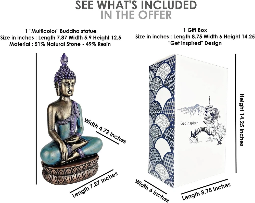 Handcrafted 12.5" Buddha Statue - Moment of Enlightenment in Sea Blue & Purple ‹ › ‹ › ‹ › ‹ › ‹ › ‹ › ‹ › ‹ › Handcrafted 12.5" Buddha Statue Moment of Enlightenment in Sea Blue & Purple TOUCH THE HEART: Immerse yourself in serenity with this stunning Buddha statue, featuring a turquoise and gold ombre Lotus artfully perched atop his head. This exquisite hand-painted finish is a rarity among statues, adding a unique touch of elegance to your space. The Bhumispharsha Mudra pose embodies the moment of enlightenment beneath the Bodhi Tree, symbolizing the profound meaning of ‘touching the earth.’ A true blend of beauty, significance, and artisan craftsmanship. HANDCRAFTED FROM STONE: Every piece in our collection is a testament to meticulous craftsmanship, taking up to 60 days to create. Crafted from solid stone and resin, this lightweight yet durable figurine has been hand-molded for strength. Each detail has been finely carved and painted by skilled artisans over two weeks, ensuring an impeccable finish that resembles luxurious bronze. SIZE & WEIGHT: Height: 12.5 inches Width: 7.9 inches Weight: 2.2 lbs This piece of spiritual décor seamlessly integrates into your home or office décor. Whether displayed in a cozy corner, as part of a serene meditation space, or enriching the visuals of a boho bedroom, this Buddha representing his moment of enlightenment perfectly aligns with your style. COLLECT THE SET: Our 'Moment of Enlightenment' statue is just the beginning. Complete your meditation art collection with other stunning pieces depicting Buddha in Dhyana Mudra and Abhaya Mudra, representing the journey before and after enlightenment. Explore the compassionate Bodhisattva – Guanyin, gracefully seated atop a stunning lotus throne, to add further depth to your spiritual art collection. GIFT BOXED AND SECURE: We’ve taken care to craft a gift box that is as beautiful as the statue itself. The Buddha statue is wrapped in soft polyfoam to safeguard its delicate paintwork and stone craftsmanship during transport, ensuring it arrives in pristine condition. Whether for yourself or as a thoughtful gift, rest assured that your investment is protected. Should you encounter any issues, our refund or replacement policy covers you. Namaste. Shipping Free & Fast Shipping - We offer free shipping to most of the USA with a normal delivery time of 3-10 businessdays. However, due to various situations, additional delivery time (up to 3 weeks) may be required for some items. Alternative Carriers - We may use alternative carriers (e.g. USPS, FedEx, UPS, etc.) to ensure your package arrives safely and on time. Due to the use of multiple carriers, we are unable to provide a tracking number automatically. Handling Time - Orders are processed and shipped within 1-5 business days of receiving cleared payment. Shipping Restrictions - Shipping to Alaska, Hawaii, Puerto Rico, Guam, and other US territories may incur shipping charges or delivery restrictions. Please contact us before ordering, or your order can be refunded/cancelled. State Restrictions - There may be restrictions based on your state of purchase. For example, certain items may not be shipped to California due to state regulations. Contact for Tracking Updates - If you require tracking updates or have any concerns about the delivery of your order, please feel free to contact us, and we will be happy to assist you. Return Please see our ebay return policy. We do not accept return on most products. This is to avoid customers mis-using ebay returns. All sales are final. Please be sure to check the return policy listed at the top of the listing. In rare cases, we may accept returns, if the buyer pays both ways shipping and 20% restocking fee. If you are un-sure of return policy of a particular item, please ask before buying. Payment We accept all major credit cards, PayPal, and Apple Pay for your convenience. Your payment information is secure and encrypted to ensure a safe and seamless transaction. Please complete your payment within 3 days of purchase to avoid any delays in shipping. Feedback Your feedback is extremely important to us. We strive to provide the best products and customer service possible. If you are satisfied with your purchase, please take a moment to leave us a positive review. If you have any concerns or issues with your order, please contact us before leaving negative feedback. We are committed to resolving any problems and ensuring your satisfaction. Contact Us If you have any questions or concerns, please feel free to reach out to our customer support team. You can contact us through the eBay messaging system. We are available Monday to Friday, 9:00 am to 5:00 pm EST, and we will do our best to respond to your inquiry within 24 hours. Buy it now and enjoy a pleasant shopping experience! Country/Region of Manufacture: Not Set Religion: Buddhism Handmade: Not Set