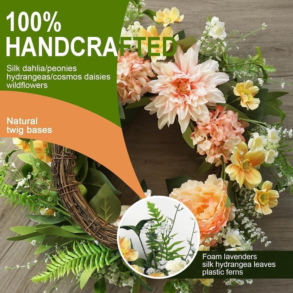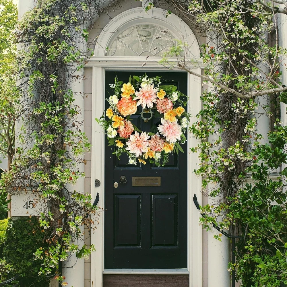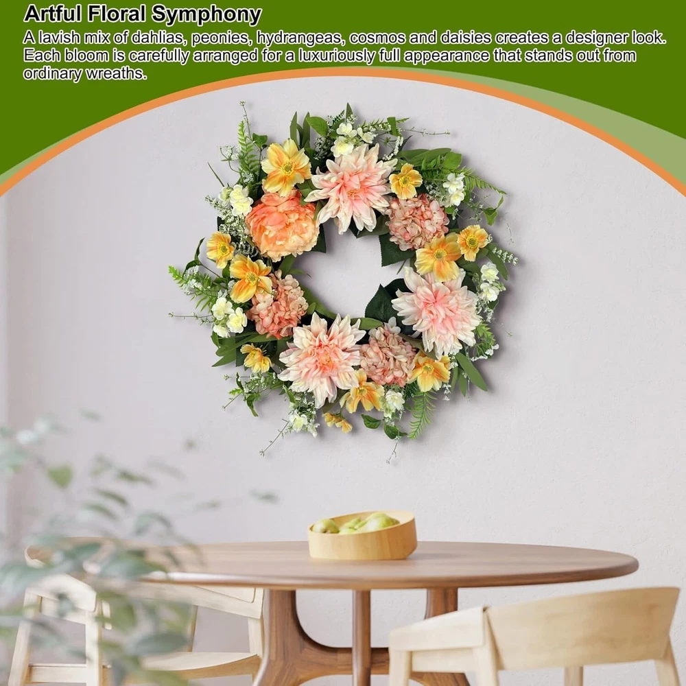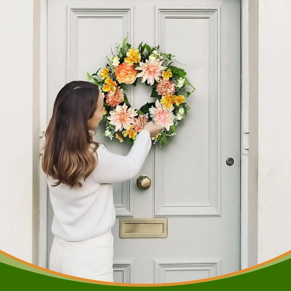 This wreath is absolutely stunning—the vibrant colors and lush tropical flowers instantly brighten any room. The craftsmanship is top-notch, with a sturdy twig base that holds up well. Perfect for Easter or summer decor, it adds a cheerful pop of color to doors, walls, or tables. The mix of dahlias, peonies, and hydrangeas looks so real, and the size is just right. Love how versatile it is—works in any space! A must-have for seasonal decorating.