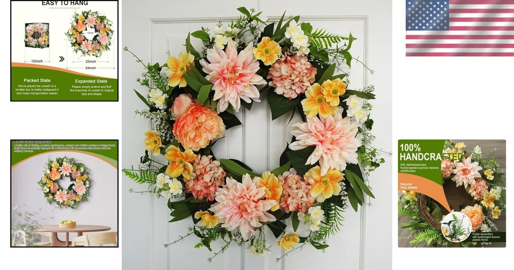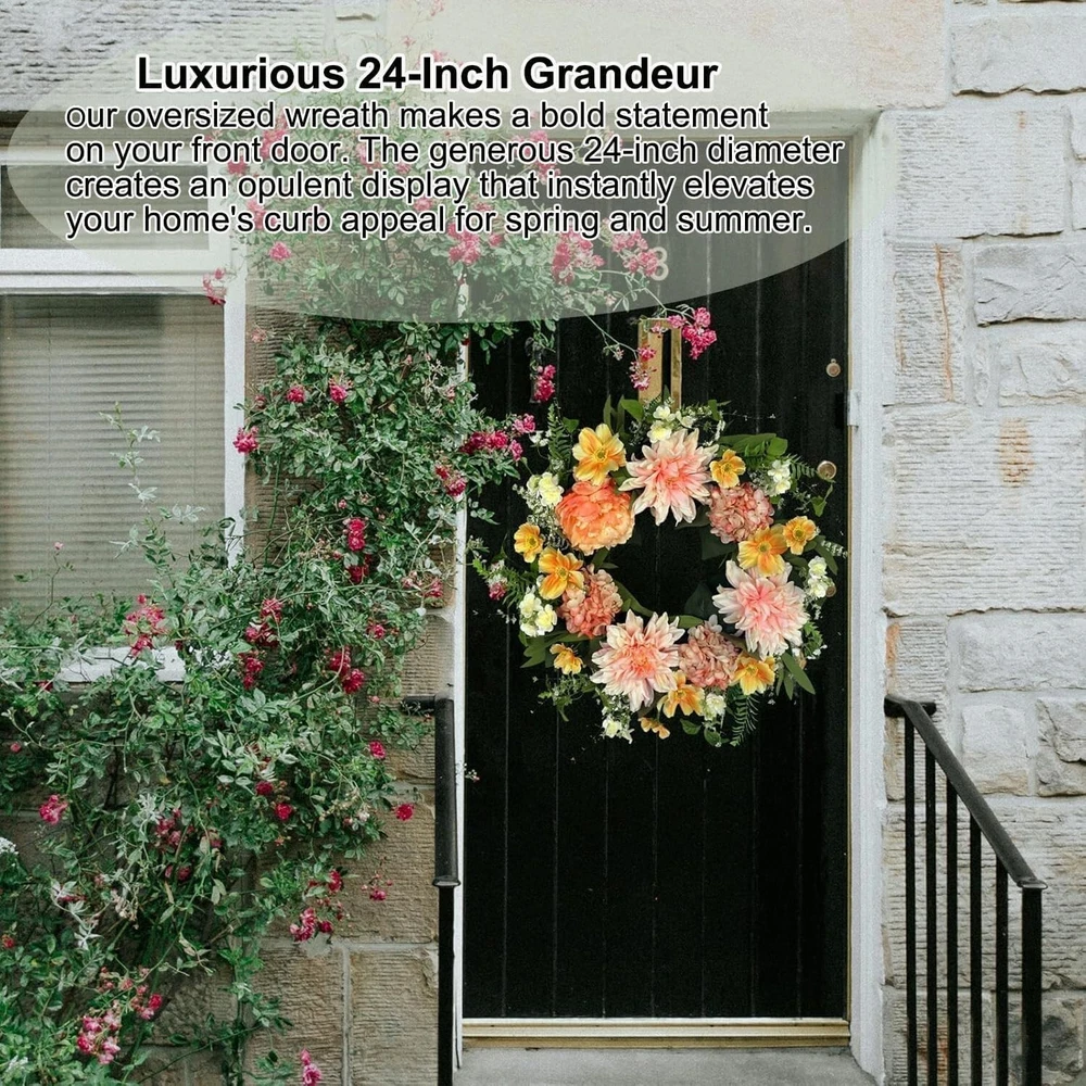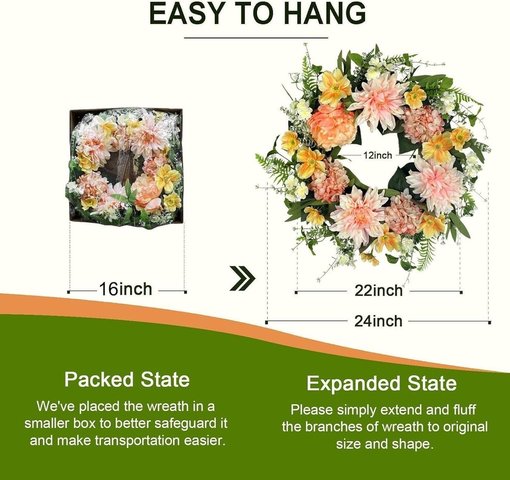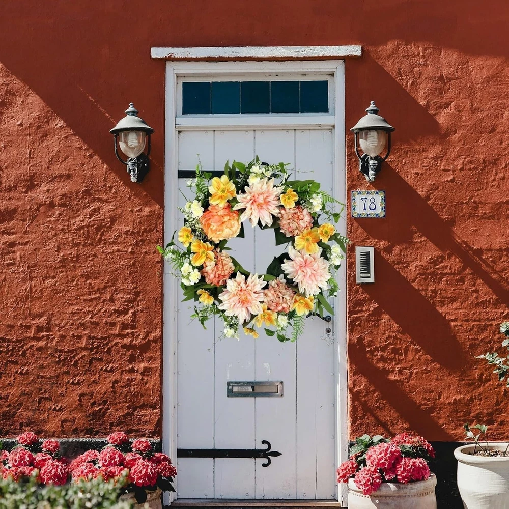 This wreath is absolutely stunning—the vibrant colors and lush tropical flowers instantly brighten any room. The craftsmanship is top-notch, with a sturdy twig base that holds up well. Perfect for Easter or summer decor, it adds a cheerful pop of color to doors, walls, or tables. The mix of dahlias, peonies, and hydrangeas looks so real, and the size is just right. Love how versatile it is—works in any space! A must-have for seasonal decorating.