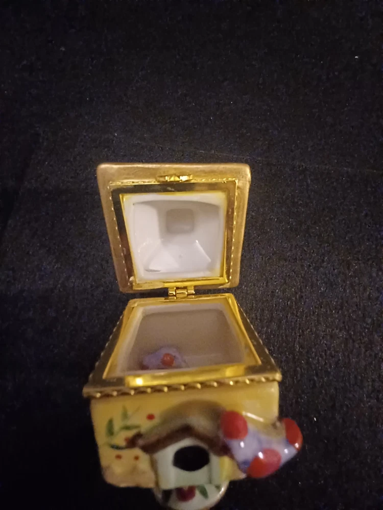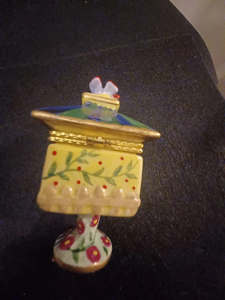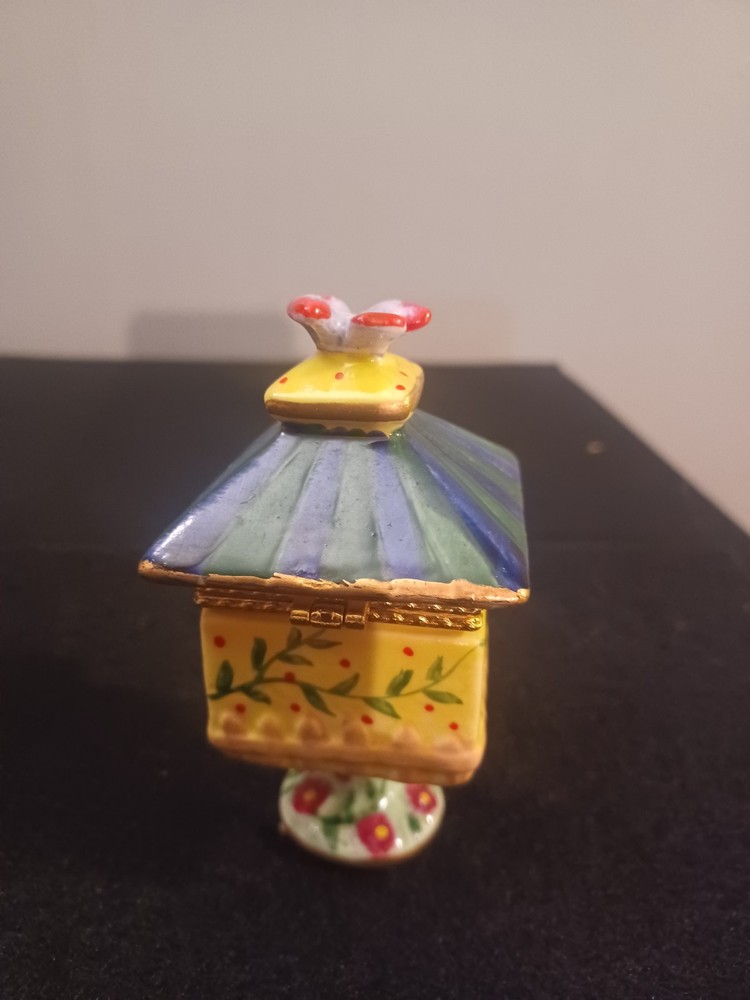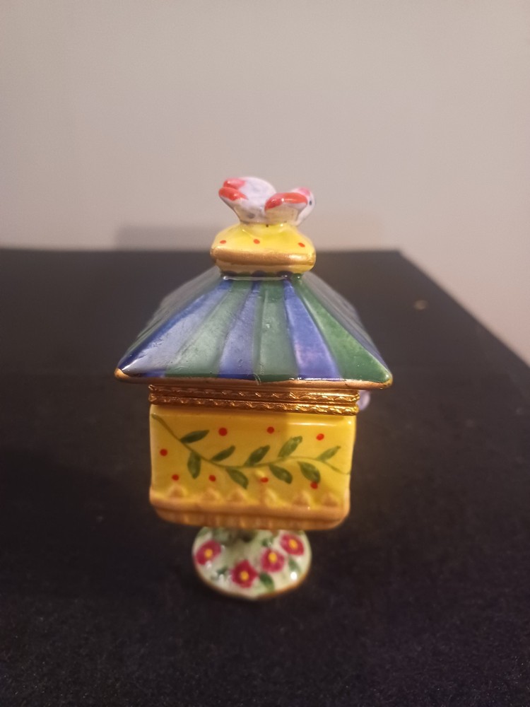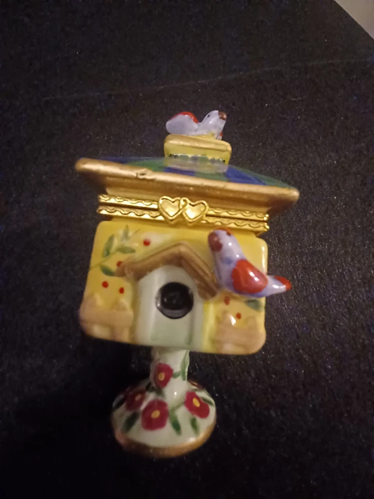 The product is a Bird brand trinket box in a multicolor design, featuring a bird subject. The trinket box resembles a bird house, making it a charming and decorative piece for storing small items.