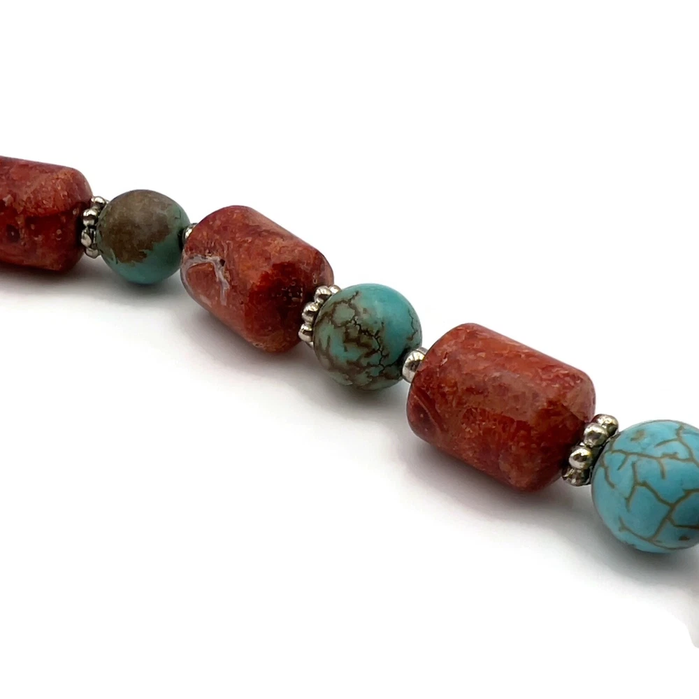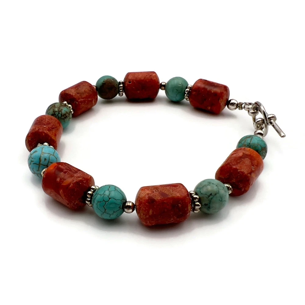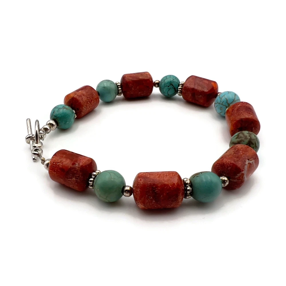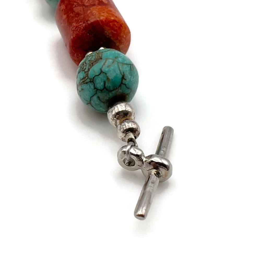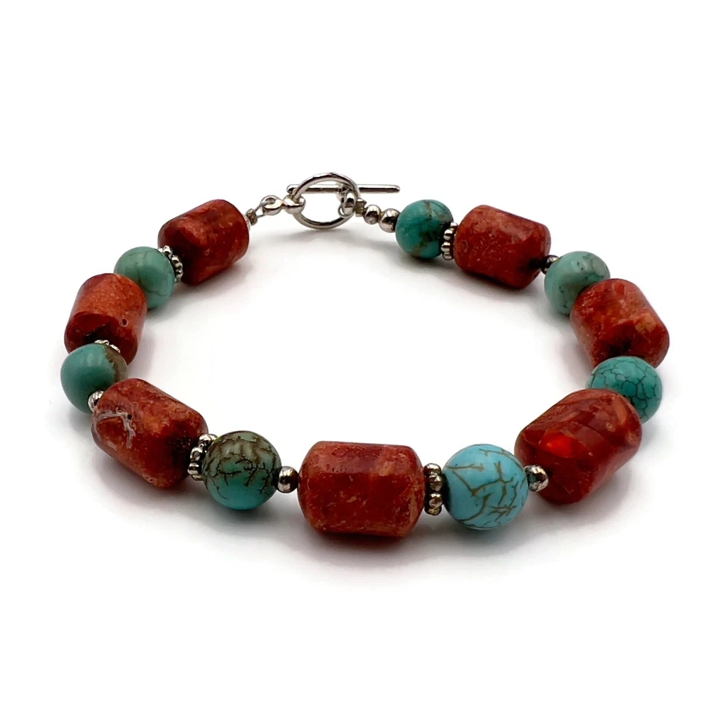 Enhance your wrist with this stunning handcrafted beaded bracelet. The bracelet features silver tone metal and red and blue jasper stone beads, giving it a unique and eye-catching look. The toggle clasp provides a secure and comfortable fit for a wrist circumference of 7.5 inches, with a total length of 9 inches. This artisan bracelet is perfect for women who love beaded and bohemian-style jewelry. The beads range in size from 3.62mm to 14.21mm x 10mm, and the bracelet is made in the United States of America. Elevate your fashion with this one-of-a-kind piece that is perfect for any occasion.