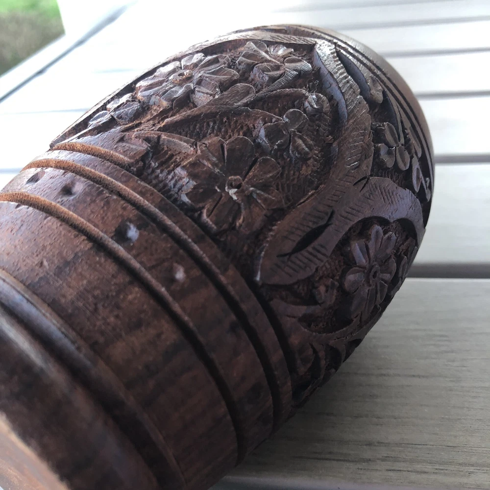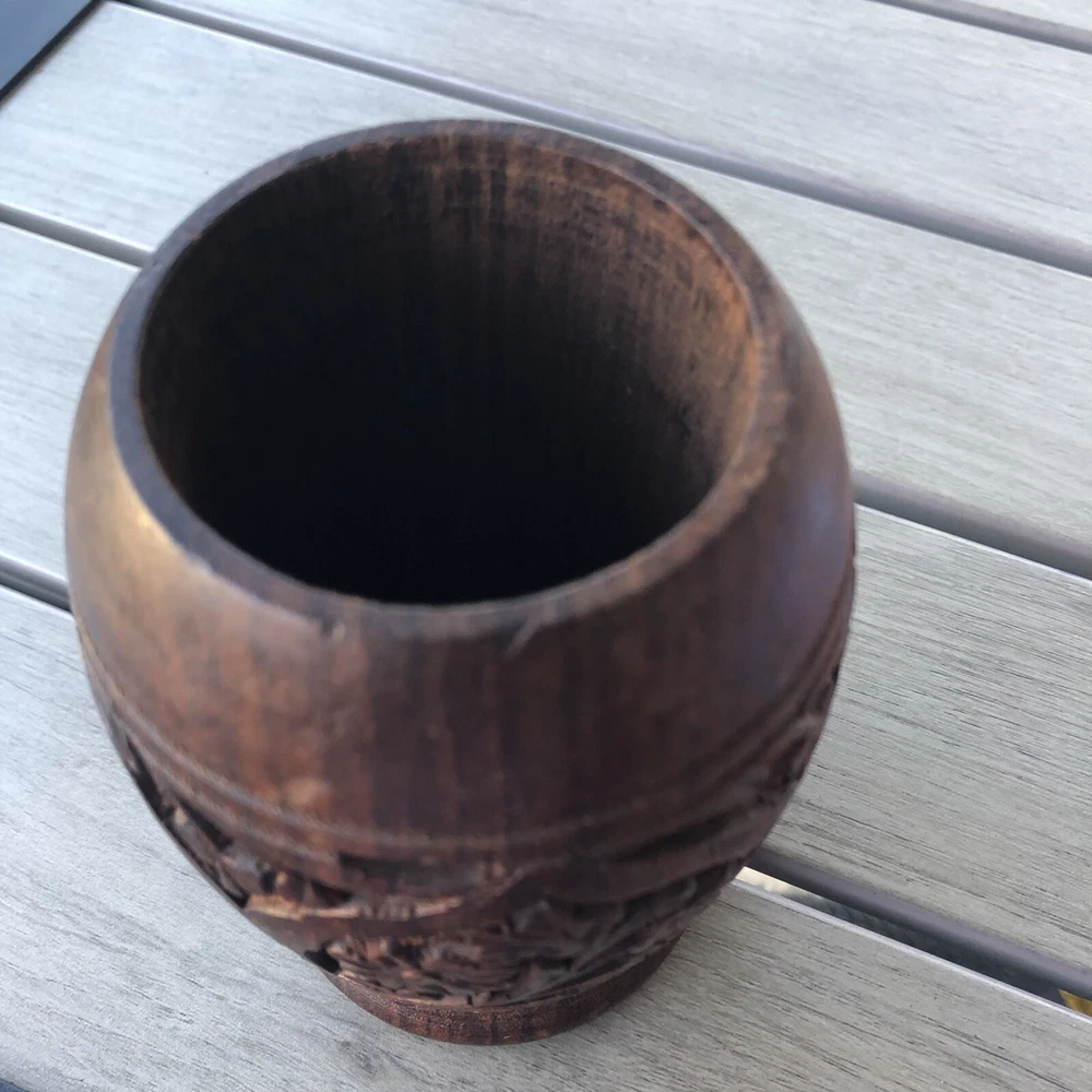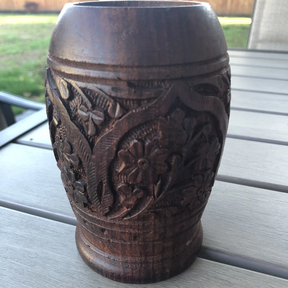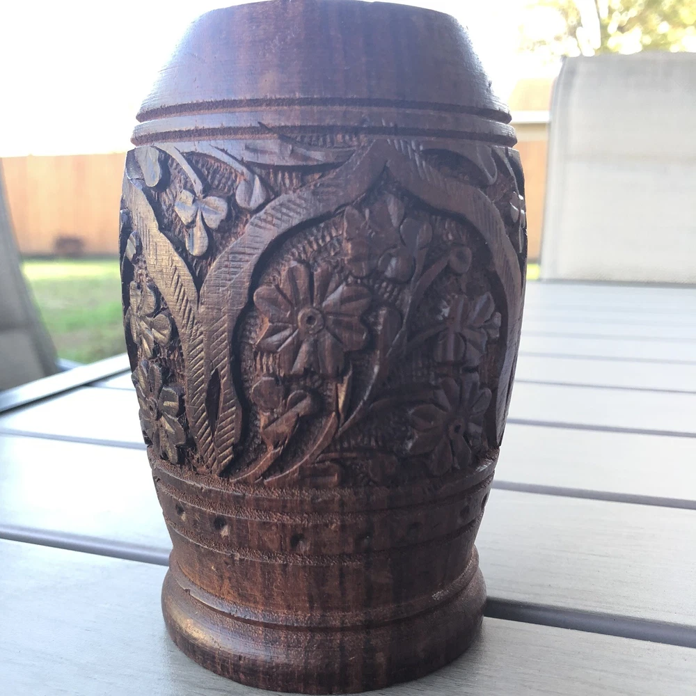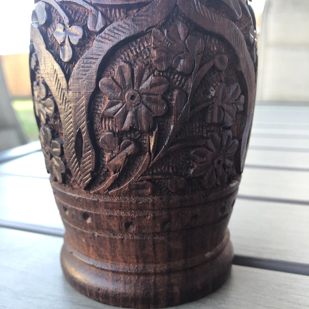 Handcrafted Carved Wood Floral 5” Vase Cup. Great detail floral print Carved wood Use as cup , vase or holder