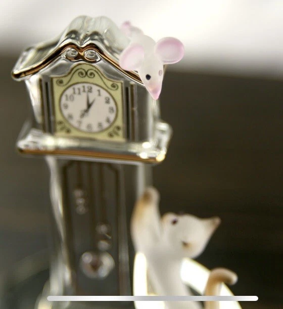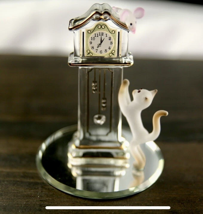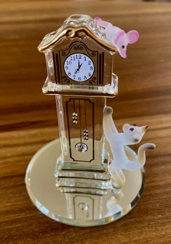This handcrafted clock by Glass Baron features intricate Victorian style design with 22 karat gold accents and sparkling Swarovski crystals. The clear glass clock is adorned with elegant cat figures, making it a perfect choice for cat lovers. Created in 2015, this unique piece is a stunning decorative collectible that showcases the craftsmanship and attention to detail characteristic of Glass Baron creations.