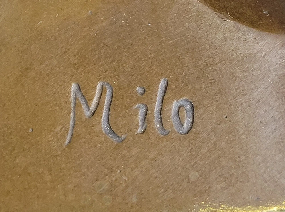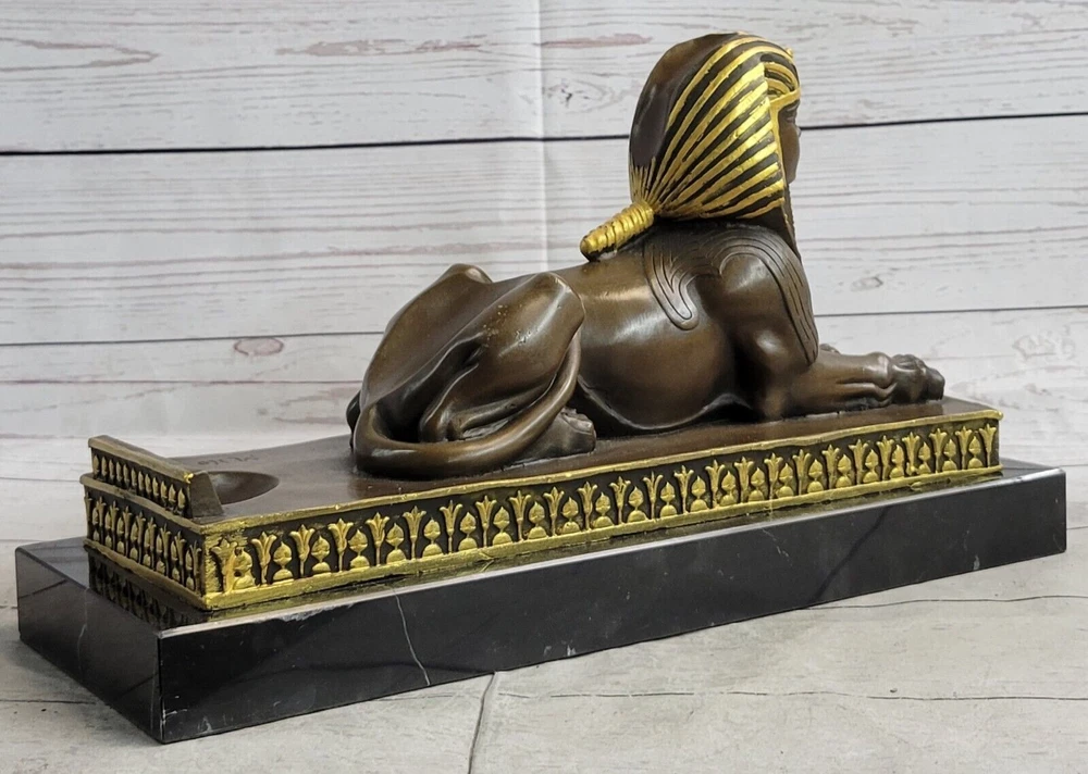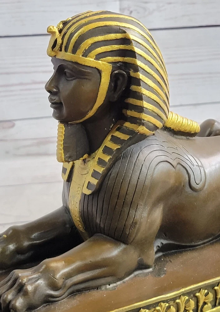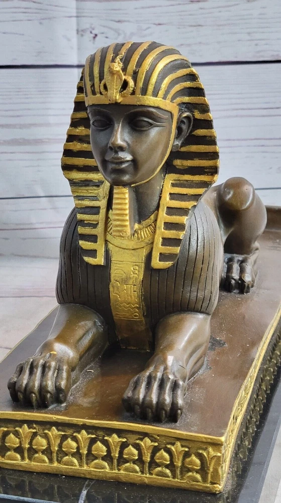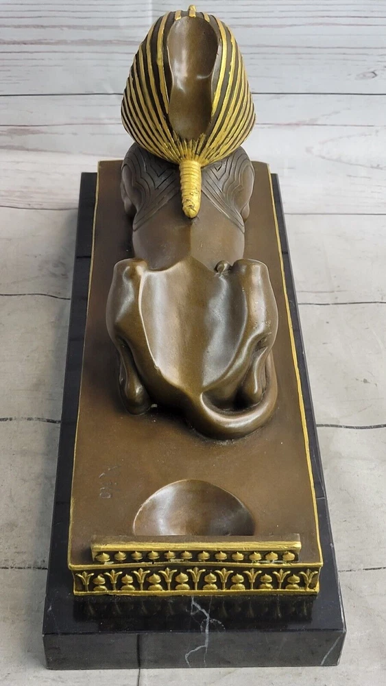 . Condition :nbsp; This sculpture is in perfect condition. Bronze Dimensions with Marble Base: Height 8" x Width 13" Marble Dimensions: 13" X 5" Height without base: 7" Weight: 16 LBS Inventory: 21YDW018BG5612 The Majestic Sphinx: A Mythological Marvel This bronze sculpture captures the awe-inspiring presence of the sphinx, a mythological creature revered in both Egyptian and Greek art. With the powerful body of a lion lying gracefully on its stomach and its paws flat on the ground, the sphinx exudes strength and majesty. Its detailed human head, adorned with a traditional Egyptian headdress, adds an air of wisdom and mystique to the sculpture, embodying the dual nature of this legendary creature. Exquisite Craftsmanship on a Decorated Platform The body of the sphinx rests upon a beautifully decorated platform, enhancing the overall elegance of the piece. The intricate details of the lion's muscular form and the carefully sculpted headdress showcase the artist's dedication to creating a work that is both realistic and artistically refined. The sculpture is a testament to the enduring allure of the sphinx in ancient art and mythology. A Timeless Tribute Signed by Milo Crafted using the ancient lost wax method, this bronze sculpture is not only a work of art but also a piece of history. The smooth black marble base provides a strong foundation, complementing the rich bronze tones of the sphinx. The piece bears the signature of the artist Milo, further attesting to its authenticity and quality. Whether as part of a collection or as a standalone piece, this sculpture is a timeless tribute to one of the most iconic figures in mythology.