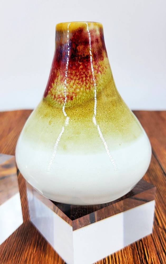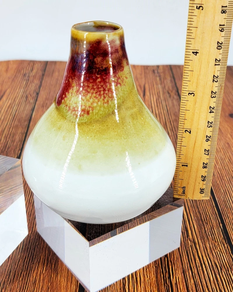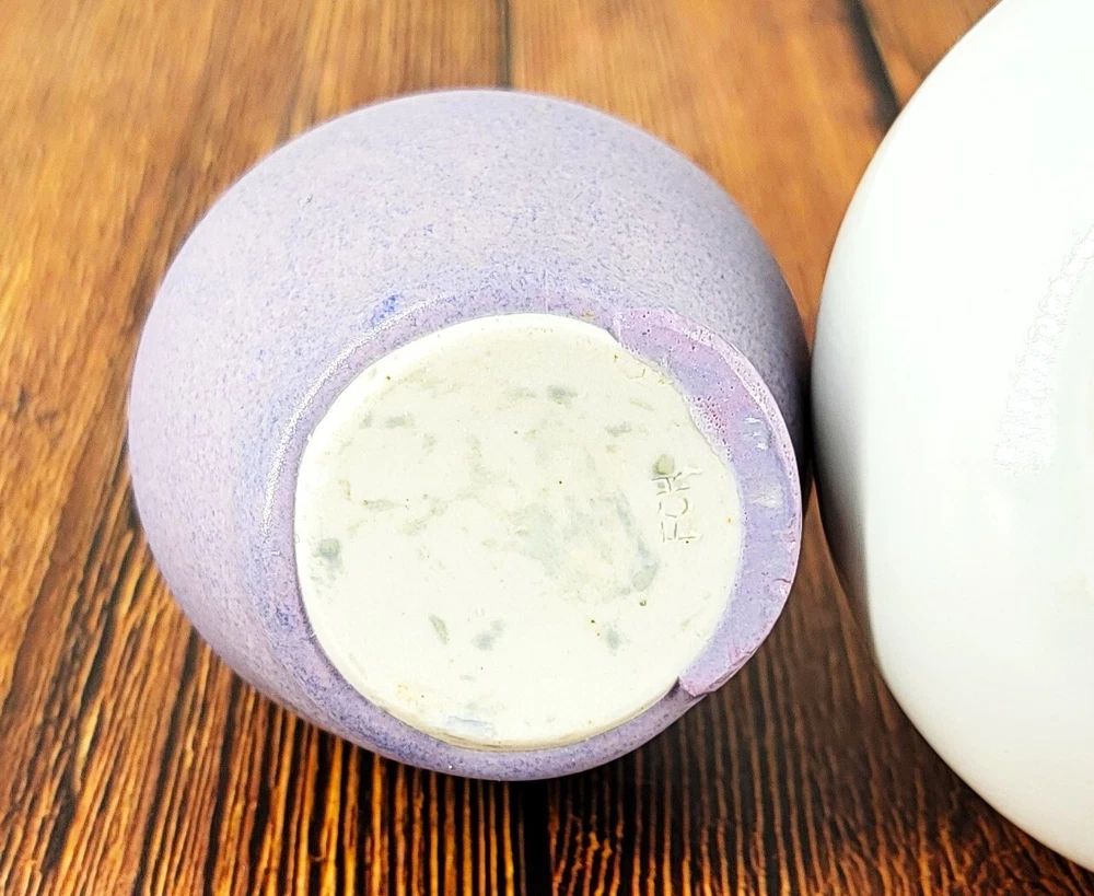 BRAND: These 2 lovely and well made pottery vases are different but compliment one another! Each pottery piece is marked FCH. The glaze work is just beautiful. They have a calming, earth tone quality and smooth texture! LOC/C-4 COLORWAY: The slimer, taller vase is a soft lavender, with blue, teal and gold speckle over lay. It has a smooth satin finish and is just beautiful. The shorter, wider vase is white, gold stone, brick red with slight touches of brown. It is wonderful feeling to touch and has a beautiful glaze! SIZE: The lavender vase is approximately 5" Tall and 3" Wide at the base. The white and earth tone vase is approximately 4.75" Tall and 4" Wide. CONDITION: Both are in lovely hand made condition. No chips, cracks, or crazing! Please see my photos for exact details! Thank you for popping by today to have a look and hope you have a wonderful day!!