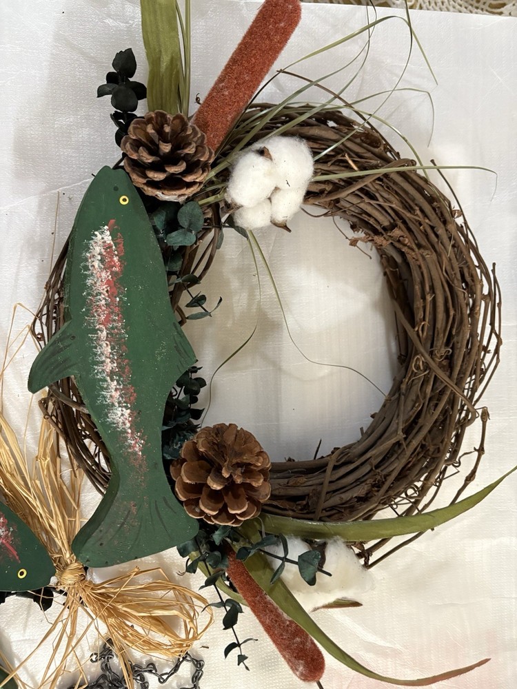 This Handmade Fishing Wreath and decor is the perfect addition to your summer or retirement decor. Made from artificial materials like grapevine and wood, this green wreath features a Fishing theme that adds a touch of nature to your door. Ideal for Lake enthusiasts, this unique door decoration will surely catch the eye of any passerby.