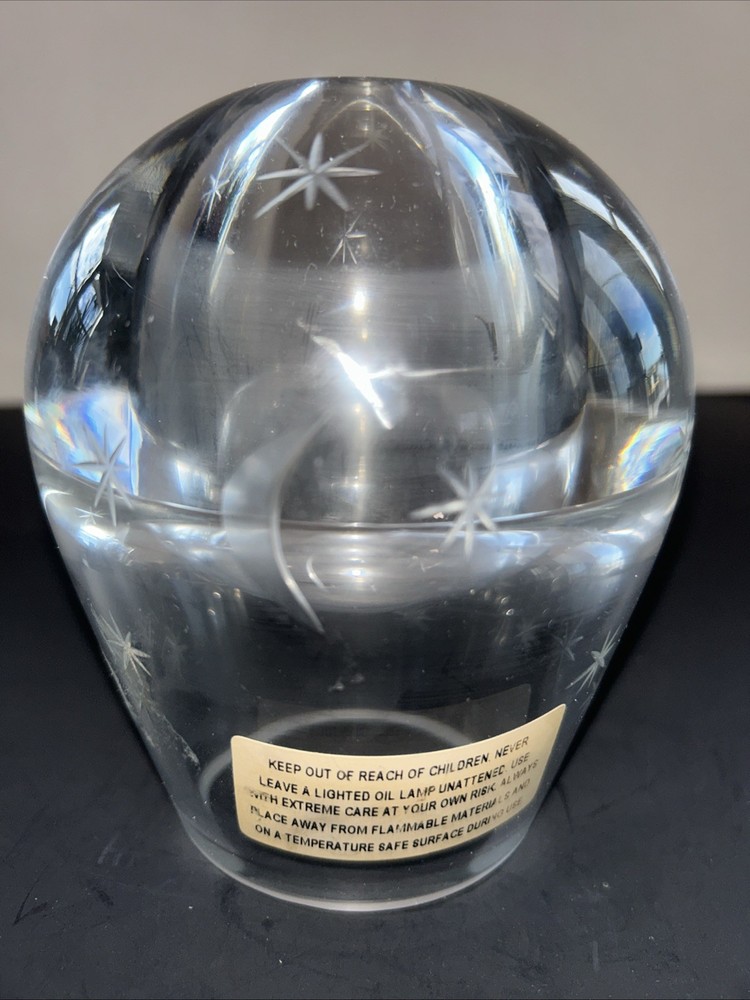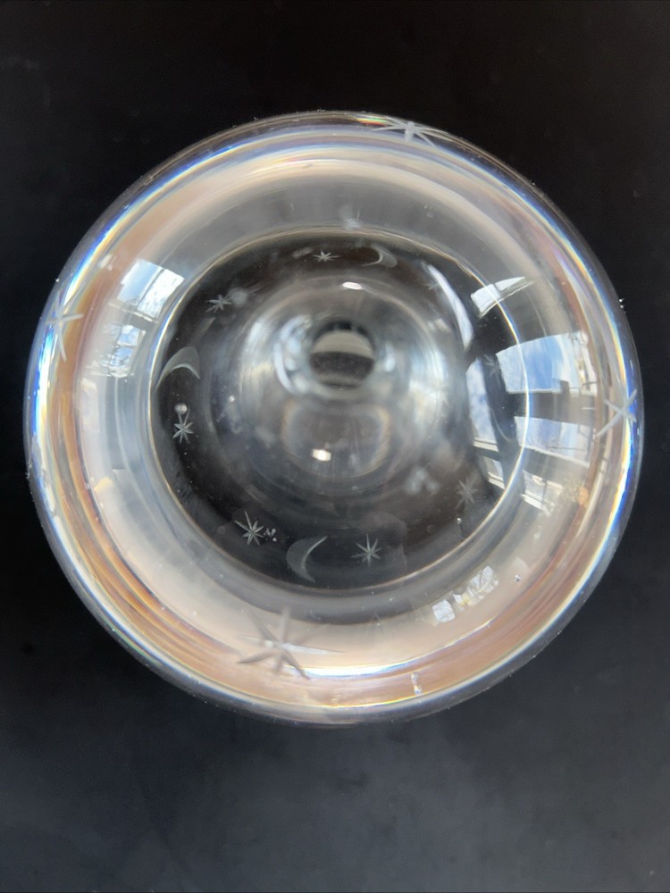 This small, blown glass oil lamp features an intricate moon and stars design, made in Poland with a clear crystal material. Standing at 5.5 inches tall with a 4-inch diameter at the bowl, this original piece is sure to add a touch of elegance to any space. The handcrafted Polish craftsmanship and unique finish make this lamp a charming and stylish addition for collectors or those seeking a special lighting piece with a touch of history and culture.kk452