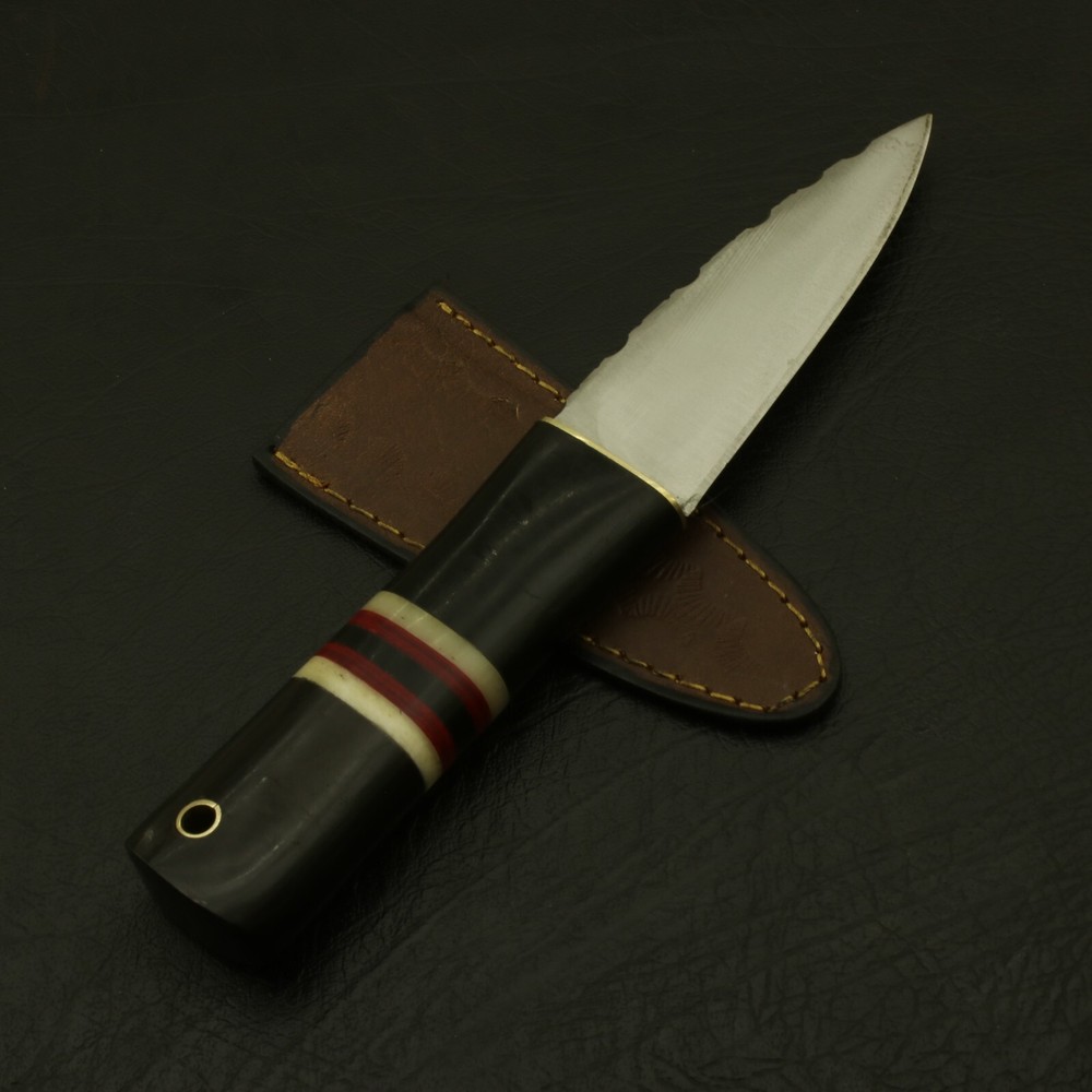 Beautiful Handmade Steel Sgian Dubh Scottish Dirk Knife/ Sheath If you’re looking for a fixed blade Dirk knife that will be a reliable companion, look no further! This knife epitomizes the bold. The main qualities that make it great: sturdiness, sharpness, and looks. The ergonomic design is easy to hold and carry with the included leather sheath. Great for survivalists, tactical personnel, outdoors-men or anyone who appreciates fine craftsmanship and an amazing blade. . The blade is stainless steel, single edged, and razor sharp. It's sturdy enough to last through even the harshest conditions. The handle is beautifully polished, with real bone grips. Designed to feel comfortable and natural in the hand. Even in different conditions, you'll feel confident that the knife will stay firmly within your grasp. Included with the knife is a genuine leather It's brand · Overall Length: 8” · Blade Length: 4” · Handle Length: 4” Handle is made of wood/rose/Pakka/bone. Complimentary gift messages *Gift wrapping service available for minimal additional fee ADD ONS: *Custom orders for 10 or more pieces. You can choose & submit your own handle or design. LIFETIME WARRANTY No premium knife is complete without a lifetime warranty; our masterpiece knife is fully covered for life, We do sell wholesale, please contact us for special discounts on bulk orders. FEEDBACK POLICY: YOUR FEEDBACK IS VERY IMPORTANT FOR US, IF THEIR IS ANY KIND OF PROBLEM PLEASE GIVE US OPPORTUNITY TO SORT THE ISSUE