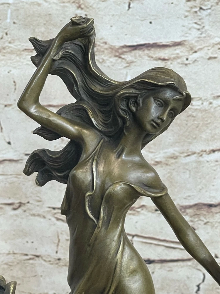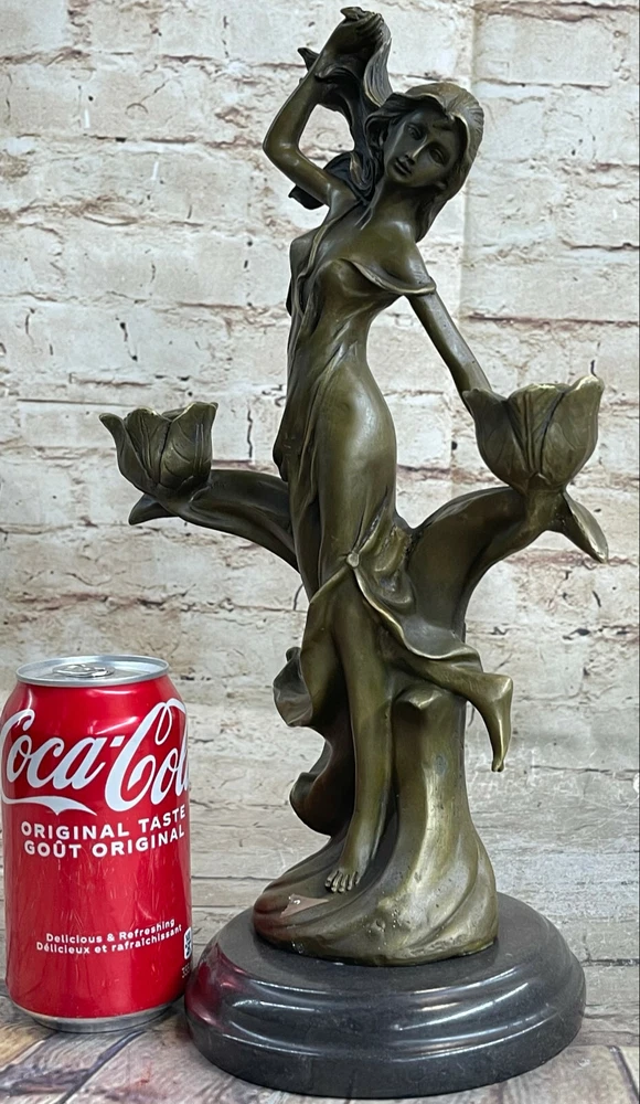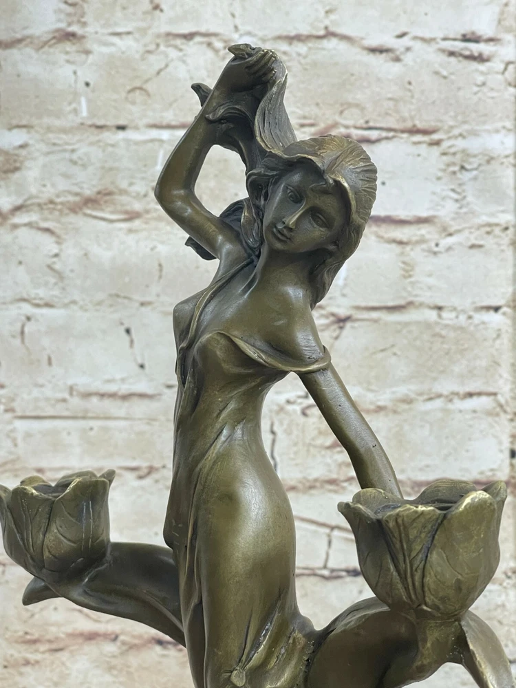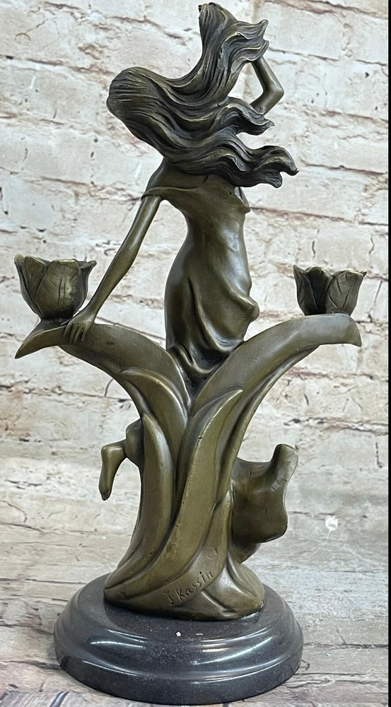 . Condition : The sculptures is in perfect condition. Each Bronze Dimensions with Marble Base: Height 14" X Width 8" Marble Dimensions: Diameter 5" Height without base:13" Weight:10 LBS Inventory:15YRD13135751 Indulge in the captivating beauty of this stunning bronze candle holder that portrays a serene woman in a moment of relaxation. As she gently wipes the sweat from her forehead, she emanates an inner beauty that resonates from within. Her graceful posture is accentuated by the placement of her hand behind her, exuding an aura of tranquility. Adorned in a flowing robe that elegantly drapes around her, the sculpture captures the subtle curves of her body, showcasing the artist's attention to detail. The robe cascades down to the floor, creating a captivating visual display as it fans out around her. The inclusion of her hips adds dimension to the sculpture, captivating the viewer's gaze. What makes this candle holder truly unique is the incorporation of delicate flowers that cleverly conceal candle holders. When a candle is lit and placed within the sculpture, the warm glow of the candlelight dances off the bronze, creating a mesmerizing and breathtaking sight. The play of light adds a touch of ambiance and aesthetic charm to any room, making it a captivating centerpiece. Enhance the elegance of your living room or home with this extraordinary candle holder, a true embodiment of artistic excellence. Crafted with utmost care and signed by the talented artist J. Kassin, it is a testament to the artist's creativity and skill. Immerse yourself in the enchanting allure of this gorgeous bronze candle holder and experience the harmonious blend of beauty and functionality. Elevate your space with its timeless elegance, creating a soothing ambiance and captivating focal point that will leave a lasting impression. Young Nymph Girl Figure Bronze Candelabra Candle Holder Sculpture Statue Kassin YRD-1313 Bronzhaus Video will open in a new window Using the eBay App? Paste link into a browser window: [isdntekvideo]