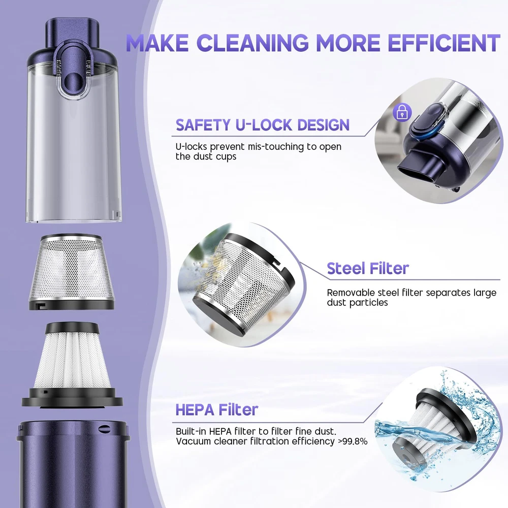 🟣【16000PA Powerful Suction】120W powerful motor provides strong suction and blowing options of 1 Gear-12KPA and 2 Gear-16KPA, you can adjust the vacuum cleaner's gear according to your cleaning needs. Whether cleaning up tiny dust or larger debris particles, it is easy to deal with. Car vacuum cleaner fast heat dissipation function keeps the motor stable at a high speed of 108,000RPM, preventing overheating and enhancing safety 🟣【7 Multi-Purpose Accessories】Multi accessories for all of your needs. Long suction nozzle, brush and long nozzle make it easy to clean all kinds of dust and garbage. Hair dryer nozzle provides powerful wind to quickly dry damp clothes or hair. Pet care brush can suck away hair while brushing your pet. Large universal nozzle can vacuum storage bags or inflate mattresses and rafts. Small universal nozzle can inflate and deflate yoga balls, swim rings and more 🟣【Dual Filtration System】Handheld vacuum cordless cleaner comes with an upgraded dual filtration system that prevents suction loss and clogging. With reusable filters, the steel filter can effectively filter large particles of debris, and the washable HEPA filter can filter tiny particles and dust to prevent damage to the motor. Unique -click dusting and U-locking design makes it easy to empty the dust cup while preventing accidental touching of the button 🟣【Digital Display & Fast Charging】Handheld car vacuum cleaner is equipped with a digital display that clearly shows the current number of gears used and the suction power level, which can help you better control the cleaning progress. 4000mAh reusable battery can be fully charged in just 2.5 hours. The working times of Gear-1 is 30min and Gear-2 is 25min under full charge. Note: Please don't use high power adapter, 5V/2A adapter can be used for charging 🟣【Portable & LED Light】Car vacuum portable cordless cleaner has a cordless design, so you don't have to worry about cords when cleaning. Our mini vacuum cleaner is made of lightweight material, only 0.66LB, making it easier to hold. Compact size can be easily stored in a drawer or locker to take up no space. Equipped with an LED light to illuminate dark corners, allowing you to easily clean without light restrictions