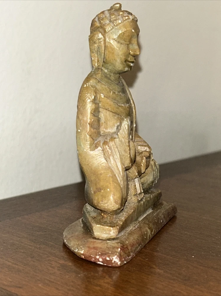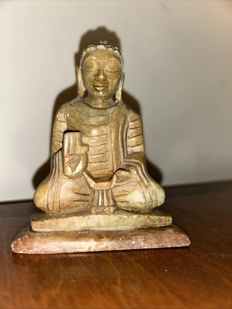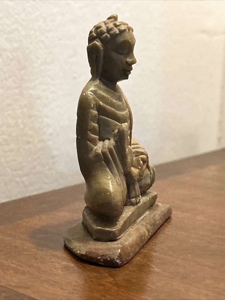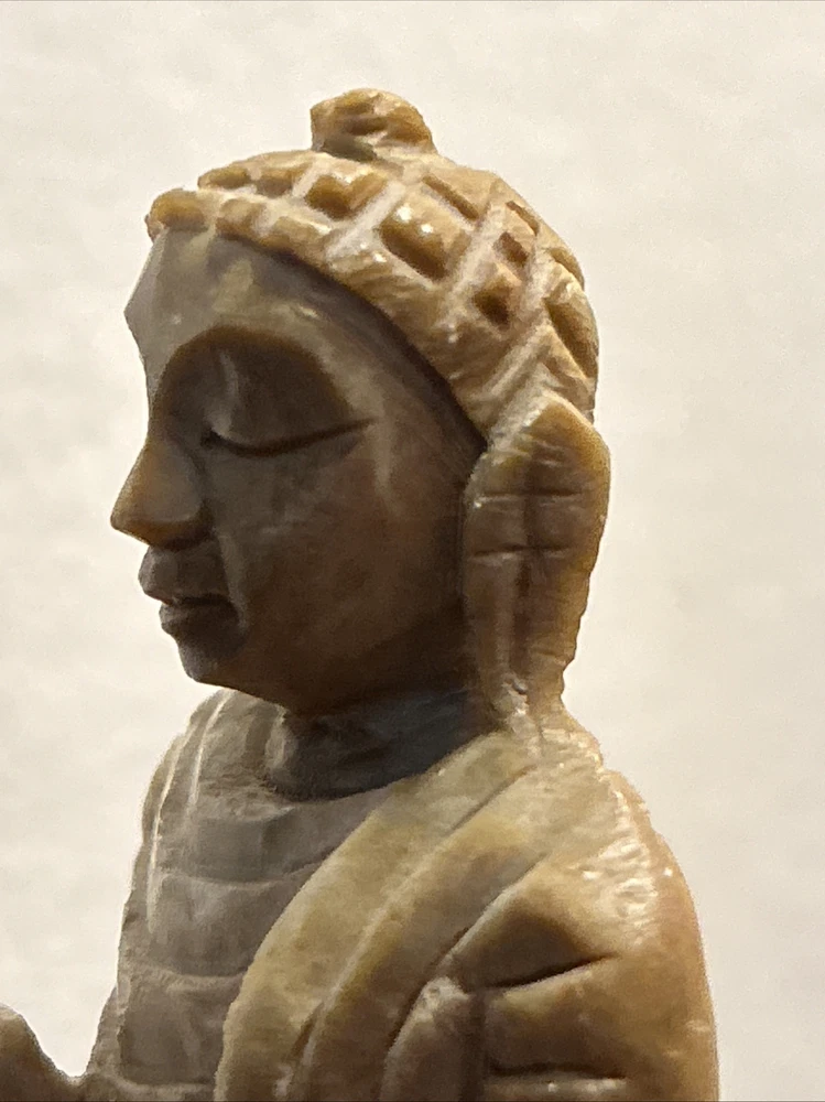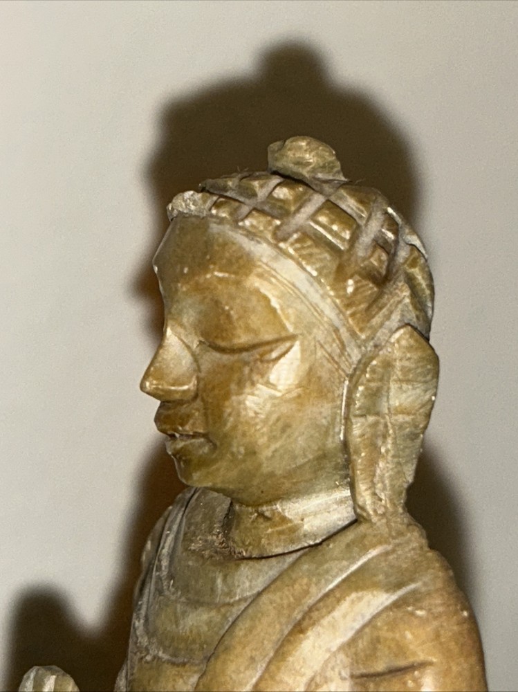 This 3.1/2“ high x 3 1/8“ wide stone statue features a Buddha figure, reflecting elements of Hinduism and Buddhism in its design. Tan, Olive, Brown colored stone most likely Soapstone. Excellent condition with one small chip underside on the meeting surface (in last picture). Some fine detail!