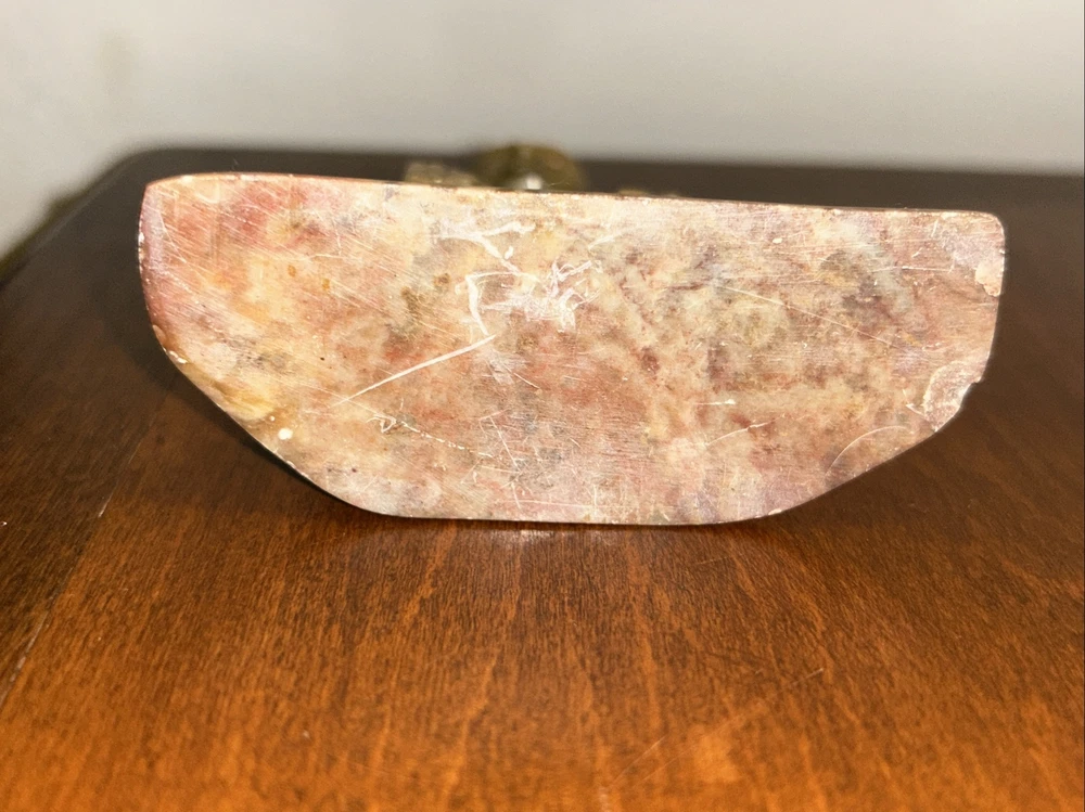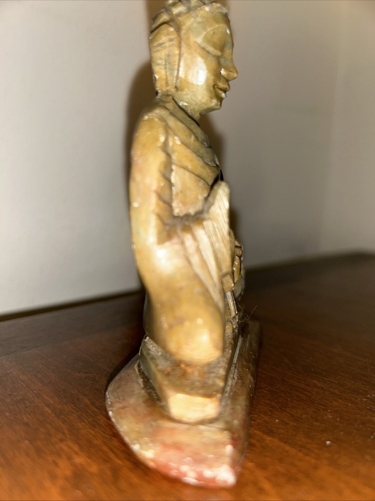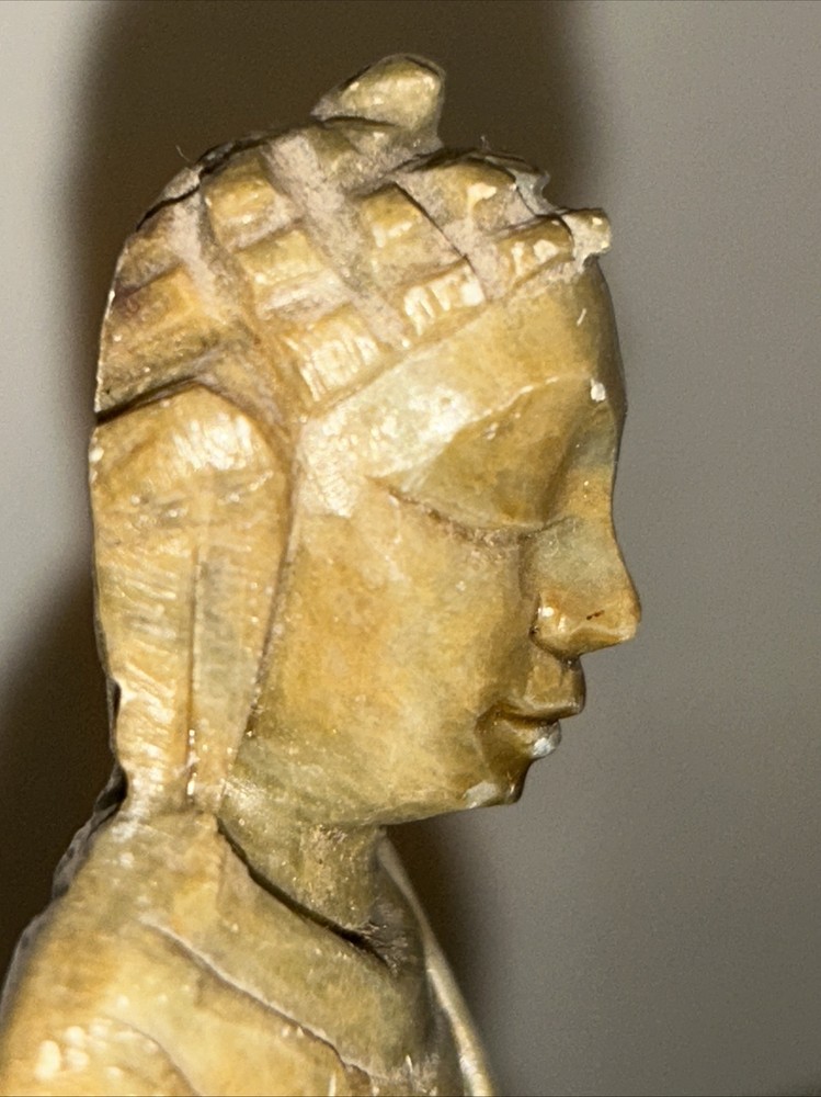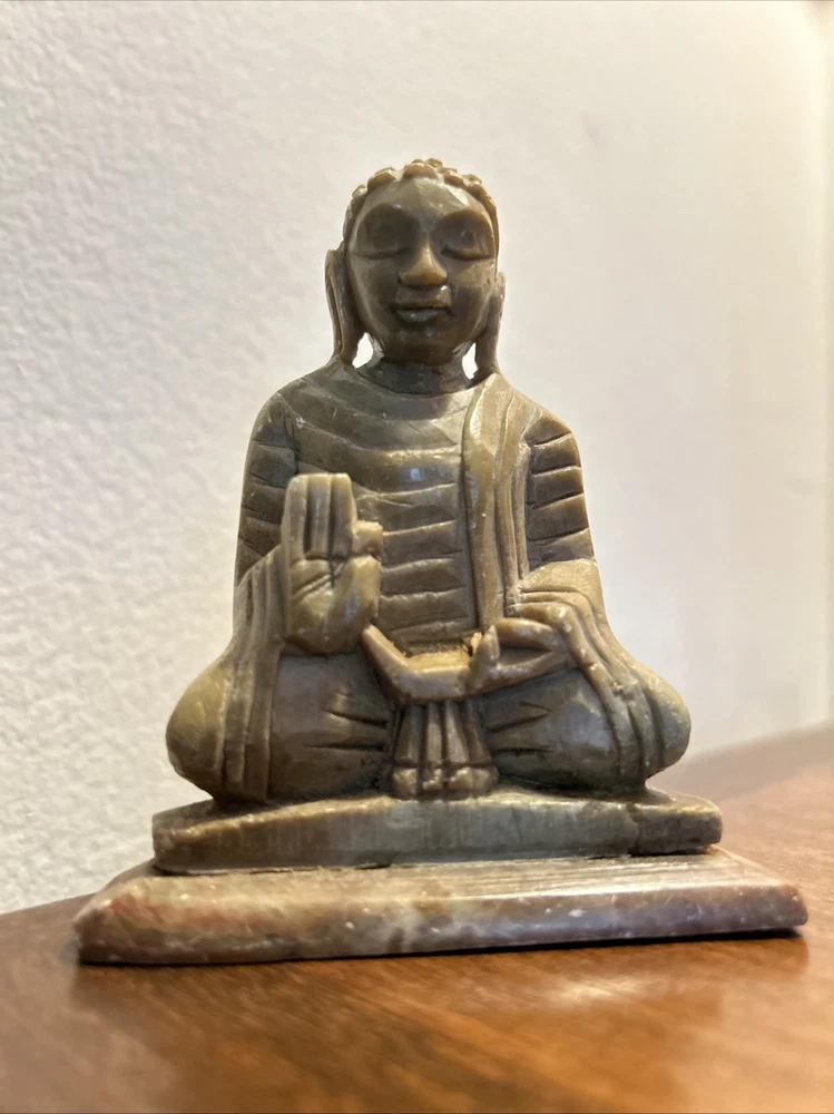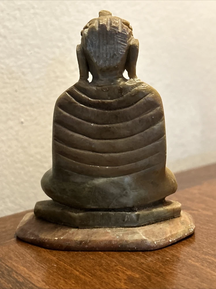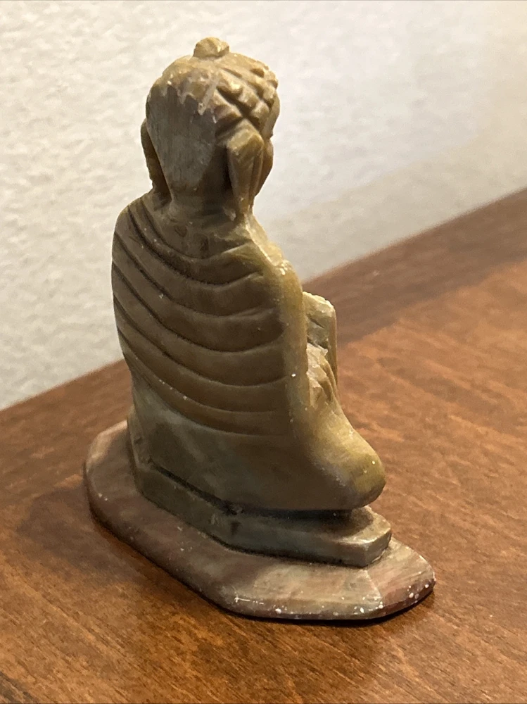 This 3.1/2“ high x 3 1/8“ wide stone statue features a Buddha figure, reflecting elements of Hinduism and Buddhism in its design. Tan, Olive, Brown colored stone most likely Soapstone. Excellent condition with one small chip underside on the meeting surface (in last picture). Some fine detail!