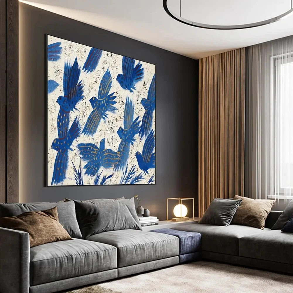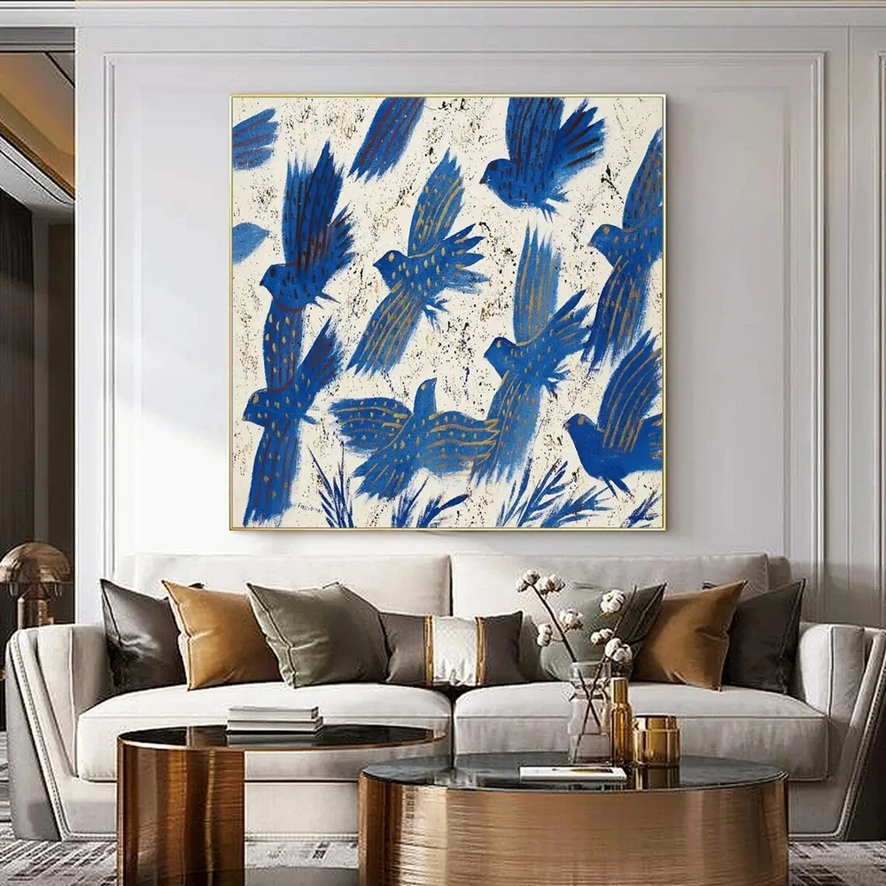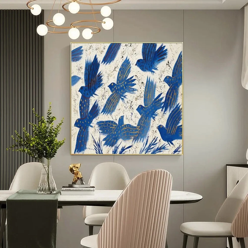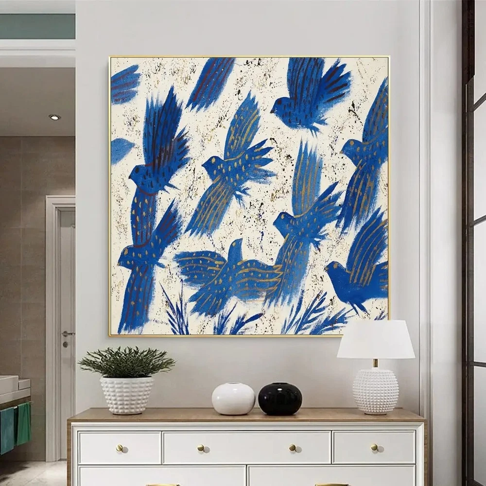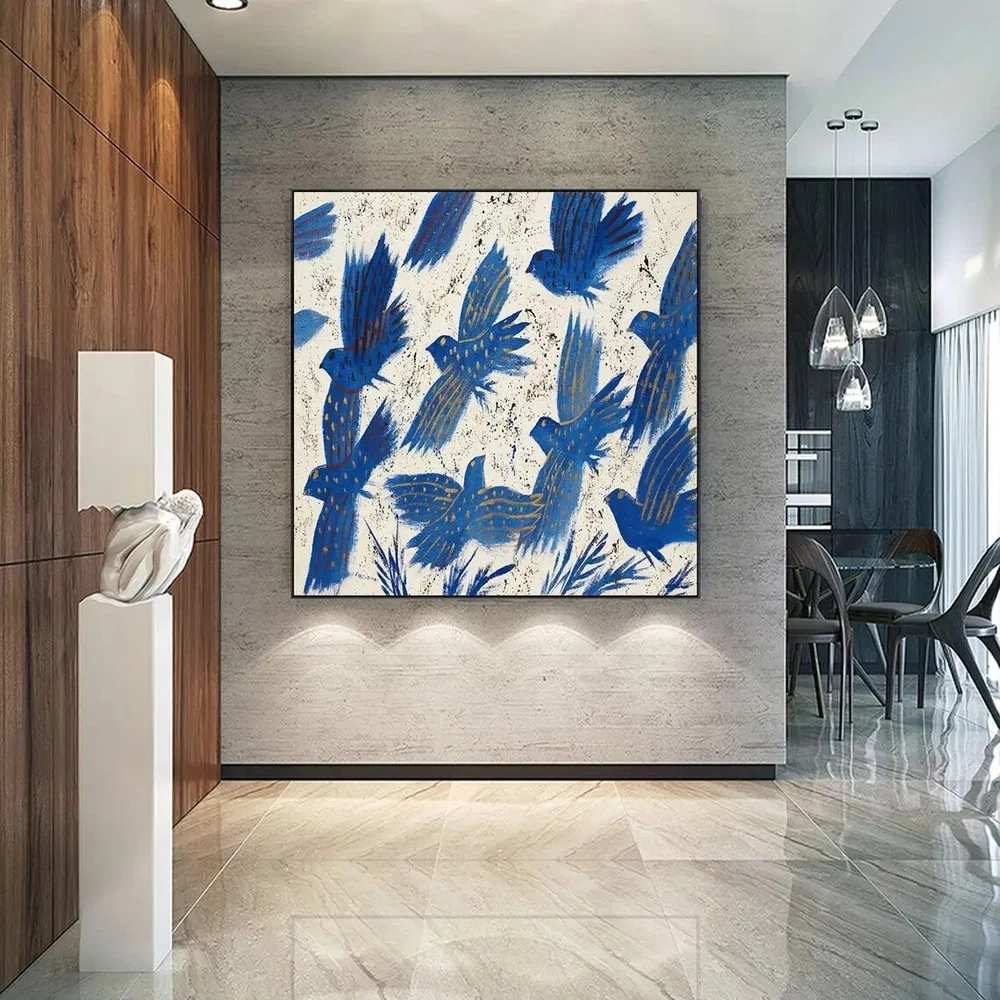 Handmade Abstract Blue Pigeon Flowers Landscape Large Modern Art Living Room