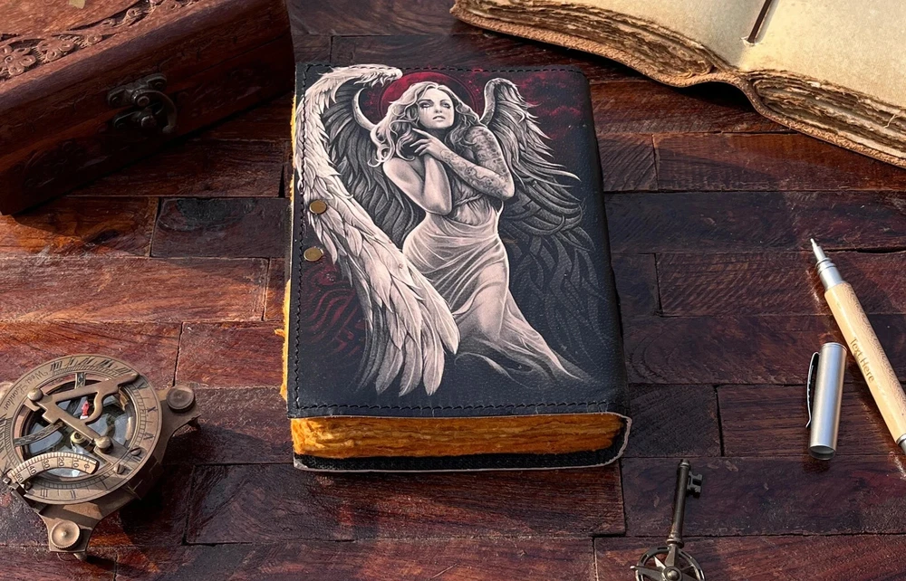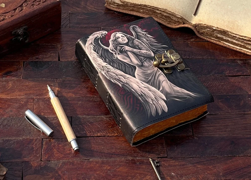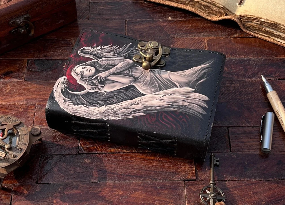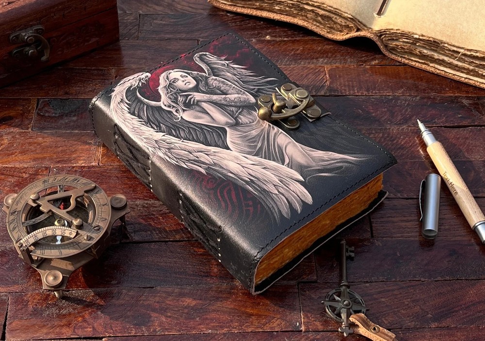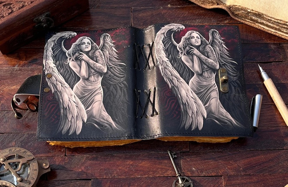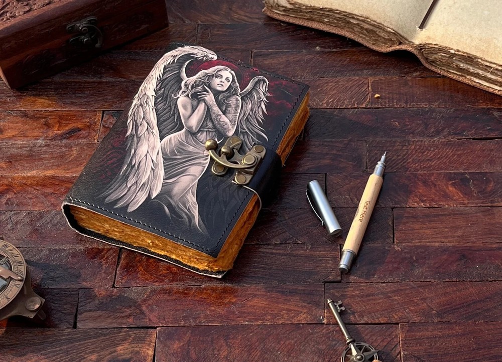The Angel Leather Journal is a luxurious and limited edition handmade leather notebook, perfect for those seeking a unique and high-quality writing journal. With a leather cover and personalized details, this Grimoire journal is crafted in India with attention to detail. Ideal for business, industrial, and personal use, this notebook offers a special touch of luxury and exclusivity for the discerning writer. Angel Leather Journal - Handmade Leather Notebook • Grimoire Journal • Blank Book • Vintage Deckle Edges Paper • Special Gifts For Girls Name : Angel Printed Journal This Journal Is Made From A High Quality Leatherette With A ANGEL Printed Finish And Vintage Looking Paper ★ DIMENSIONS :- The Journal Is Available In 3 Perfect Sizes. 13 inches" x 10 Inches. 10 Inches" x 7 Inches. 8 Inches" x 6 Inches. 7 Inches" x 5 Inches. ★ PAPER :-The Inside Of This Journal Is Handmade Decal Edge Paper That Looks Vintage And Well Stitched Whose Number Is 200 (Please Count Both side) If You Want White Plain Paper So Please Select Right Paper Option There Are Two Options Available. ★ HANDCRAFTED FROM GENUINE LEATHER: Each Journal Is Specially Designed And Handmade From Premium Leather. Artful Hand Stitching To Create A Timeless Space For Your Thoughts. ★ TELL YOUR STORY :- We Designed This Classic Leather Journal As A Time Capsule For Your Thoughts. Capture Your Important Memories, Accomplishments (And Failures), Life-Changing Moments And Evolving Dreams As A Keepsake To Reflect Upon In Years To Come. ★ THE PERFECT GIFT :-Quality You Can Trust: High-Quality Craftsmanship Makes This An Essential Tool For Poetry, Art, Sketching, Writing, Drawing, Calligraphy Leather Journal Give Your Loved Ones A Thoughtful Gift That Will Last For Years To Come! Great For A Birthday, Anniversary, Or Graduation Ignore :- Travel journal Antique journal Handmade leather journal Sun and moon Leather journal celestial embossed Book of shadows Grimoire journal Sun and moon journal Angel journal