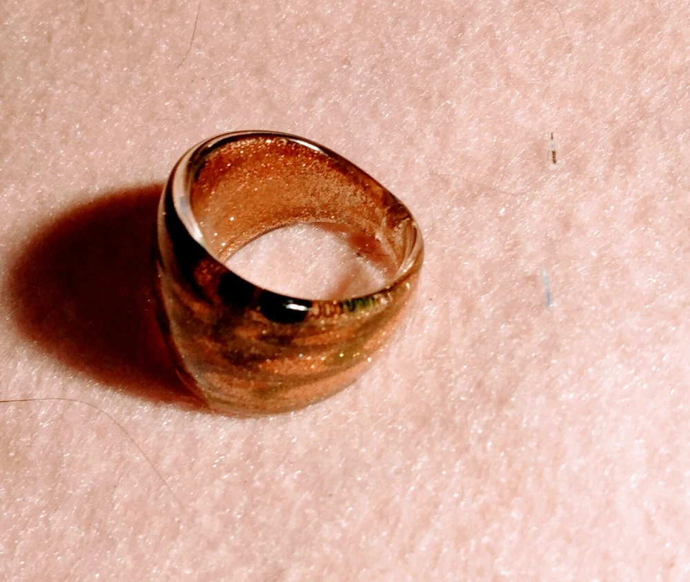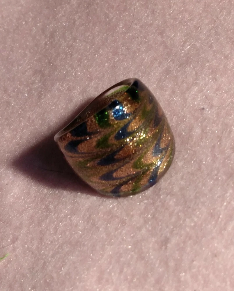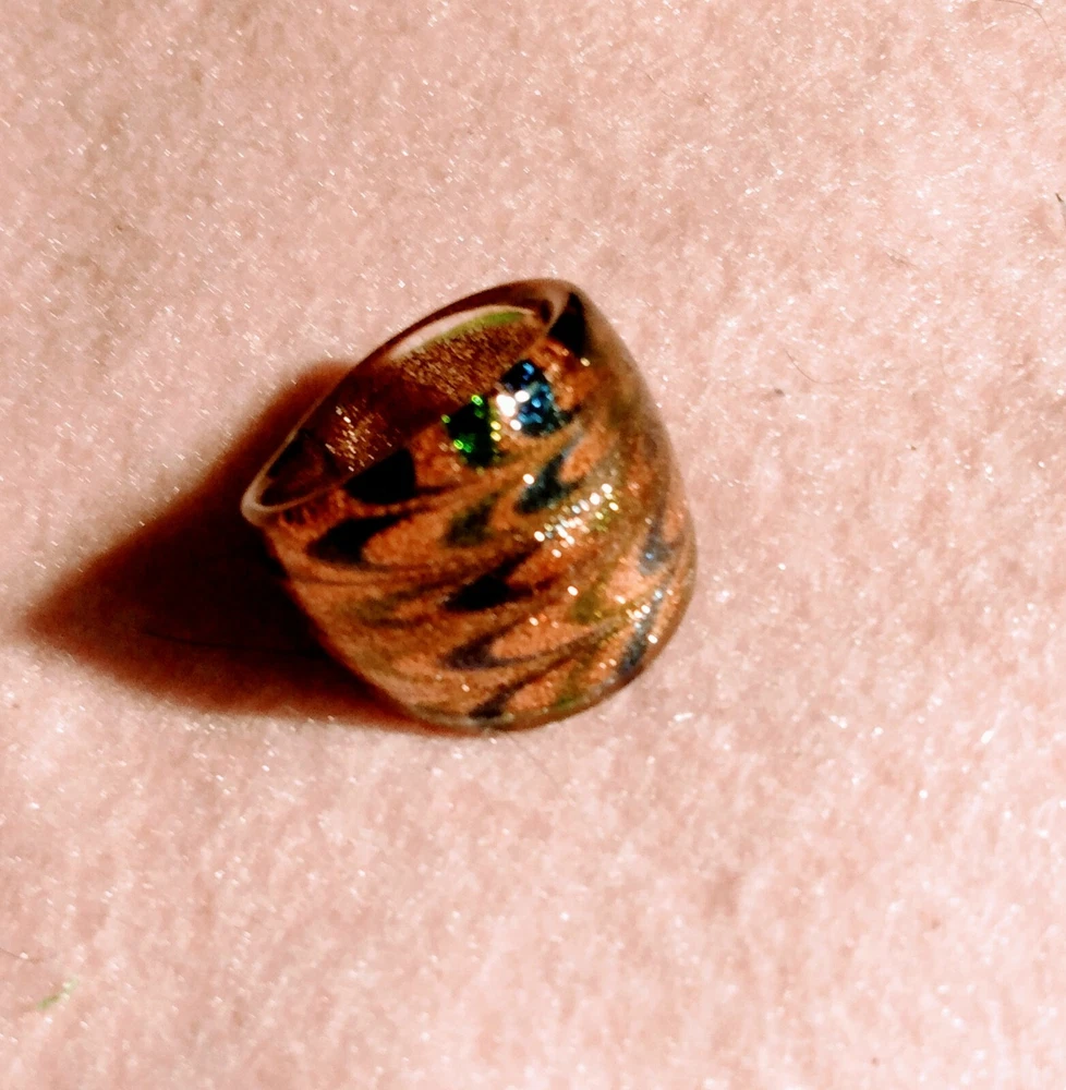 Handmade Art Glass Ring size 8 dome metallic rose gold with blue and green