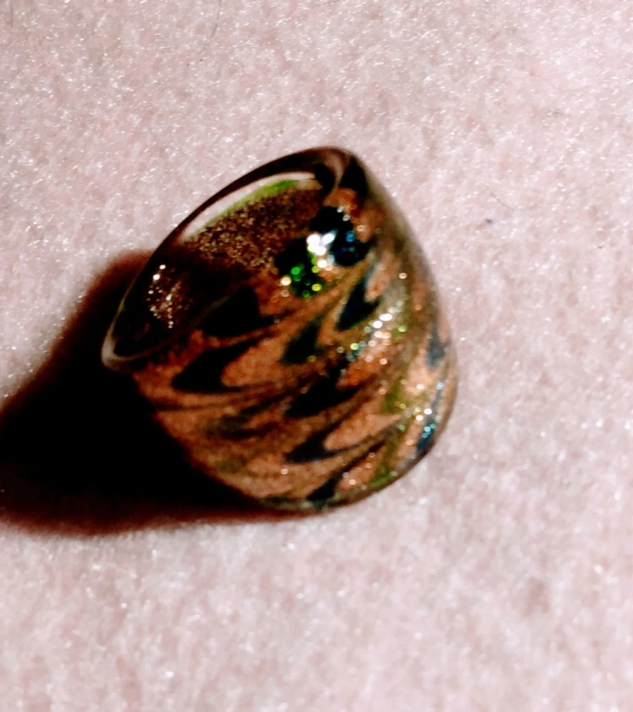 Handmade Art Glass Ring abstract dome metallic rose gold with green & blue sz8