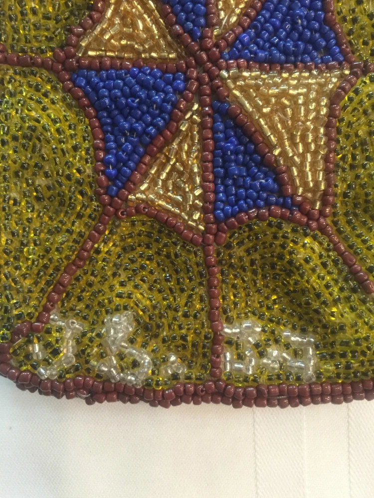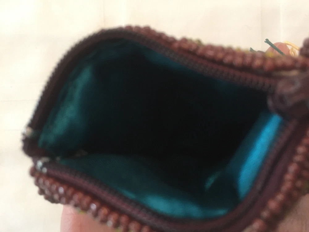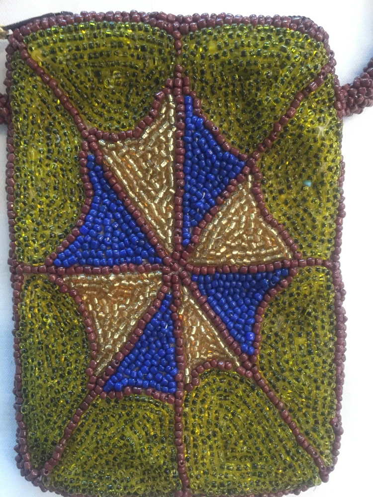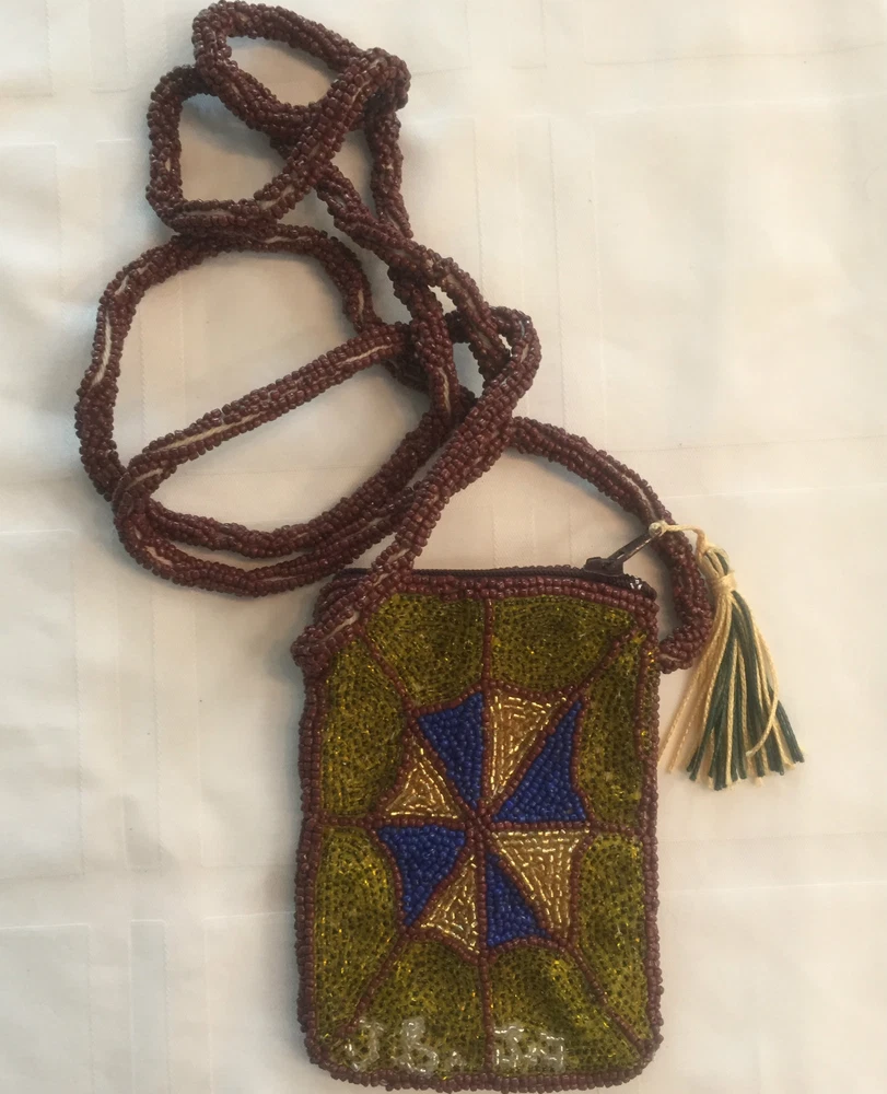 All beaded small pouch, purse, bag great for carrying items like ID, Credit card, cash, even a small cell phone. Zipper closure. Handmade and beaded by Jean Baptiste Jean Joseph (JBJJ), artisan known for his beaded Flags. Pouch is measures 5" x 3.5". Signed by artist.