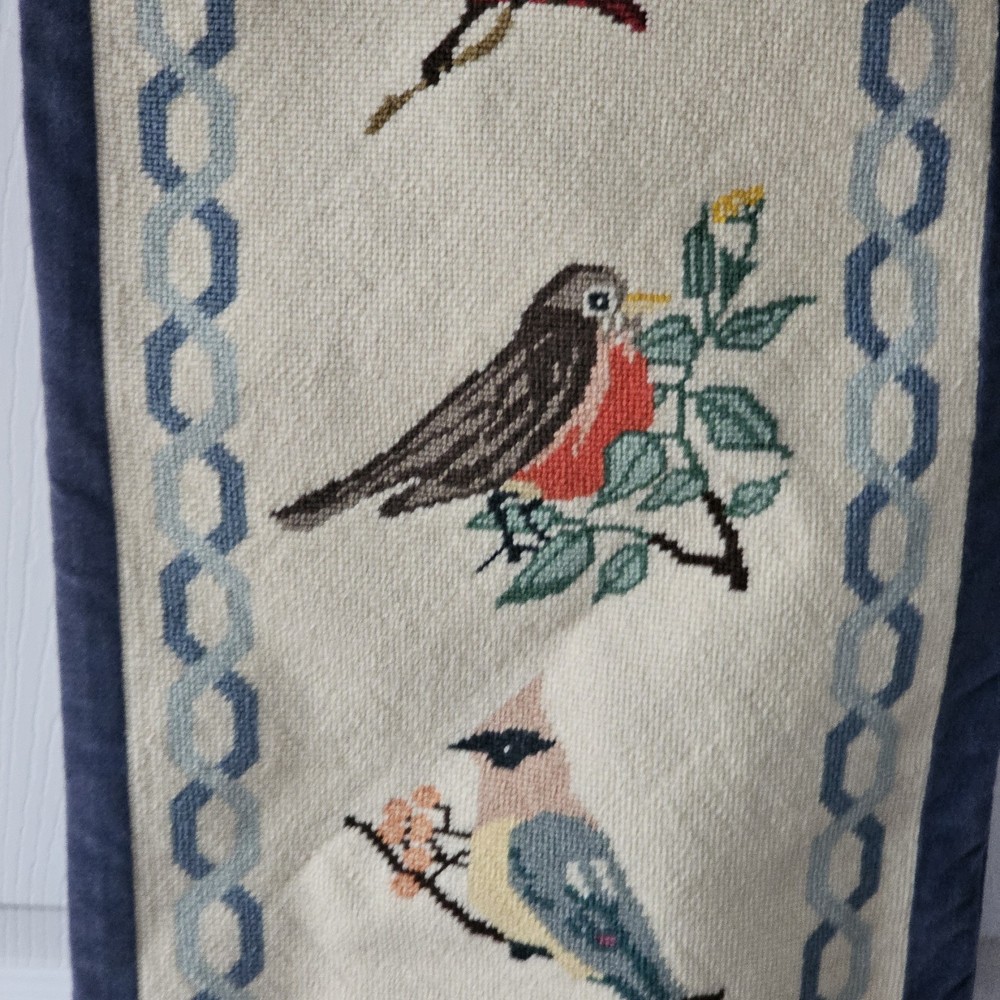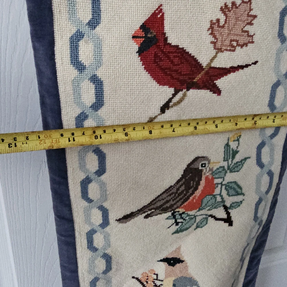 This handmade Birds Needlepoint Cross Stitch Wall Hanging features intricate needlepoint embroidery on a velvet border, creating a beautiful and unique piece for your home decor. Measuring 50x12 inches, this wall hanging showcases the craftsmanship and attention to detail that comes from handmade work. Perfect for adding a touch of artistry to any room, this cross stitch piece adds a charming and elegant touch to your space. Some scratching on wooden ends. Velvet backing. See photos for imperfections sold as is
