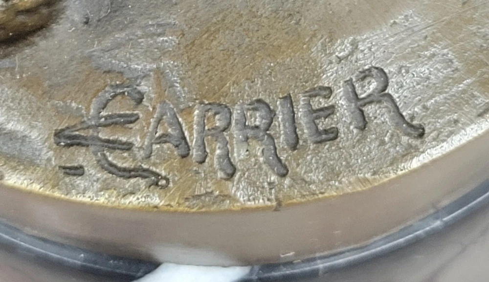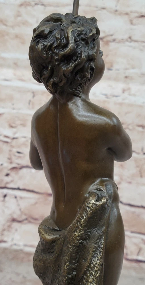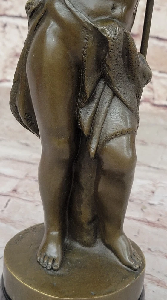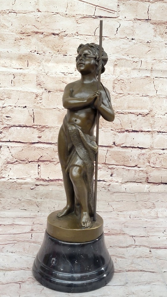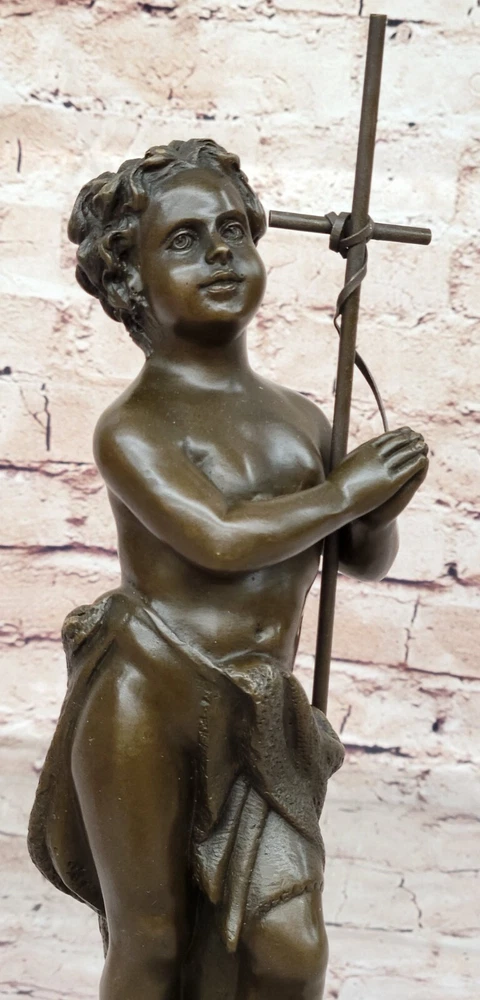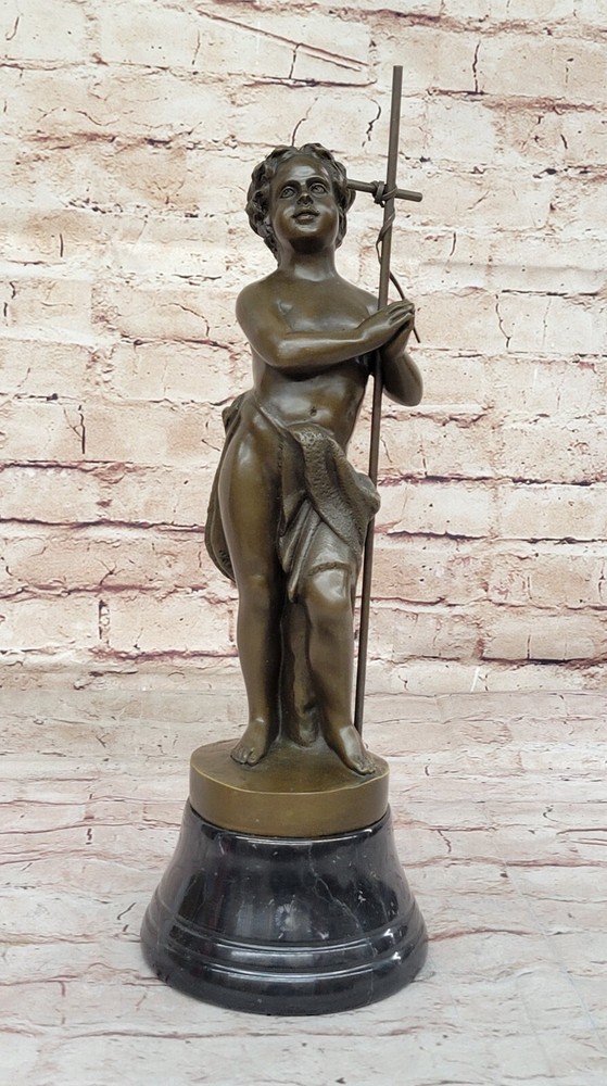 . Condition : This sculpture is in perfect condition. Bronze Dimensions with Marble Base: Height 15" X Width 5" Marble Dimensions: Diameter 5" Height without base: 13" Weight: 10 LBS Inventory: 9838B10389 In this poignant bronze sculpture, a young boy stands with praying hands and peaceful eyes, serving as a messenger of God. The figure holds a tall cross in the crook of his arm, symbolizing his commitment to spreading the word of God. The brown patina of the sculpture, with subtle touches of gold in his curls and along the sash around his waist, adds warmth and depth to the portrayal. The meticulous craftsmanship is evident in the careful sculpting of the boy's body, capturing details such as the cut of his stomach, the definition in his arms, the curve of his spine, and the bend in his knee. The figure's upward gaze conveys a sense of divine connection and reverence. Additionally, the intertwined cross that he leans on is a removable element, adding versatility to the sculpture's presentation. Crafted using the Lost Wax Method, this sculpture is a 100% handmade masterpiece. It stands on a wide round black marble base, enhancing its visual appeal and stability. The artist Carrier's signature adds a final touch to this expressive and spiritually resonant work of art. SOLID GENUINE BRONZE CATHOLIC CHURCH SAINT BAPTIST ALTAR SCULPTURE FIGURINE www.bronzhaus.com Video will open in a new window Using the eBay App? Paste link into a browser window: [isdntekvideo]