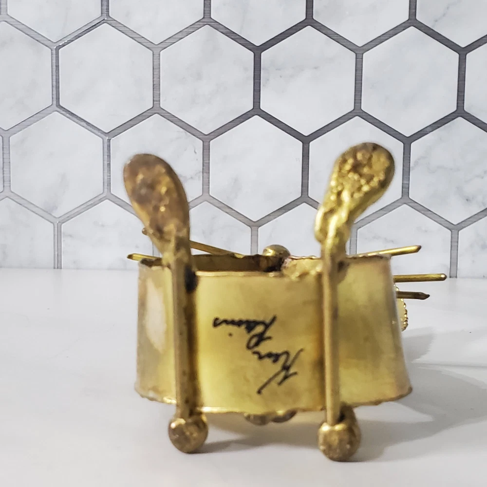 Vintage solid brass monkey playing mandolin on pedestal figurine