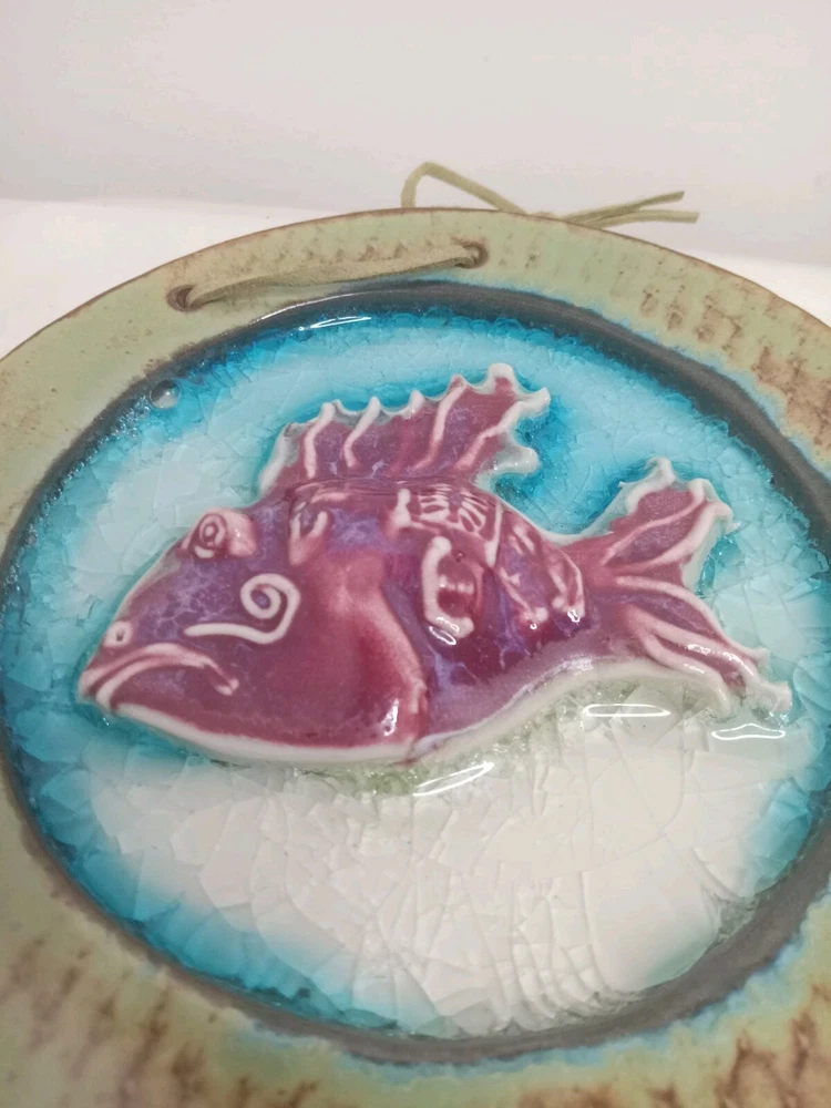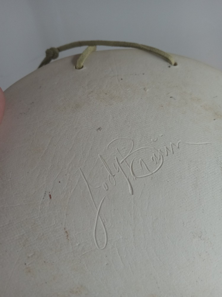 Hand Made Ceramic Clay Wall Hanging Fish Koi Circle Tile Signed Jody Braun? Approximately 15 cm (or 6") across. Signed on the back Jody Braun (as far as I can read). Very nicely glazed with a cracked effect for the water. I would guess this is a 2000s piece, although I was unable to find anything on this artist, so that is unconfirmed. A lovely addition to any collection.