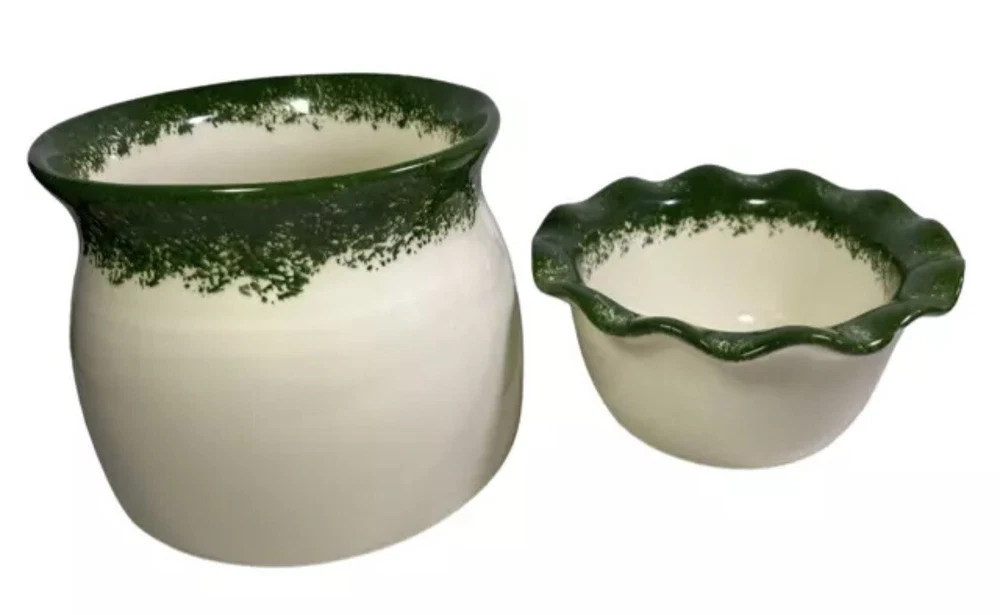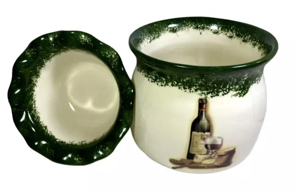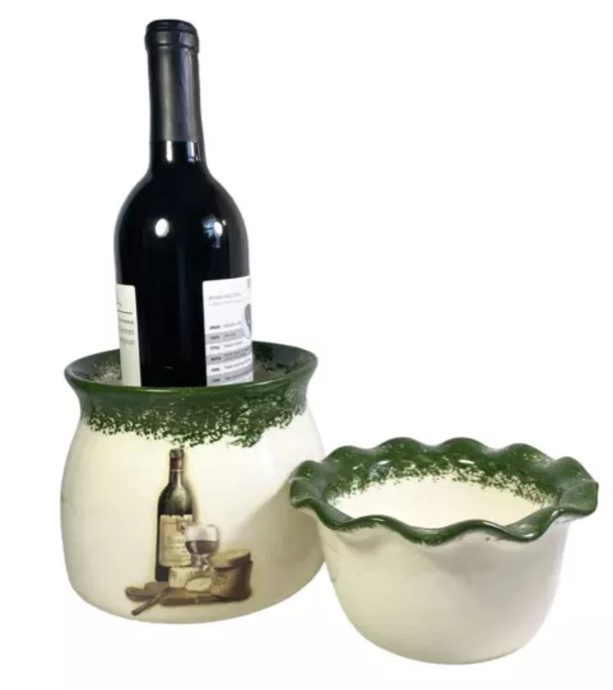 This is a handmade ceramic wine chiller or dip cooler. The round-shaped chiller is designed with an ivory and green color pattern, and it features an impressed backstamp. It is made of ceramic and finished with a glaze. The chiller is dishwasher and microwave safe, and it weighs 3.5 lbs. The set includes two pieces, and it is part of a handmade product line. It is suitable for contemporary wine serving and is produced using art pottery techniques in the United States.