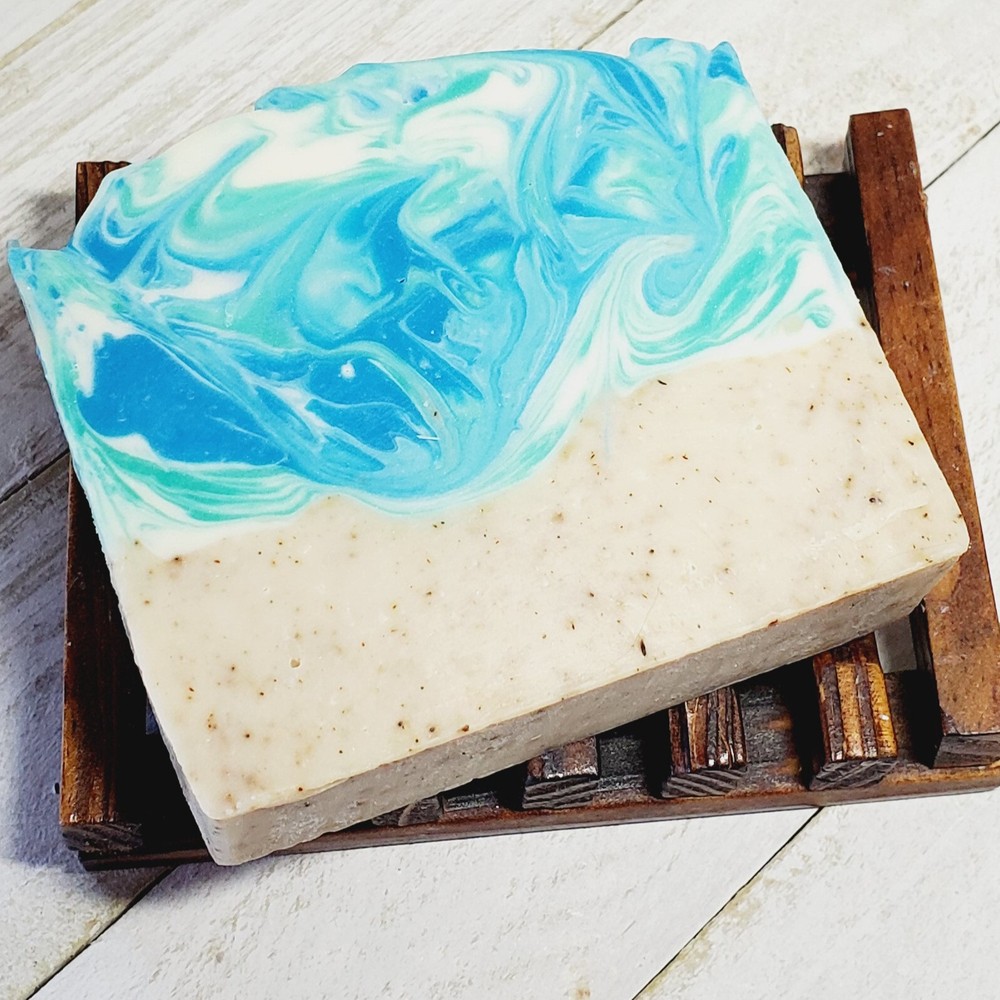 LIFE'S A BEACH smells of Sea Salt, Moss, Jasmine and Mandarin. A 5oz Body bar Handmade in the USA with Organic and Food Grade Ingredients: Coconut Milk, Aloe Vera Juice, Olive Oil, Coconut Oil, Lard, Palm Oil, Castor Oil, Avocado Oil, Cocoa Butter, Shea Butter, Hemp Seed Oil, Beeswax, Kaolin Clay, Jojoba Oil, Colorants. LIFE'S A BEACH was made with the Blues and Greens from the Ocean - with your toes in the Sand. Formulated to be a Moisturizing Body Bar for Him or Her. This is cold process soap, made in small batches with food grade and/or organic ingredients, formulated to provide you a creamy lather with extra Shea and Cocoa butters for Hydration and Moisture. Each batch is unique; Because of this your bar may differ slightly from the pictures above.