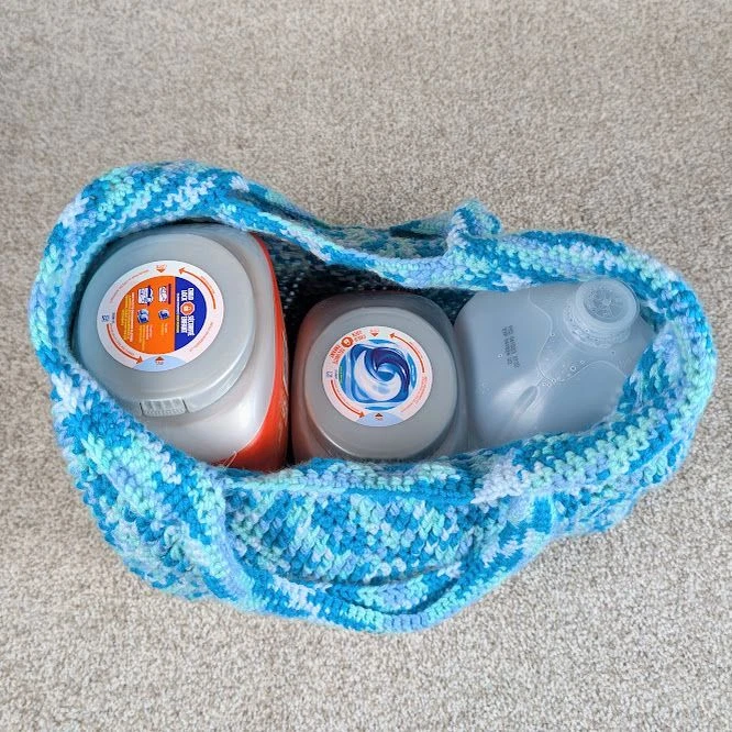Looking for a way to cut down on plastic bag use? Grab one of my grocery totes and carry more in every bag! My grocery totes are strong and flexible. I can fit 2 gallons of milk in one of my totes and carry it up a flight of stairs - no problem! No more bags breaking because it snags on the edge of a box. No more paper bags falling apart when it gets wet. And the best part? My bags are machine washable and dryer safe. I use these bags every week and it amazes the grocery store clerks how much can fit in 1 bag. The bags are my own design and made from yarn used to standing up to abuse. Each bag is 14" tall (without the handle) and 17" wide. That's a lot of stretch! Hand Crocheted in a Smoke Free/Cat Friendly Home - Cats are not allowed to play with yarn. Keywords: crochet bag, handmade tote, blue tote bag, wave pattern, beach bag, market bag, summer bag, handcrafted, crochet tote, textile bag, boho bag, casual tote