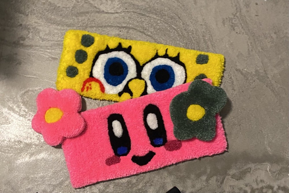 This is a handmade rectangular area rug with a size of 20" x 7", designed as a keyboard wrist rest. It is crafted from pink acrylic yarn, featuring a unique keyboard pattern inspired by video games. The rug is anti-slip and suitable for use in any room. Care instructions recommend spot cleaning only. It is a custom tufted piece, perfect for teens, adults, and kids who enjoy gaming or colorful decor.