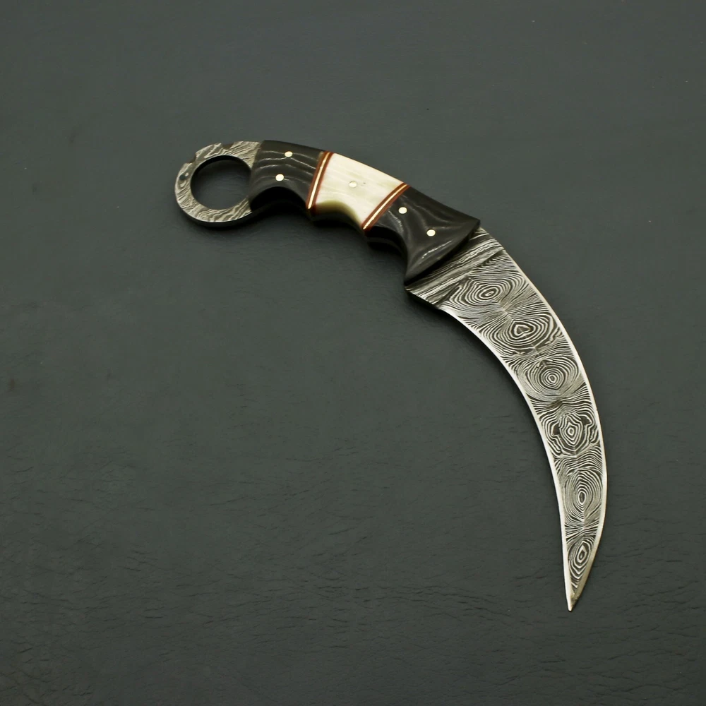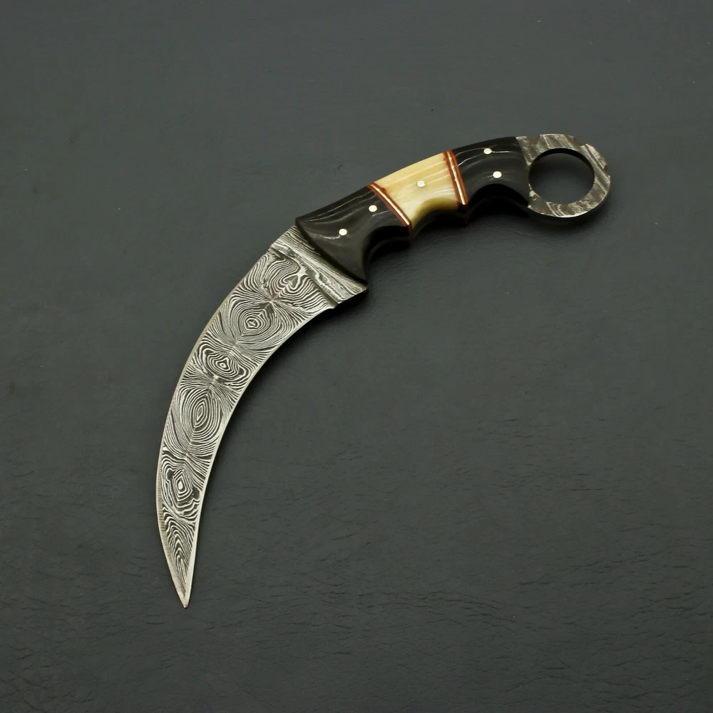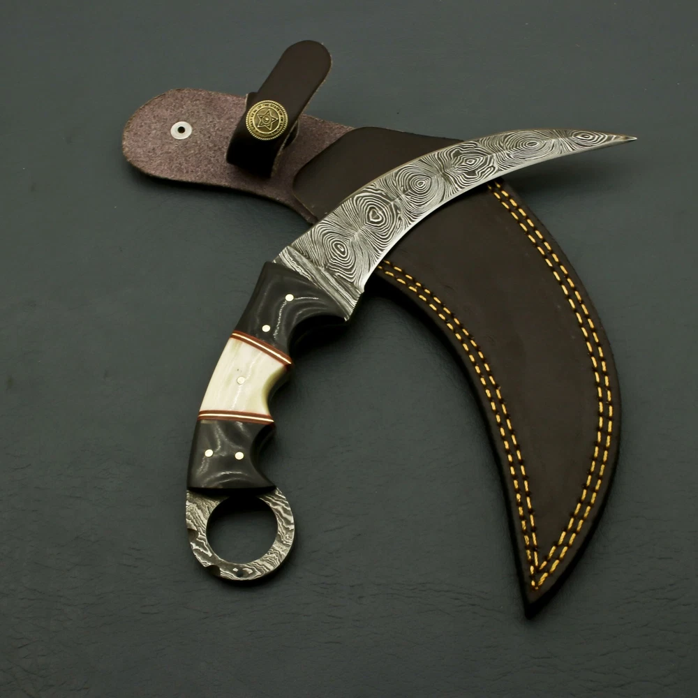 beautiful handmade damascus huntign karambit knife handle made of camel bone Vision & Mission of SuperSharp Steel total lenght 9" blade lenght 4.5" handle lenght 4.5" comes with leather sheath SuperSharp Steel was founded in 2015. We are manufacturers of Damascus Steel, Stainless Steel, D2, High Carbon Steel Knives and Folding Knives. Our Blades contain 1095 & 15N20 High carbon tool steel and hardness of 58 to 60 HRC after heat treatment. Our Products are hand made by skilled artisans and craftsmen, which reflects excellence in itself. Our unmatched quality of products set us ahead from our competitors in the international market. All the products are delivered within the stipulated time frame and checked by our quality experts to ensure complete satisfaction of our customers. Quality Control: From the selection of the finest raw materials to exacting and rigorous steps taken to maintain quality control during each phase of production, there is a lot of craftsmanship that has gone into every SuperSharp Steel knife, transforming a simple cutting task into a uniquely pleasurable experience each and every time. Rockwell testing equipment (HRC) is used to maintain strict control over the all important hardening process. Resistance to corrosion and cutting edge superiority are entirely dependent on this precise heat treatment process. To ensure optimum performance, our sharpness testing machine is used on every knife blade that we manufacture, guaranteeing the best possible performance with every knife. Throughout the production process, proper grinding and honing angles are continuously monitored with a laser angles control unit. The quality of steel: Quality knives require a very specific grade of steel to insure proper forging, tempering and hardening. All SuperSharp Steel knives are made of the finest quality steel. Our commitment to quality insures durability, strength and longevity of each blade that is made. The forging process the way which the knife is forged and tempered is as important to the process as the quality of the steel that is used, Forging is the process of heating steel to a red-hot state prior to applying a powerful blow to form a forged blank. Variations: As all Damascus Steel patterns are made particularly in proper way but it is not possible to get the same layers compaction all the time, So keep in your mind when you purchase our Damascus knives there may not be exactly as shown in Photos but you will always find a quality knife. Questions If you have any questions feel free to send us message we aim to answer all questions within 12 hours. Feedback As we are confident what we make, however If you are not satisfied with our services please contact us before leaving any negative or neutral feedback. We will resolve all issues as quickly as possible. Disclaimer: We are not responsible for any injuries associated with the use of our tools. Our products are intended for legal use only by responsible buyers. Therefore, we will not sell our products to anyone under the age of 18. Before bidding please check your country laws as some countries Custom don't allow this. If your purchase is held by Custom Authorities in your country/State we will Not be responsible for that and no refund will be issued. Complimentary gift messages *Gift wrapping service available for minimal additional fee ADD ONS: *Custom orders for 10 or more pieces. You can choose & submit your own handle or design. LIFETIME WARRANTY No premium knife is complete without a lifetime warranty; our masterpiece knife is fully covered for life, We do sell wholesale, please contact us for special discounts on bulk orders. FEEDBACK POLICY: YOUR FEEDBACK IS VERY IMPORTANT FOR US, IF THEIR IS ANY KIND OF PROBLEM PLEASE GIVE US OPPORTUNITY TO SORT THE ISSUE