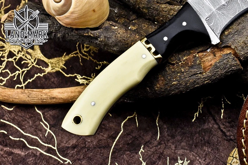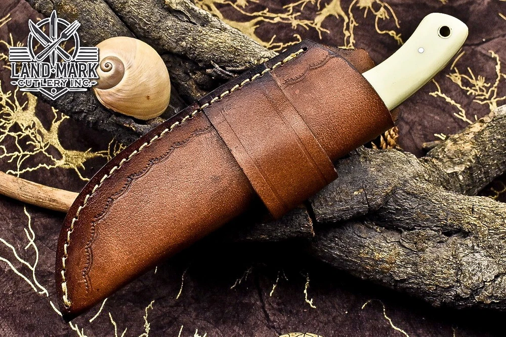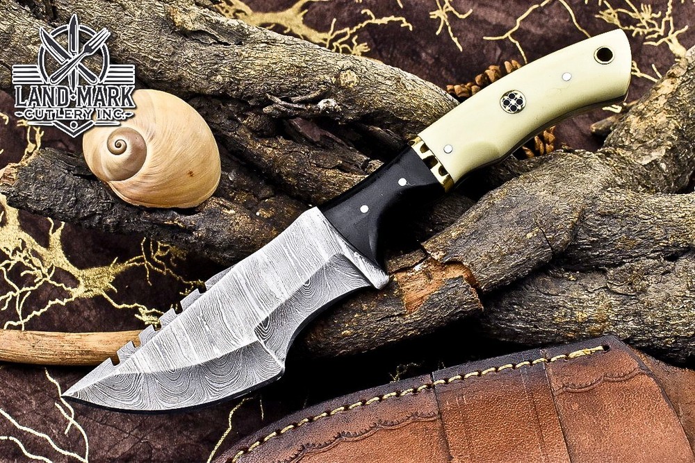 Custom Hand Made DAMASCUS STEEL HUNTING TRACKER KNIFE WITH MASLA SHEET AND BONE BOLSTER HANDLE We offer a shipping discount for More then one purchased . And discount will be apply on combine invoice, Discount will not apply on separate payment. ITEM DETAILS OVER ALL LENGTH 9.0 inches long (Approx) HANDLE LENGTH 4.5 inches long (Approx) BLADE LENGTH 4.5 inches long (Approx) BLADE HARDNESS 58-60 HRC Which Holds The Sharp Edge For Long Time. HANDLE BONE AND SHEET COVER LEATHER SHEATH This Awesome custom made KNIFE has a nice hand forged with the combination of 4340 & 1080 steel. HOW OUR DAMASCUS IS MADE: All our Damascus is real and not just an acid etch. Damascus is a mixture of 1080HC and 4340 nickel carbon. You heat them up together and then fold the bar over and over to get the desired layers, ours are 396 layers. Then you burn the blade in acid, and it turns the nickel satin color and the high carbon turns blackish gray. This is how the layers are exposed to show the layers of the new steel created coined "Damascus". All Damascus is acid etched to show the layers. If you high polish the metal it will be shinny satin like all steels. Only after you burn the sides of the blade with acid do you see the layers of the two steels. Makes sense? After we make our knives we high polish the handles and put an edge on the blade. The high polishing buffs off the acid burned layer of the handle, and the blade edge is sharpened and the acid burned edge becomes satin. You can re-burn the tang of the blade near the handles and the edge of the blade and it will show the layers once more. All our knives are hand made, durable and unique ***** YOU WILL RECEIVED THE SAME KNIFE Qality Standards Our Damascus blades are made from high quality non-stainless steels which rival or exceed any Damascus blade made from the 10 series with 4340. Our Damascus combination has taken years to perfect and has been tested under a variety of application which will offer professional performance in categories of toughness, strength (lateral stress) and edge honing and holding ability. In a 5 spot Rockwell test our blades will average near or close to 58 which offers a perfect balances between its toughness and strength.Our blades due to carbon content need to be regularly treated with wax and/or 3 in 1 oil to maintain its superior quality. Questions if you have any question feel free to send us message we aim to answer all questions within 24 hours Feedback If you are not satisfied with our service please contact us before leaving any negative or natural feedback. We will resolve all issues as quickly as possible. Disclaimer We are not responsible for any injuries associated with the use of our tools. Our products are intended for legal use only by responsible buyers. Therefore, we will not sell our products to anyone under the age of 18. Before bidding please check your country laws as some countries Custom don't allow this. If your purchase is held by Custom Authorities in your country/State we will not be responsible for that and no refund will be issued Shipping We offer a 20% shipping discount for More then one purchased . And discount will be apply on combine invoice, Discount will not apply on separate payment We ship within 24 hours after receiving complete payment but this can be delayed due to week ends or Governments and Religious Festivals . . This is beyond our control and we apologize for this inconvenience. Precautions Our Tools are very sharp so open and use them very carefully We are not responsible for any injuries associated with the use of our tools Tips to Care knife 1. NEVER STORE YOUR KNIFE FOR LONG TIME IN LEATHER SHEATH. 2. LEATHER CAN ABSORB WATER, WHICH WILL RUST THE KNIFE. 3. ALWAYS CLEAN THE BLADE AFTER USING WITH OIL OR WAX