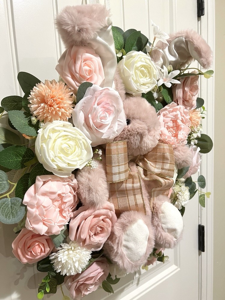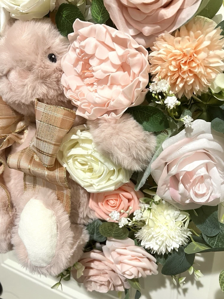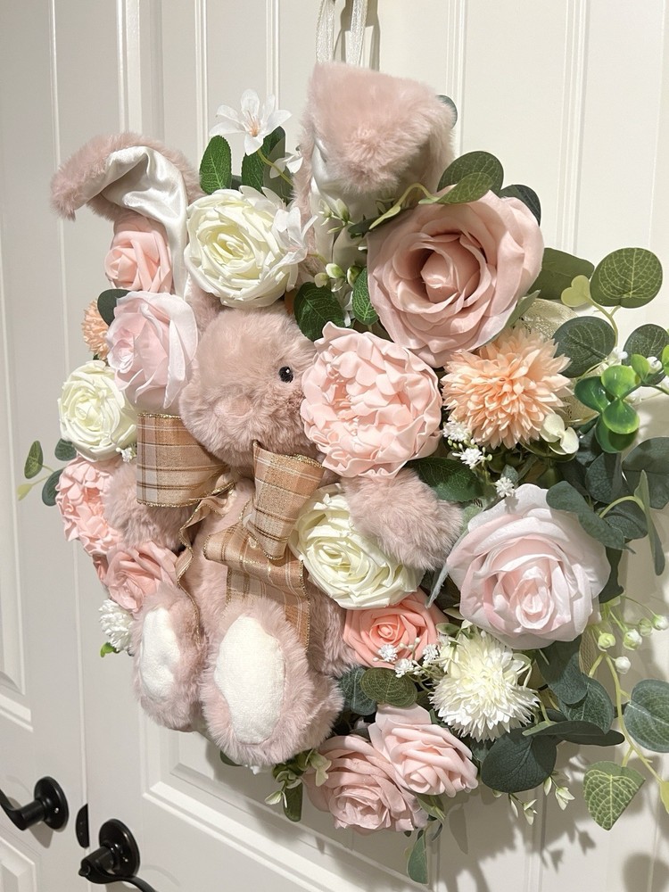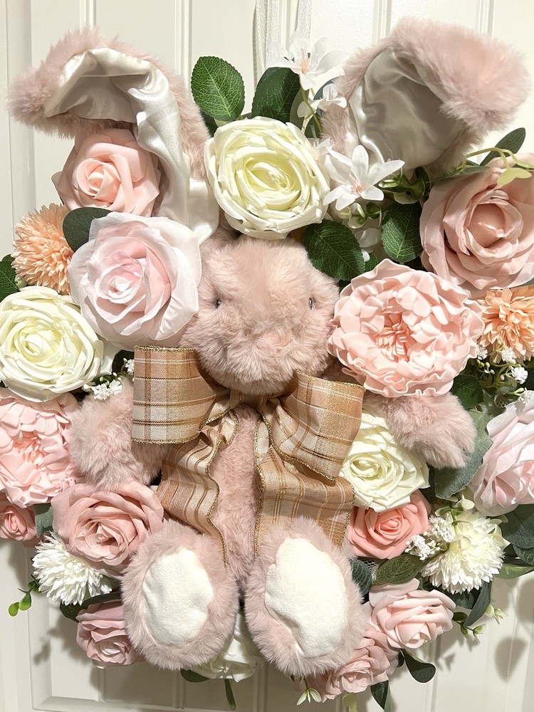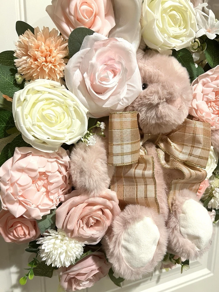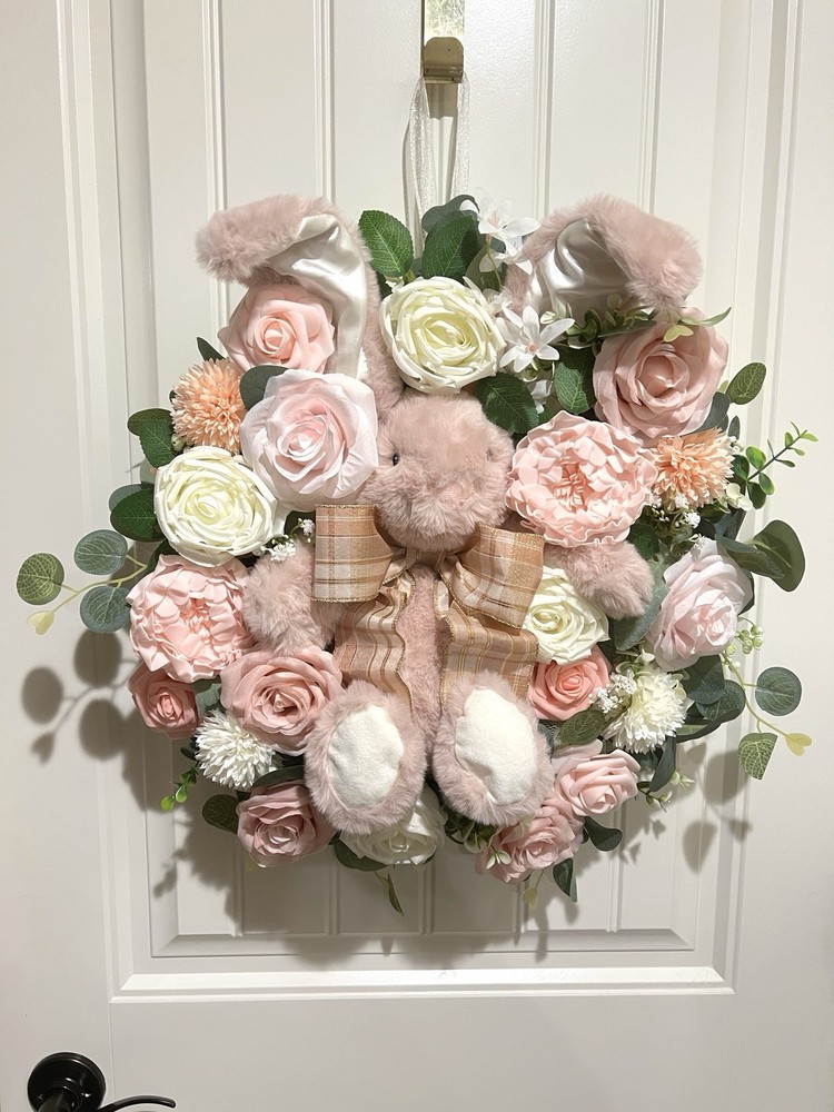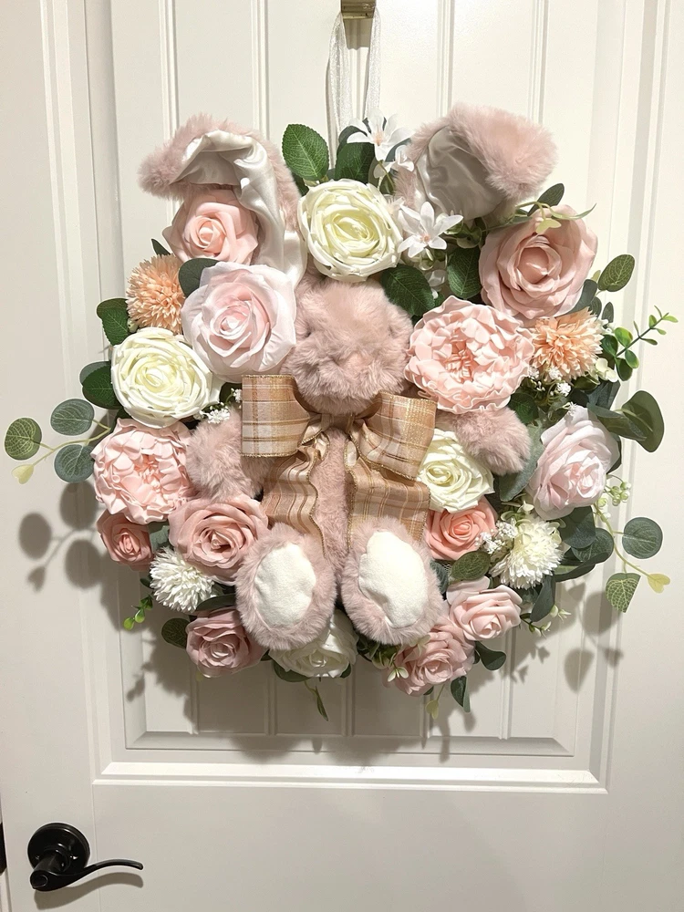 About 22 inches across (this accounts for the spray), 5 inch-deep (6” with ears) door or mantle. Has mesh back to add to fullness. Spring themed w/ vibrant colored silk/ foam flowers. An adorable plush bunny with a rose golden bow is embedded within the flowers. This wreath is built on an 14 inch frame. Perfect for decorating your home for Easter/ Spring. Wreath made in a smoke free environment. Wreath can be displayed either indoors or outside. However, for optimal durability please avoid direct sunlight and harsh elements. Ships in a sturdy box that will be closer to frame size. On arrival you may need to fluff ribbons and bows. W6Sg14D213499