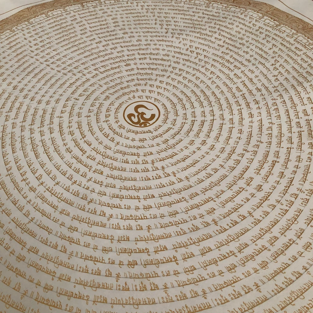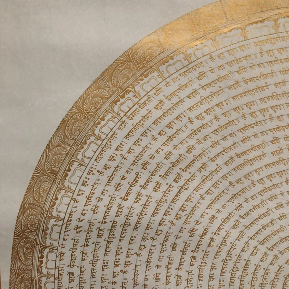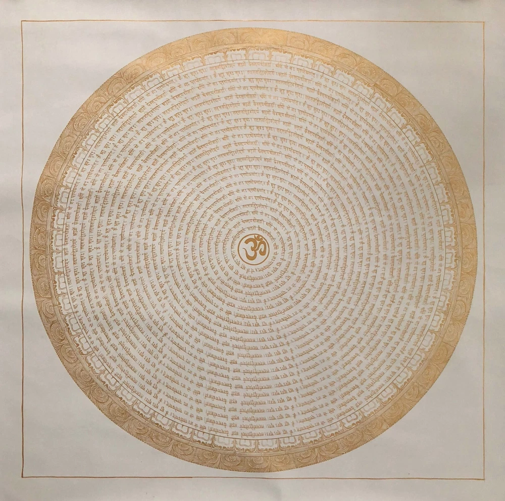 Namaste and Welcome to my Gallery!!! All of the paintings and arts in my gallery are originally handmade and hand-painted by my family members and other local artists who have been practicing their craft for over two decades. My father is Master Artists Nepal with an experience of more than four decades; you can see some of his work in this Gallery. Also you can see some of the beautiful and soulful artwork of talented local artists from Himalayas. ~~Gyatri Mantra Mandala Thangka~~ Om Bhur Bhuvaha Svaha Tat Savitur Varenyam Bhargo Devasya Dhimahi Dhiyo Yo Nah Prachodayat (Repeat) 1. Why is Gayatri Mantra Chanted? It is believed that by chanting Gayatri Mantra, you achieve success and happiness in your life. With regular chanting of the Gayatri Mantra, one can firmly establish and stabilize the mind. The mantra is a declaration of appreciation, to both the nurturing sun and the Divine. 2. Who is Gayatri? Goddess Gayatri is additionally called "Veda-Mata" or the Mother of the Vedas - Rig, Yajur, Saam and Atharva in light of the fact that it is the very premise of the Vedas. It is the premise, the truth behind the accomplished and the cognized universe. Goddess Gayatri is known to eliminate darkness by imparting light in minds. 3. What are the benefits of chanting the Gayatri Mantra? o Regular chanting of Gayatri Mantra improves concentration and learning o It is known for removing toxins from the body o It improves breathing and functioning of the nervous system o It keeps your heart healthy and removes the negativity o Chanting of Gayatri Mantra calms the mind It reduces stress and anxiety 4. When is the best time to chant Gayatri Mantra? According to Vedas, has three qualities: satva, rajas, and tamas. (Purity, passion and inaction) o 4 to pm to 8 pm have the satvic Quality o 8 am to 4 pm are rajasic o 8 pm and tamasic Satva is the best time to chant the Gayatri Mantra. Hence, the Gayatri Mantra should be recited 4 am and 8 am and 4 pm and 8 am. [Size = 80cm x 80cm] Material Used: • Cotton Canvas • Natural Pigments and colors • Gold leaf ~Excellent for meditation or home/office décor, ~Yoga Wall Art ~Genuine 100% hand-painted from Himalayas Please feel free to contact me if you have any question regarding the painting.