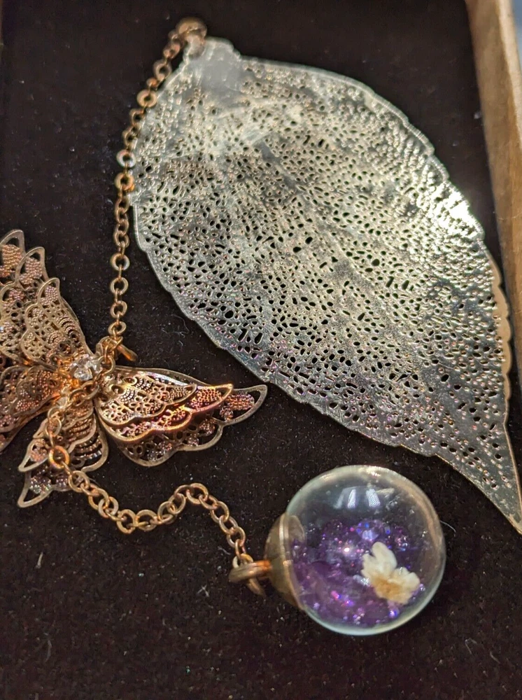Handmade Gold Tone Metal Leaf Butterfly Glass Ball w/Purple Rhinestone Bookmark. Pre-owned but I don't think this was ever used. This bookmark is very pretty. There is a gold tone leaf, a copper-colored 3D Butterfly with a rhinestone in the center and a clear glass ball with purple rhinestones and a dried flower inside. It is in the original box which had tape all over it when it was purchased so it does show a little shelf wear. Please see the photos. All of my items are carefully packed for shipping, no matter their value - $5 items are wrapped with the same care as a $200 item. My goal is to have your purchase arrive safely. Large, heavy and fragile items are harder to use combined shipping with but just ask if you would like to purchase more than one item and I am more than happy to do so if feasible. Measurements are approximate or as close as I can get. Also, the color you see many not be the exact color depending on your computer or phone settings. Unpaid items will result in the buyer being blocked from further purchases. Please remit payment right away so we can get your item shipped out quickly.