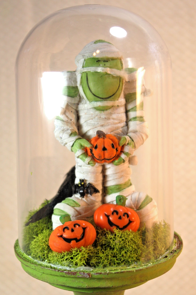 This handmade Halloween cloche on a pedestal features a cute Frankenstein monster mummy with several smiling pumpkins, perfect for adding a festive touch to your home decor. The figurine stands at 12.5 inches tall, with a creepy style and clear glass finish that adds to its appeal. The green color and detailed design make it a unique and eye-catching piece for celebrating Halloween in style.