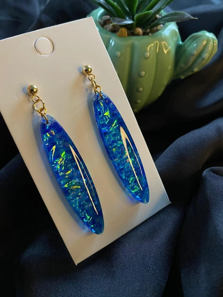 Elegance meets modern craftsmanship with these Handmade Holographic Gold Plated Resin Earrings. Featuring an oval shape and a playful tassel style, they're designed to add a touch of movement and shine to any outfit. The blue resin material provides a vivid pop of colour, complemented by the warm hues of the yellow gold plating. These earrings are thoughtfully crafted with comfort in mind, suitable for lobe decoration without the distraction of a main stone. Each piece is a unique creation, testament to the artistry of handmade jewellery. They're a versatile accessory that seamlessly transitions from day-to-evening wear, making them an ideal choice for those who appreciate subtle yet striking details.
