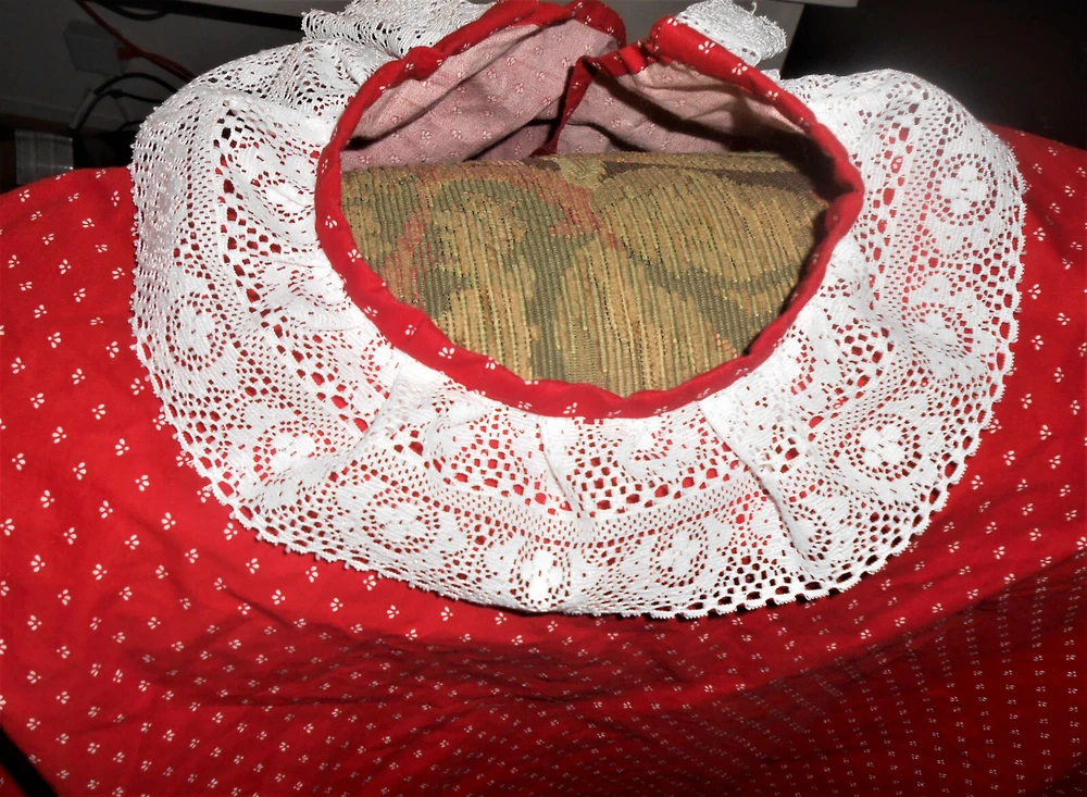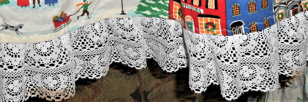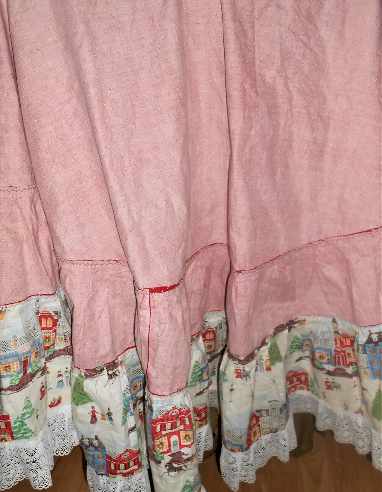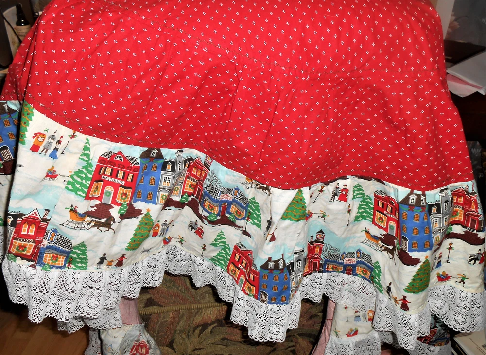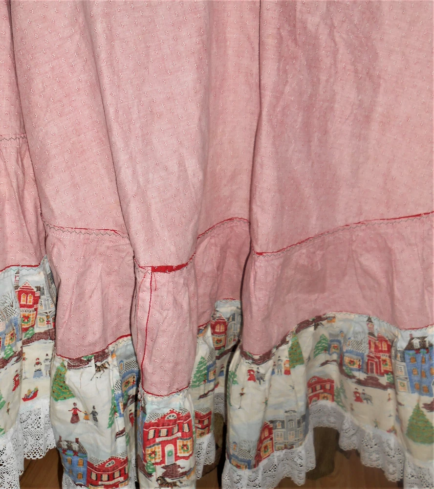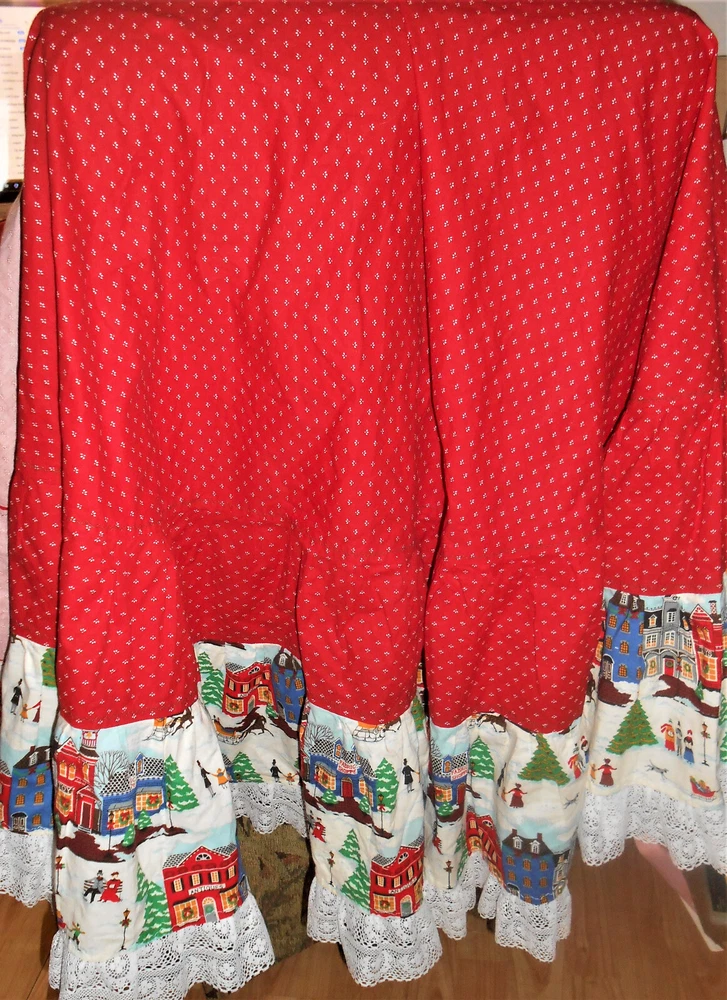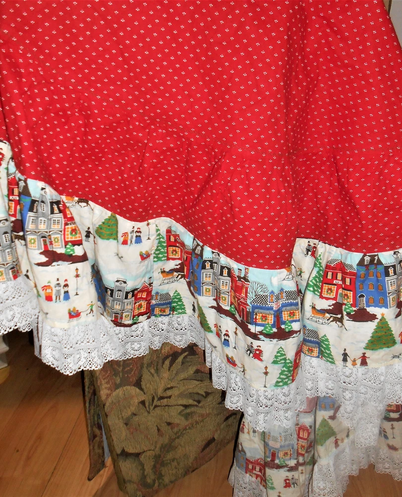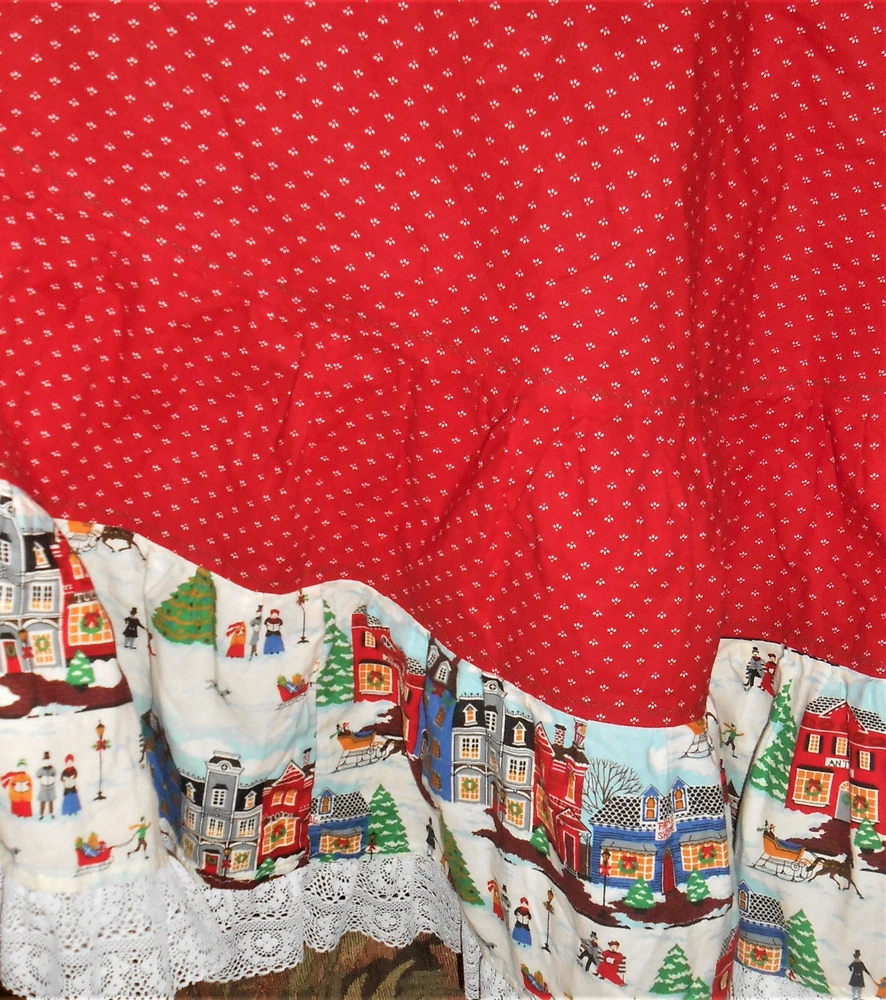 Fantastic find: this handmade tree skirt that features classic red and lace with home town scene! Very good, clean condition; stored carefully. Size is large. cotton fabric, lace is double tiered white. Measures approx 4 1/2" diameter at top x 62" diameter at lace edge. See photos for all the details. Always smoke-free.. Please see all my listings for clothes, accessories and unique finds!. Shipping is always combined when possible.