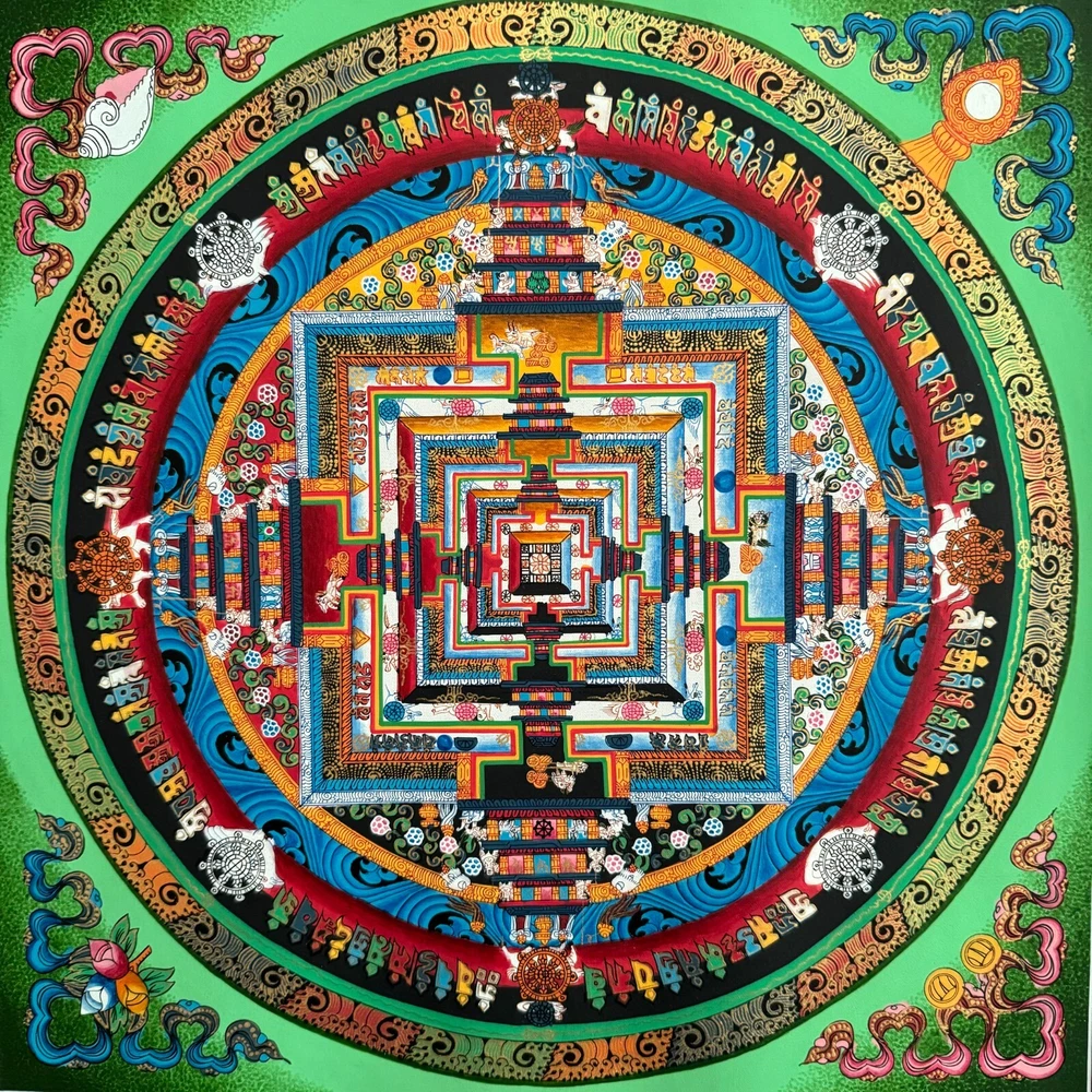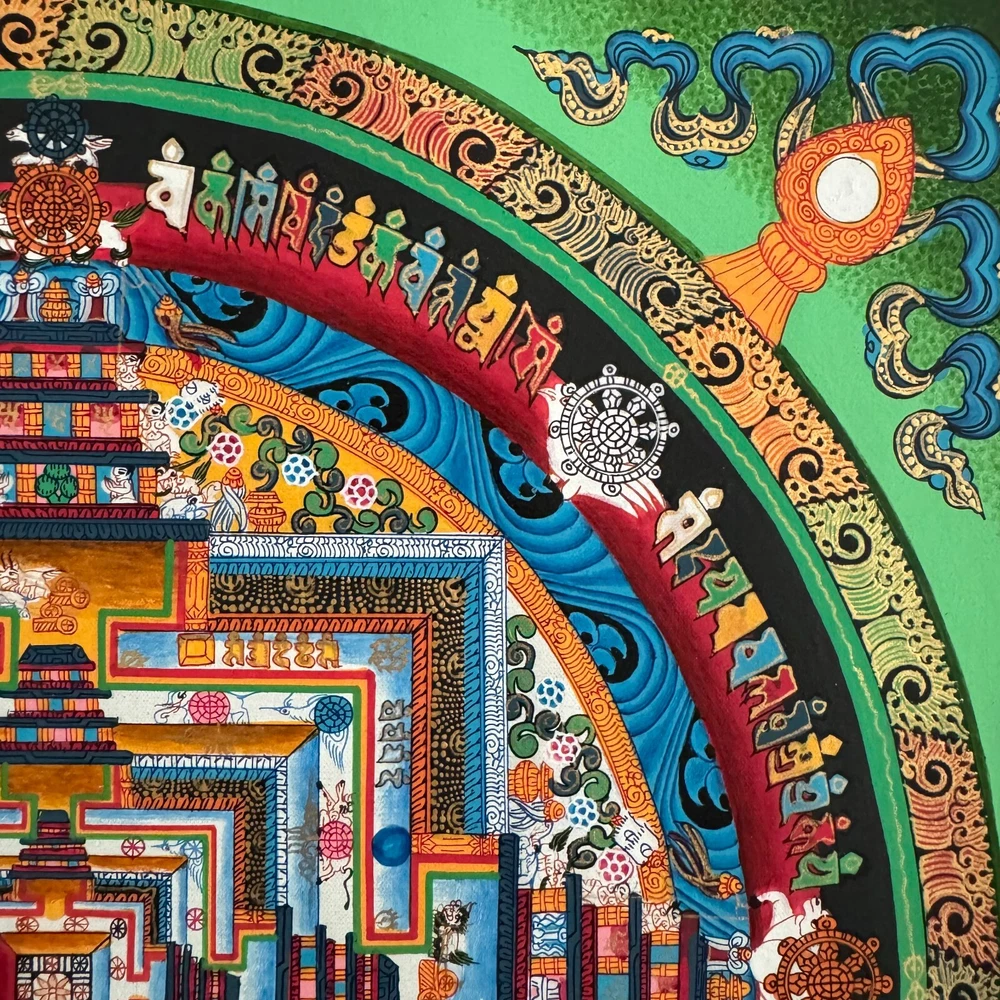 Namaste and Welcome to my Gallery!!! All of the paintings and arts in my gallery are originally handmade and hand-painted by my family members and other local artists who have been practicing their craft for over two decades. My father is Master Artists Nepal with an experience of more than four decades; you can see some of his work in this Gallery. Also you can see some of the beautiful and soulful artwork of talented local artists from Himalayas. ~~Kalachakra Mandala Thangka~~ Kalachakra Mandala is a Sanskrit word for “wheel of time”. The mandala of kalachakra is aerial view of the kalachakra temple, situated in Lhasa and contains 722 Deities, and at its heart on a Lotus flower, a single Buddha: Kalachakra. It is a 5 level structure, each level is represented by a square, and each square is set within the others. In mandala there are six circles of elements: wisdom, space, wind, fire, water and earth. Then we get to different entrance of the body, speech and mind. [Size = 37cm x 37cm] Material Used: • Cotton Canvas • Natural Pigments and colors • Gold leaf ~Excellent for meditation or home/office decor, ~Tibetan Yoga Wall Art ~Genuine 100% hand-painted from Himalayas Please feel free to contact me if you have any question regarding the painting.