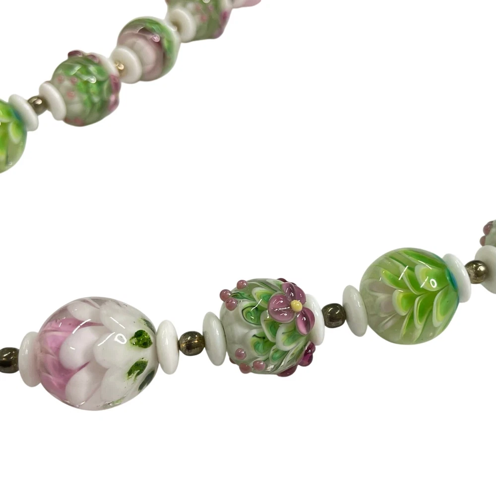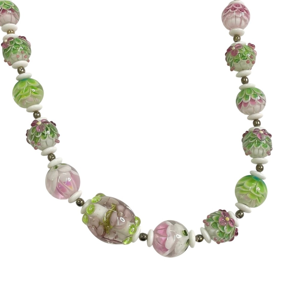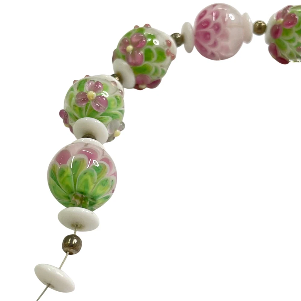 Handmade Lampwork Pink Green White Flowers Petals Raised Glass Artisan Bead Set for Jewelry Making Beautiful set of pink, green, and white Flower & Petal matching beads; some with detailed raised designs. Main beads are round and there is 1 focal barrel bead. Beads are already strung and could be made into necklace with clasps/closings or used for other jewelry projects. There are also small white disc and round gold tone spacer beads. 4 oz total. *Beads are part of a HUGE collection of Lampwork Beads. I will be listing more beads over the next few weeks/months. I offer combined shipping on multiple items. Just message me before checkout and I will send you an invoice with discounted shipping. Thanks for looking!