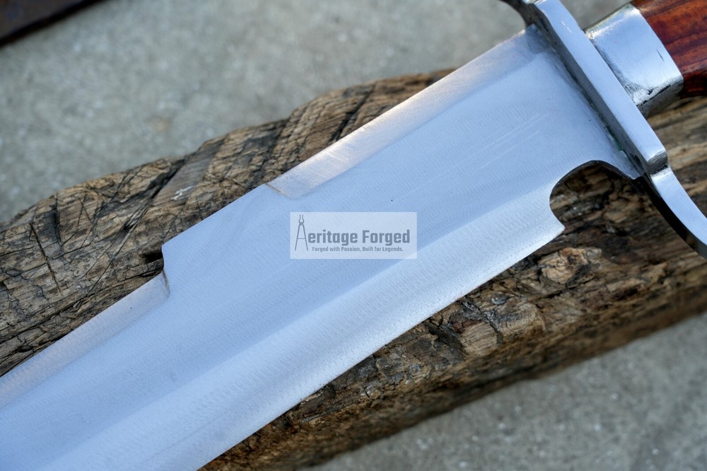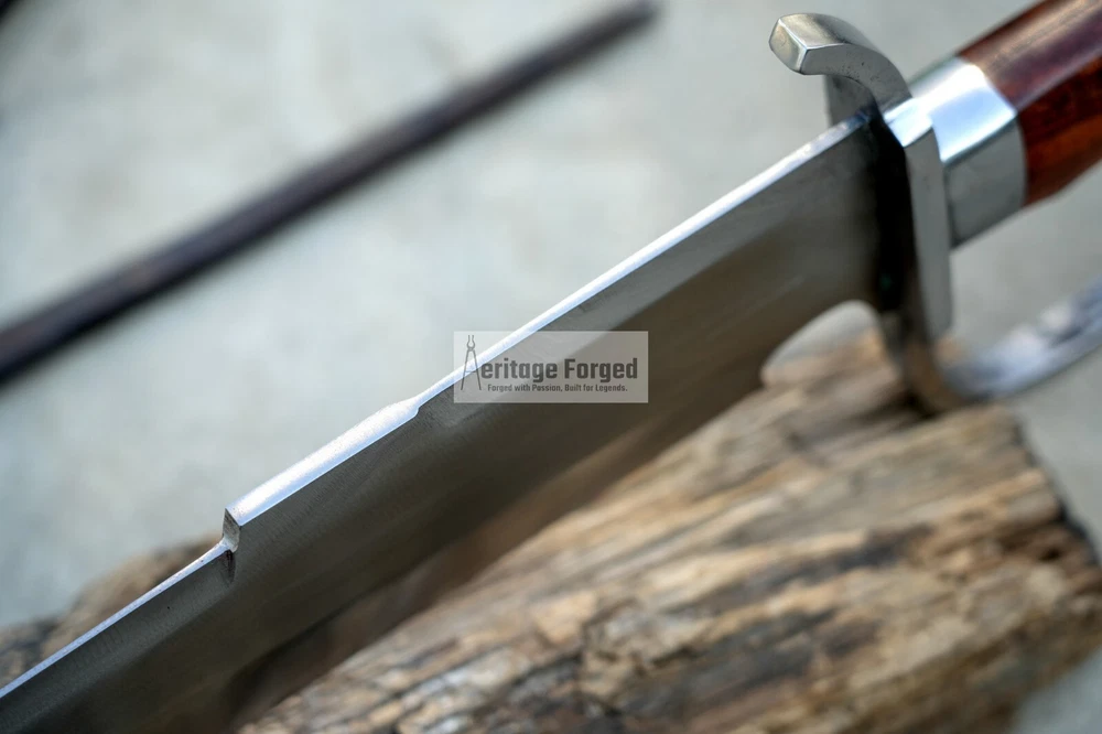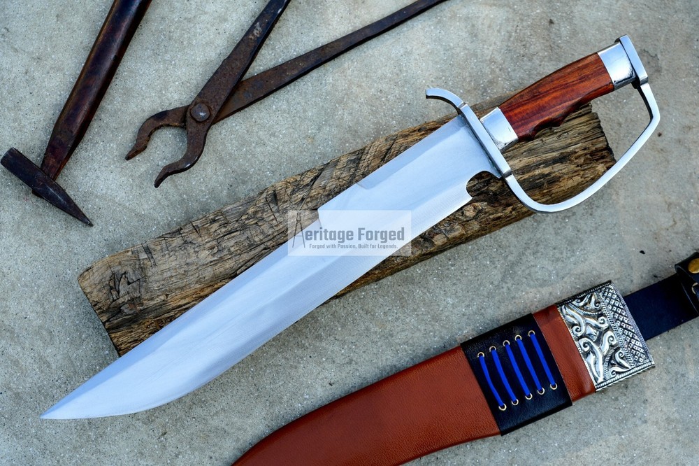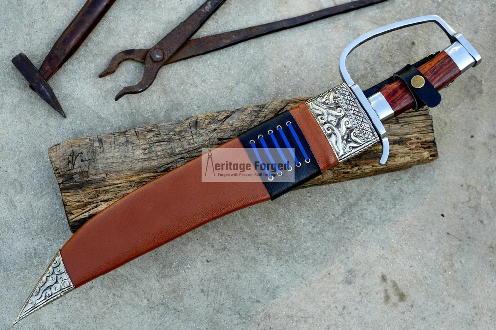 My blades are meticulously hand-forged from high-quality 5160 leaf spring steel, a material renowned for its durability and resilience. Using traditional forging techniques, each blade undergoes a rigorous crafting process that ensures both strength and precision. After shaping, the blades are tempered with water to achieve optimal hardness and flexibility. The final product is sharpened to a keen edge, making it ready use. This combination of traditional methods and modern steel technology results in blades that are both reliable and enduring, designed to perform exceptionally in a variety of tasks. Product Specifications: Blade Length: 16 inches Handle Length:6 inches Total Length: 22 inches Blade Weight:990 Grams Handle Material: Rosewood Leather Scabbard. 5 inches MUK knife included