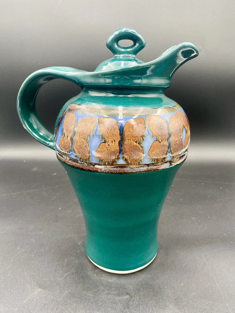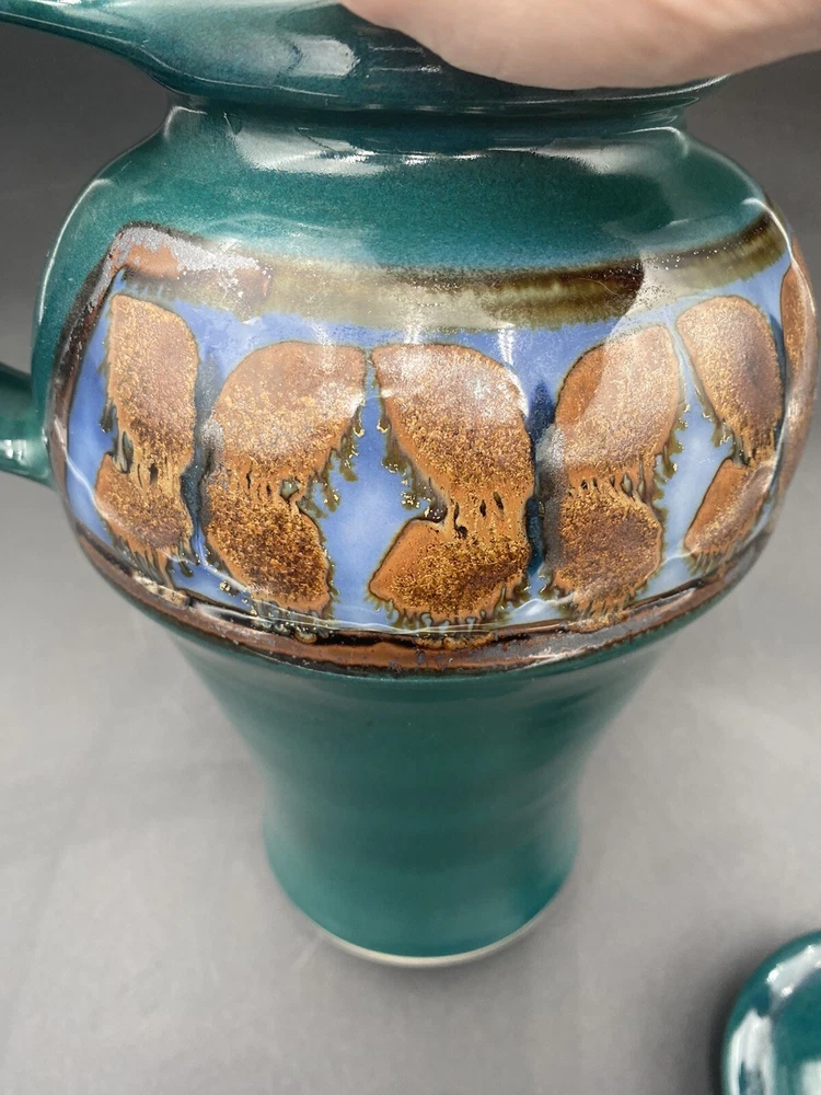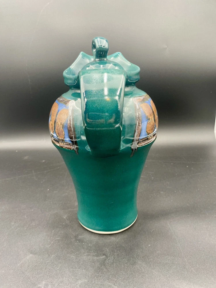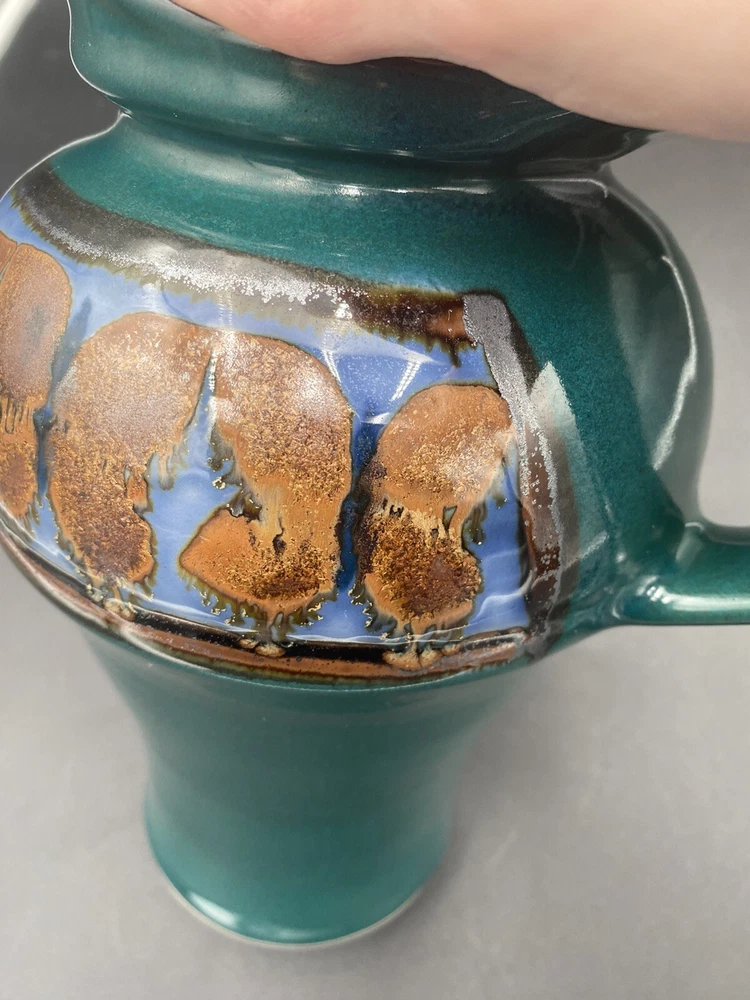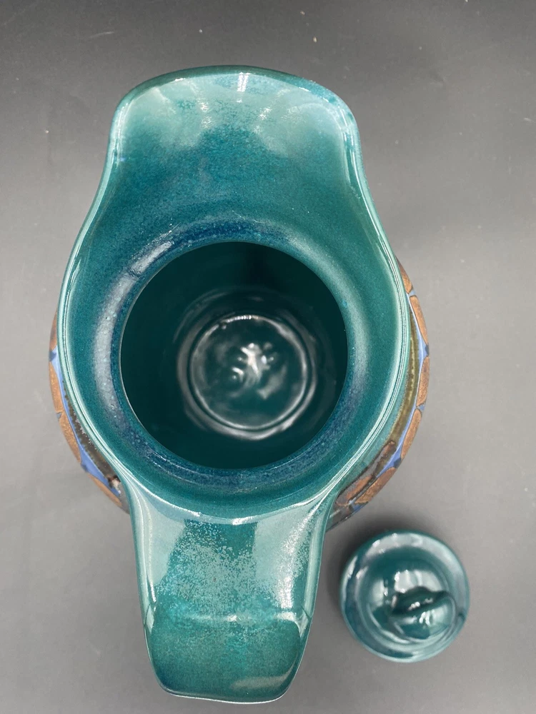 This large handmade teal green stoneware pitcher with lid is a beautiful addition to any home decor. Made by Seagrove Pottery in North Carolina, this pitcher features a ring of copper & brown drip glaze butterflies against an opalescent deep sky blue background. The ring is framed with copper, black and silver. The looped lid adds a unique touch to this original piece and seals the pitcher well. It measures 12 inches in height, 9 inches in width, and 9 inches in depth with a diameter of 7 inches. Weighing 4 pounds and 11.7 ounces, this art pottery piece is both decorative and functional. Perfect for serving guests or displaying as a centerpiece. The pitcher is in excellent condition. There are no chips, cracks or signs of wear. It is a beautiful piece of art!