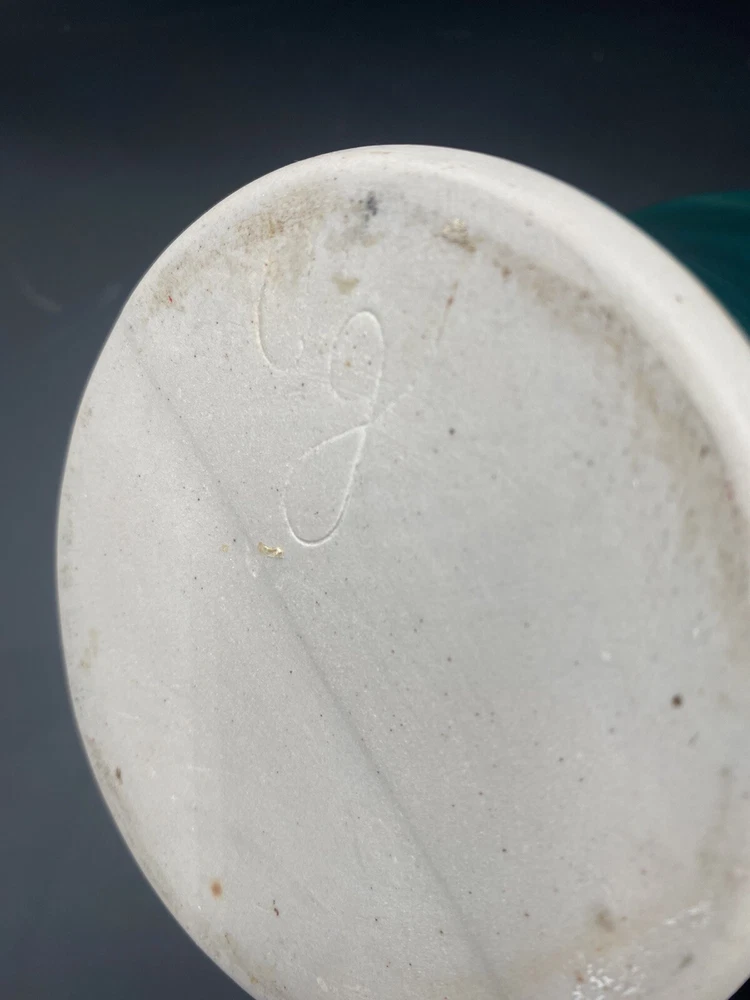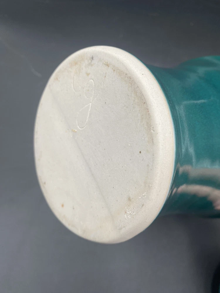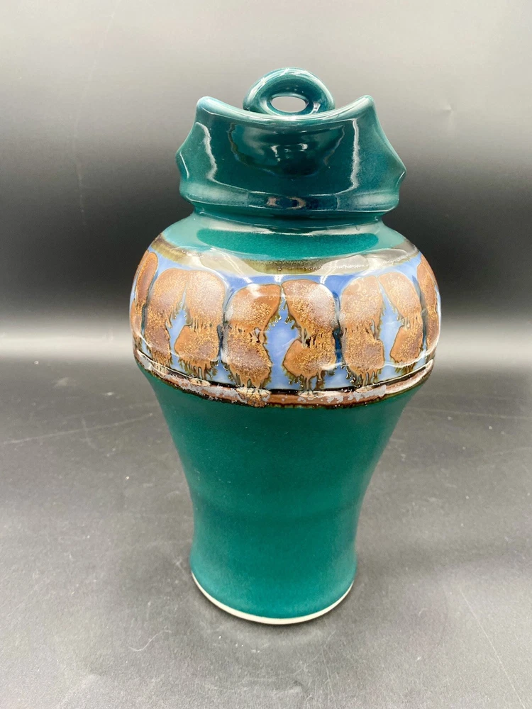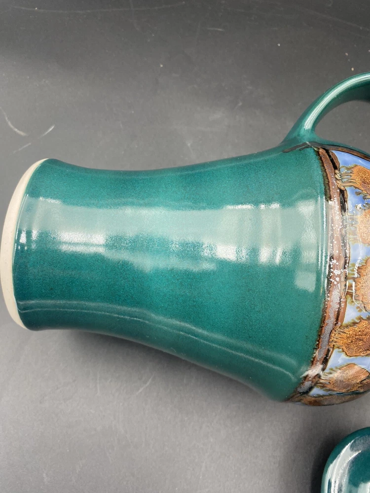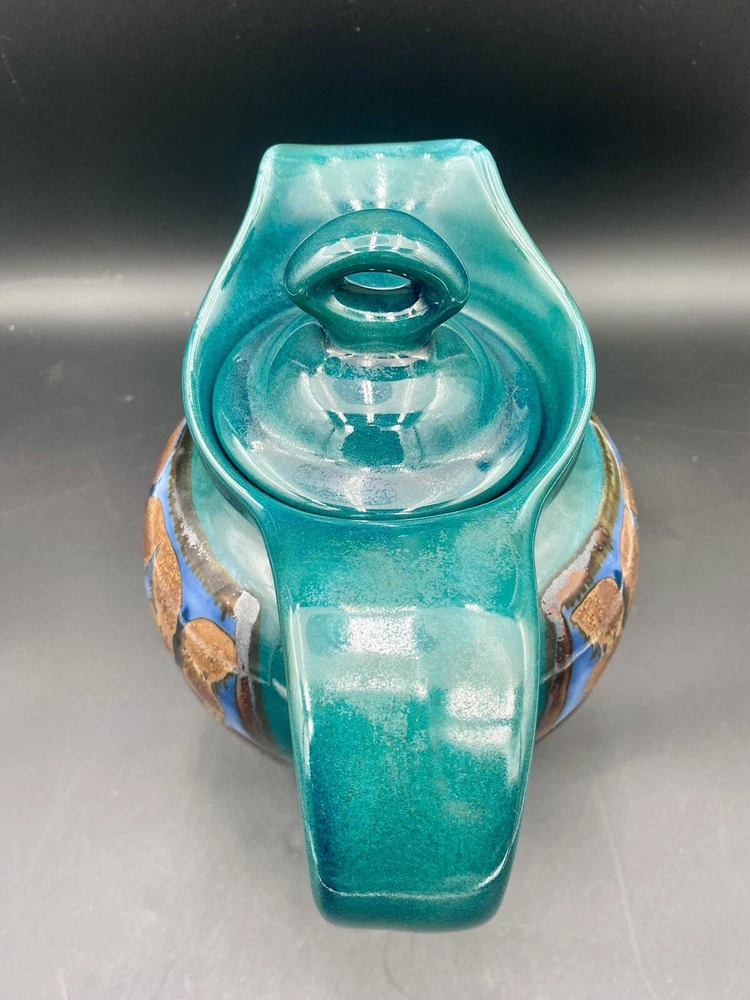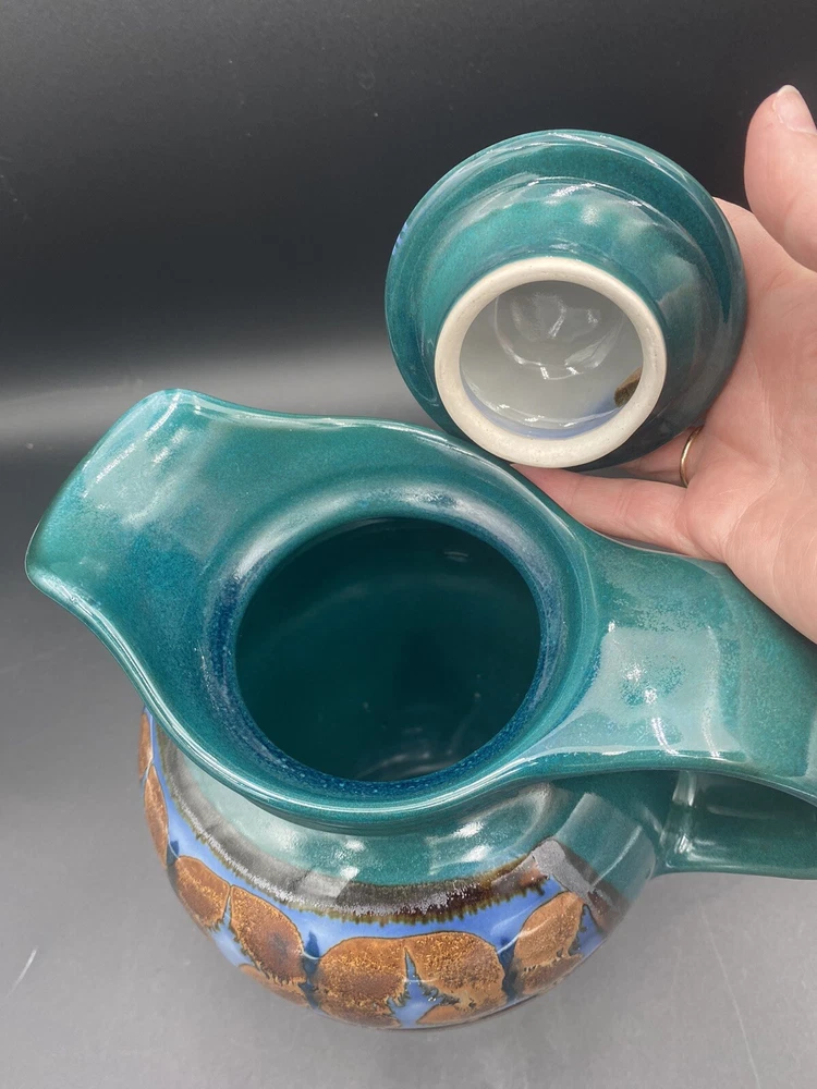This large handmade teal green stoneware pitcher with lid is a beautiful addition to any home decor. Made by Seagrove Pottery in North Carolina, this pitcher features a ring of copper & brown drip glaze butterflies against an opalescent deep sky blue background. The ring is framed with copper, black and silver. The looped lid adds a unique touch to this original piece and seals the pitcher well. It measures 12 inches in height, 9 inches in width, and 9 inches in depth with a diameter of 7 inches. Weighing 4 pounds and 11.7 ounces, this art pottery piece is both decorative and functional. Perfect for serving guests or displaying as a centerpiece. The pitcher is in excellent condition. There are no chips, cracks or signs of wear. It is a beautiful piece of art!