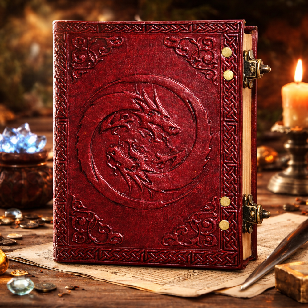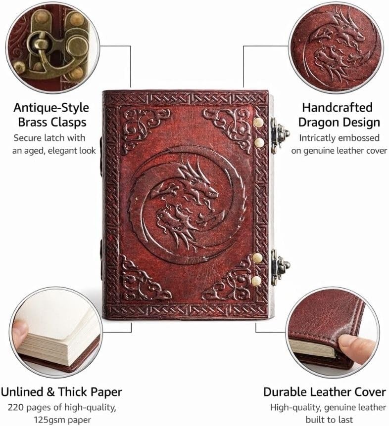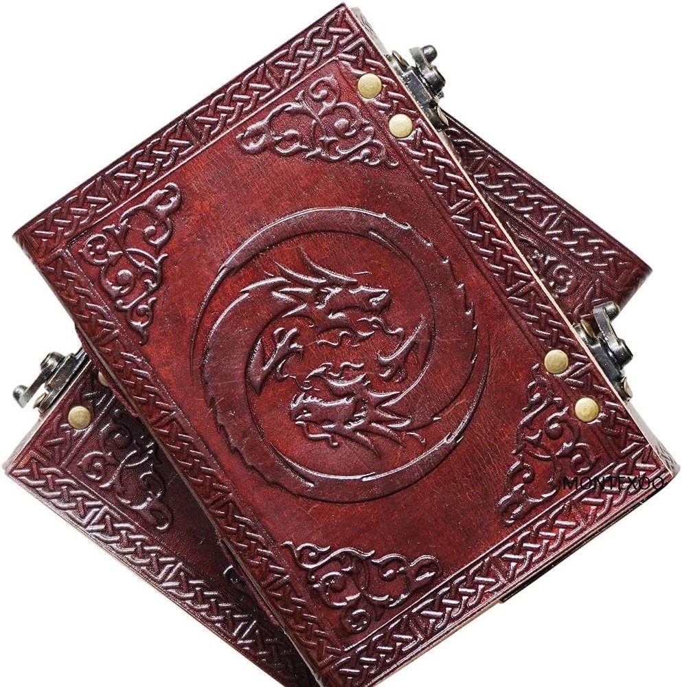 Unleash your creativity with this Handmade Leather Journal – Dragon Embossed Vintage Notebook Diary (7"x5") . Expertly crafted from genuine leather, this journal features a striking embossed dragon design that gives it a timeless, mystical appeal. The rustic finish and artisanal detailing make each piece unique. Designed for writers, artists, travelers, and dreamers, this compact journal is perfect for daily journaling, sketching, note-taking, or capturing ideas on the go. The smooth, unlined pages offer complete freedom for writing or drawing, while the durable leather cover ensures long-lasting use. Whether for personal use or as a thoughtful gift, this vintage leather diary is a stylish companion for creativity and self-expression. Key Features ✔ Premium Genuine Leather – Durable, soft, and naturally aged look ✔ Dragon Embossed Cover – Intricate design with a vintage aesthetic ✔ Perfect Size (7"x5") – Portable and travel-friendly ✔ 200 Unlined Pages – Ideal for writing, sketching & doodling ✔ Handmade Craftsmanship – Each journal is unique ✔ Multipurpose Use – Diary, notebook, sketchbook, planner ✔ Great Gift Idea – Perfect for students, writers, artists & creatives ✔ Vintage Rustic Style – Classic old-world charm