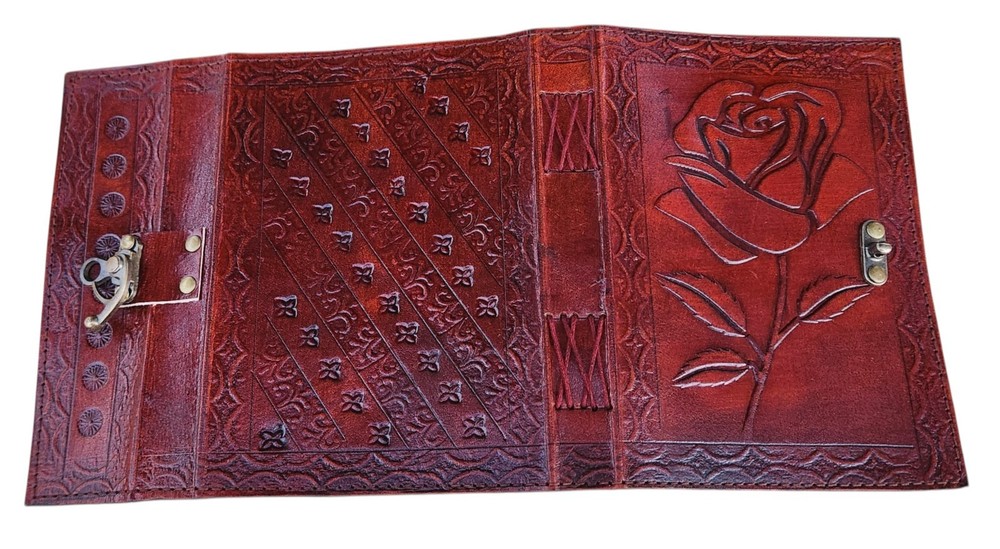 Experience the Art of Writing with Our Hand-Embossed Rose Leather Journal Capture your thoughts, sketches, and secrets in a journal that feels like a piece of history. This is not just a notebook; it is a handcrafted heirloom designed for poets, travelers, and dreamers. Why This Journal Stands Out: Exquisite Rose Artistry: The front cover features a deeply embossed, detailed rose, symbolizing beauty and timelessness. Premium Genuine Leather: Crafted from high-quality, supple leather with a rich vintage patina that smells authentic and gets better with age. Secure Vintage C-Clasp: Keep your private thoughts safe with the antique brass C-hook lock, adding a rustic, medieval charm. Hand-Stitched Durability: The spine is expertly hand-stitched to ensure pages never fall out, allowing the journal to lay flat for easy writing. Eco-Friendly Paper: Contains thick, cream-colored unlined pages that prevent ink bleed-through. Perfect for fountain pens, charcoal, or even watercolors. Perfect For: Daily Gratitude & Bullet Journaling Travel Adventures & Sketching A Unique Gift for Birthdays, Anniversaries, or Graduations Dimensions: [ 7 x 5 x 3 inches] Page Count: [ 200 Pages / 100 Sheets]
