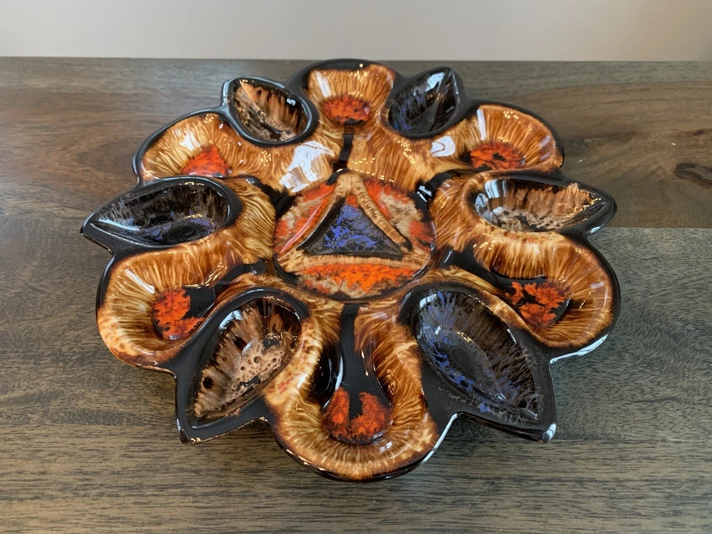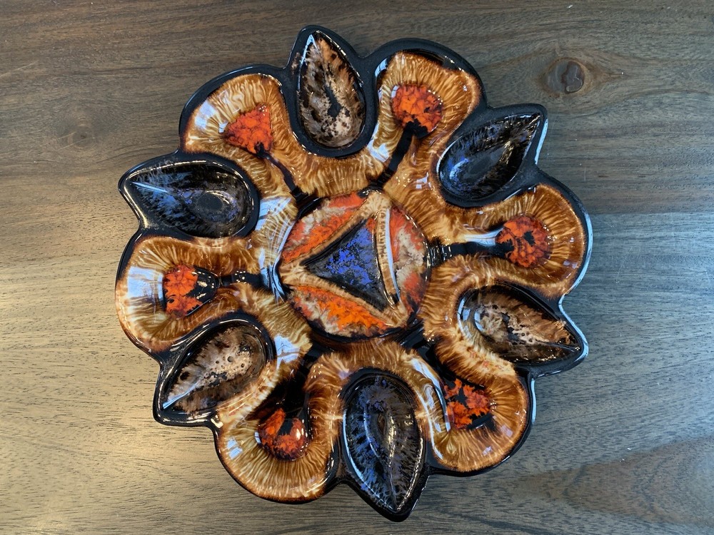 Original handmade decorative plate featuring stunning rich colors. In good condition, shows normal wear consistent with age and use like chips on the rim as depicted in the pictures. Please refer to the pictures as they’re part of the description. Measurements: - Length: 22.5 cm - height: 3.3 cm - width: 21.8 cm - weight: 600 g