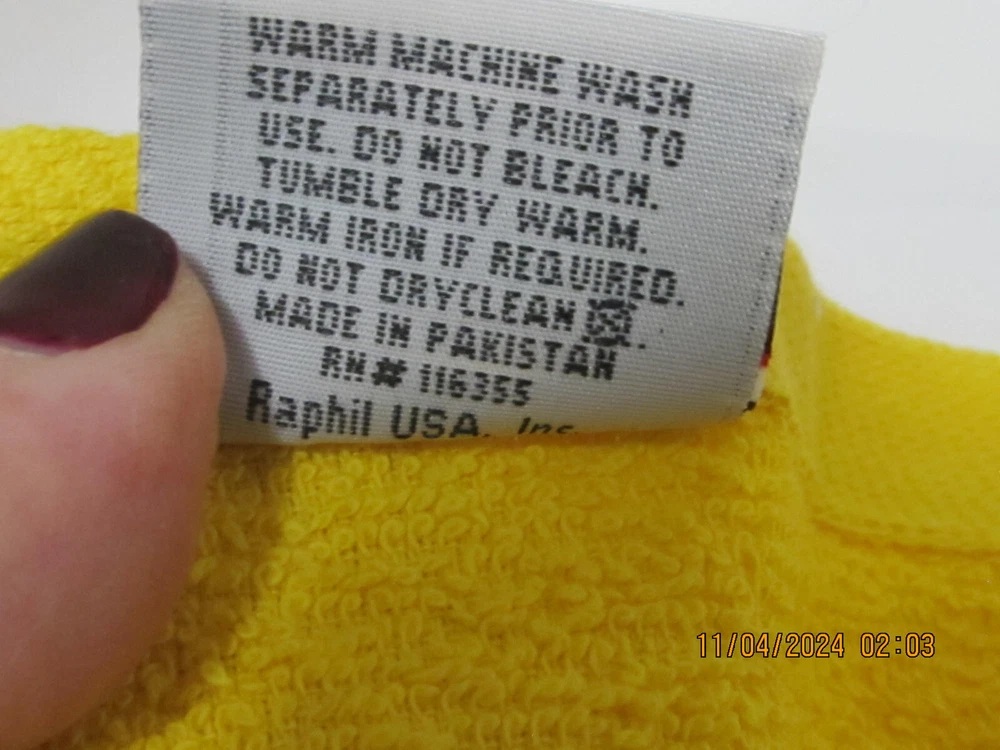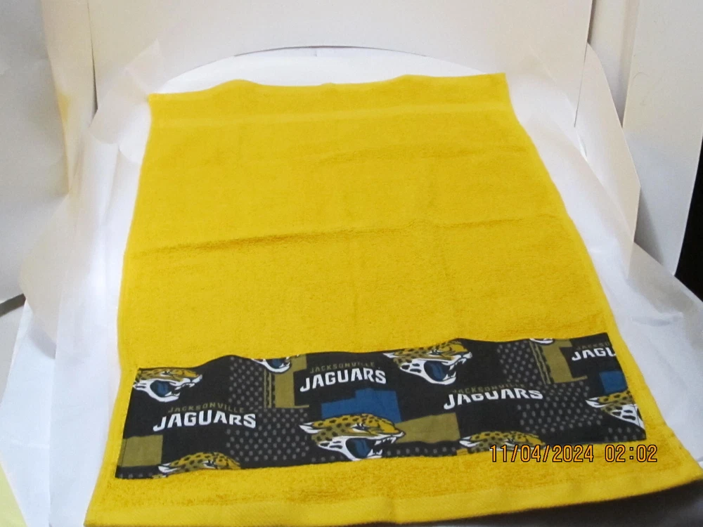 This is not a licensed NFL product. It is however, hand-crafted from licensed NFL fabric. I am not affiliated with or sponsored by the NFL. Tabberone.com Towel Hub towel measures approximately 16 1/4" x 25 1/2" Fabric on towel measures approximately 5" L x 15" W These towels are perfect for the gym, kitchen, spa, and the bath New fast drying towels Towels are made and imported from Pakistan Wash before using. Machine wash in cold water. Wash with like colors. Use non-chlorine bleach when needed. Tumble dry low. Handmade and sewn with love in the USA by Diane Handmade items, not licensed by the owners of the characters depicted. Team fabric is 100% Cotton First Quality Fabric Limited quantities Made in a smoke free home This is not a licensed NFL product. It is however, hand-crafted from licensed NFL fabric. I am not affiliated with or sponsored by the NFL. Tabberone.com