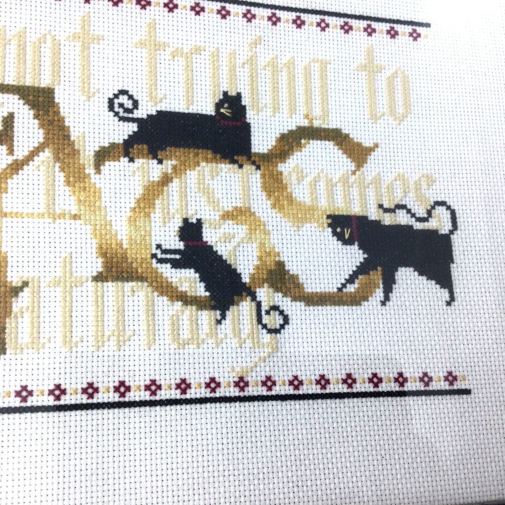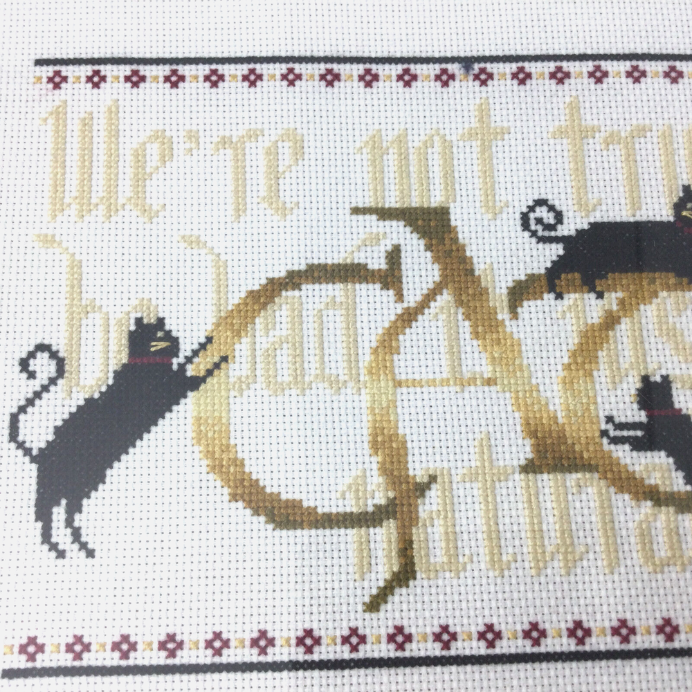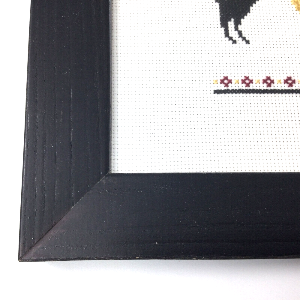 Needlepoint Picture Quote Black Cats Playing Wooden Frame 14" x 10". Image size 7 3/8" x 11 3/8". Frame 1 2/8" wide. Very good condition, no damage. InvN/GS/4