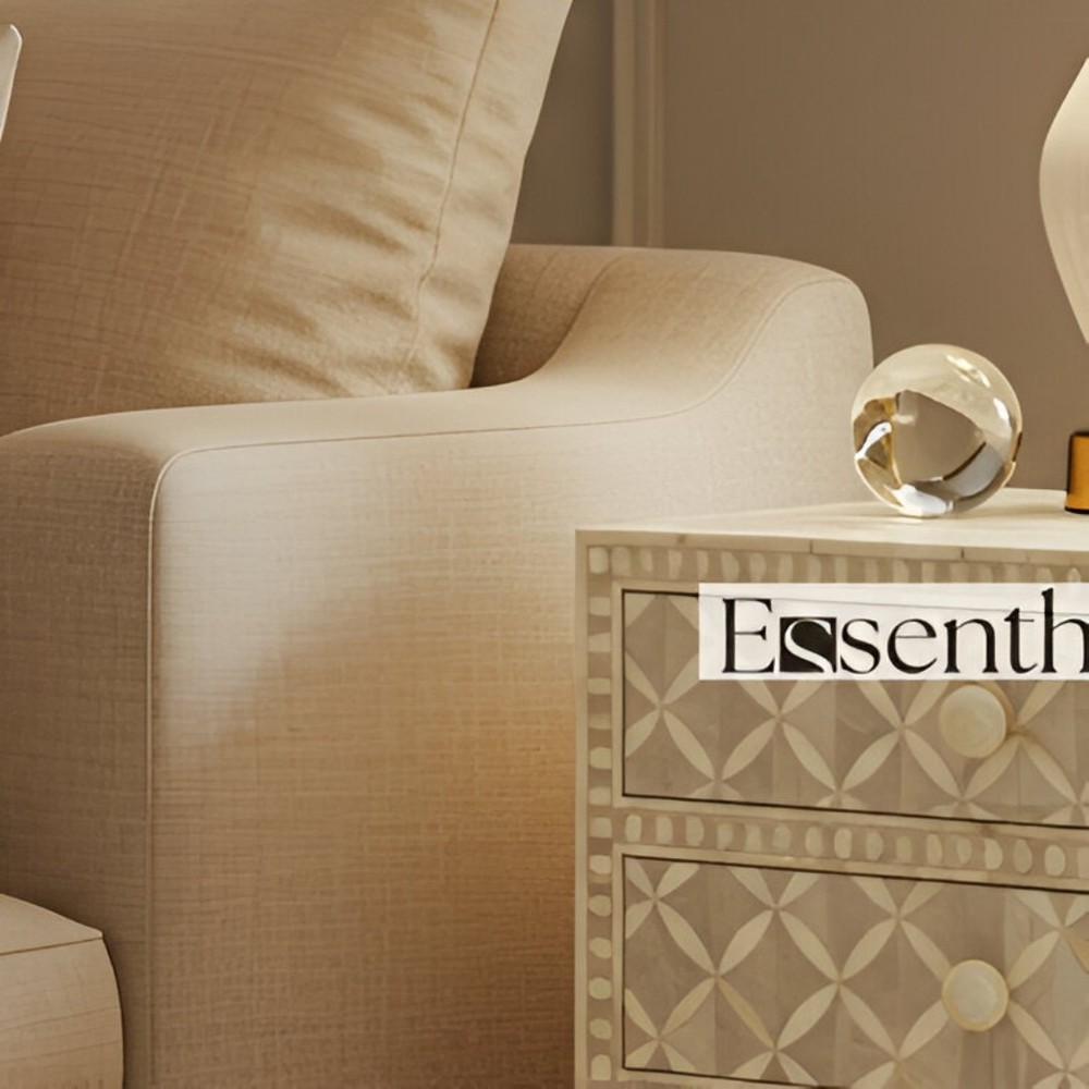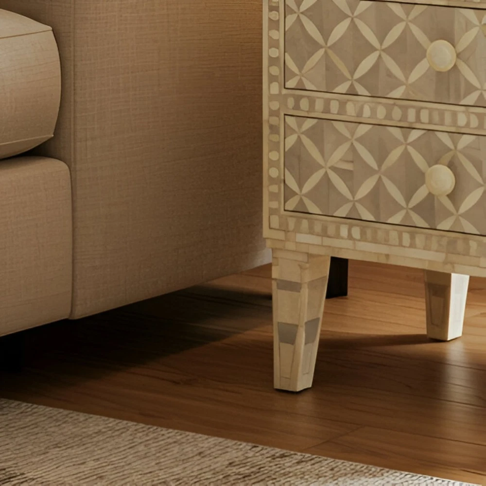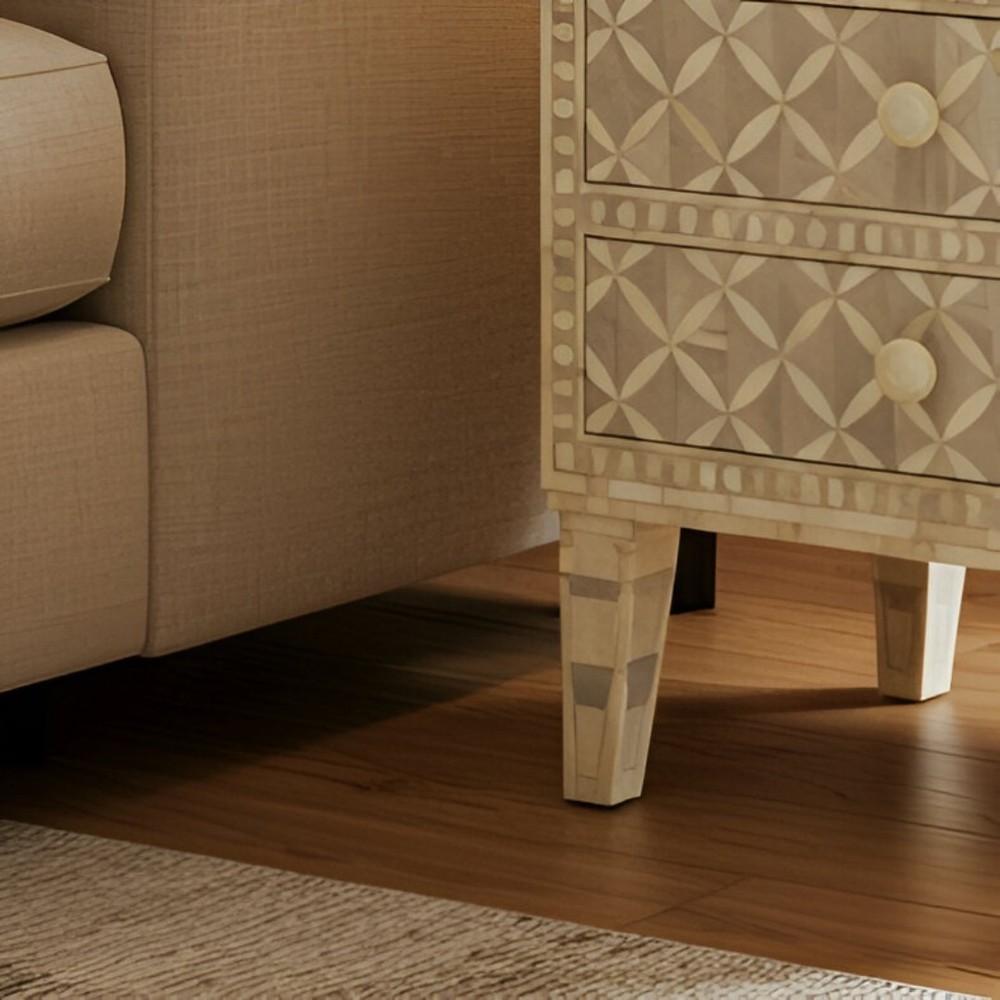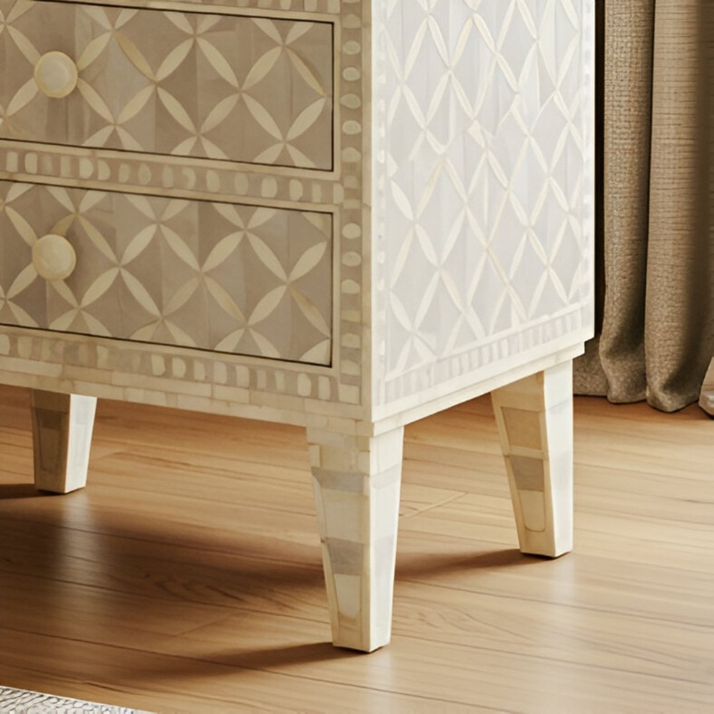 Modern Geometry Meets Artisan Craft This elegant Cream Bone Inlay Cabinet with three drawers features a refined geometric pattern that blends traditional craftsmanship with modern design. Each motif is hand-inlaid using ethically sourced camel bone set against a soft off-white resin base—creating a subtle, dimensional texture perfect for neutral, luxe, or minimalist interiors. Designed and handcrafted by artisans in Rajasthan, India, this piece is both decorative and functional. The three drawers offer practical storage for living rooms, bedrooms, or entryways—ideal for stowing essentials without sacrificing style. Its clean silhouette, delicate tones, and handcrafted appeal make this cabinet a versatile accent piece for any room in your home.