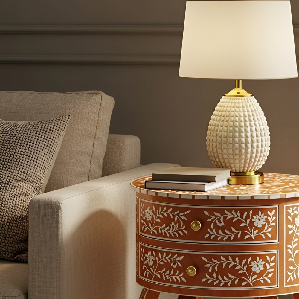 Elevate your décor with this stunning Handmade Bone Inlay End Table , a true work of art that brings timeless elegance to any room. Crafted in rich red with intricate ivory floral inlay, this round table showcases traditional Indian craftsmanship at its finest. The table features a compact round shape supported by elegantly curved legs , adding a graceful and classic look to your space. With two spacious drawers , it offers both style and functionality—perfect for keeping essentials neatly tucked away in your living room, bedroom, or hallway. Each piece is handmade using ethically sourced bone and resin, making every table one-of-a-kind. Whether used as a side table , nightstand , or entryway accent , this table adds a refined boho-luxury feel to your interiors.